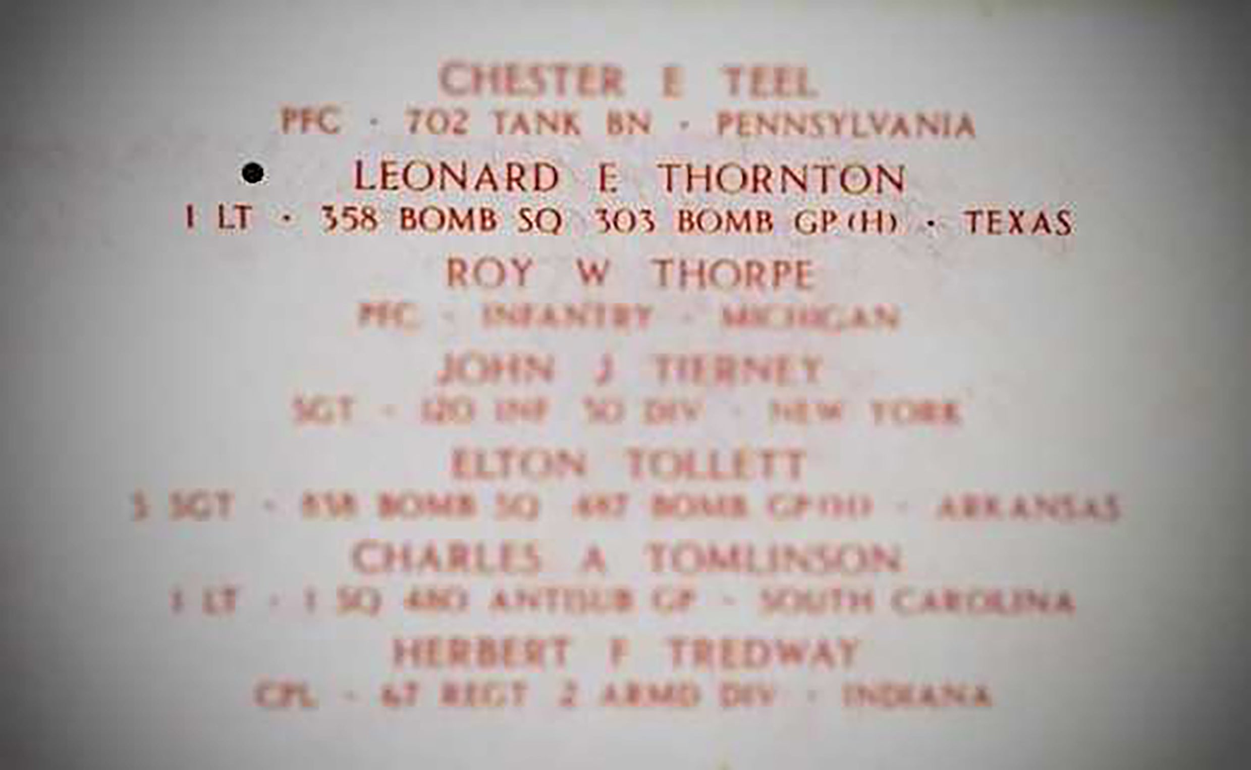 While Thornton is not mentioned in the above report, he was recorded as Missing In Action and ultimately in the end he was presumed and listed as Killed in Action. While his remains were never recovered, he is honored on the Tablets of the Missing at the Brittany American Cemetery and Memorial. The Brittany American Cemetery and Memorial is located in Saint-James, Normandy, France, near the northeastern edge of Brittany. It contains the remains of 4,410 of World War II American soldiers, most of whom died in the Normandy and Brittany campaigns of 1944. Along the retaining wall of the memorial terrace are inscribed the names of 498 of the missing. Rosettes mark the names of soldiers whose remains have been identified.