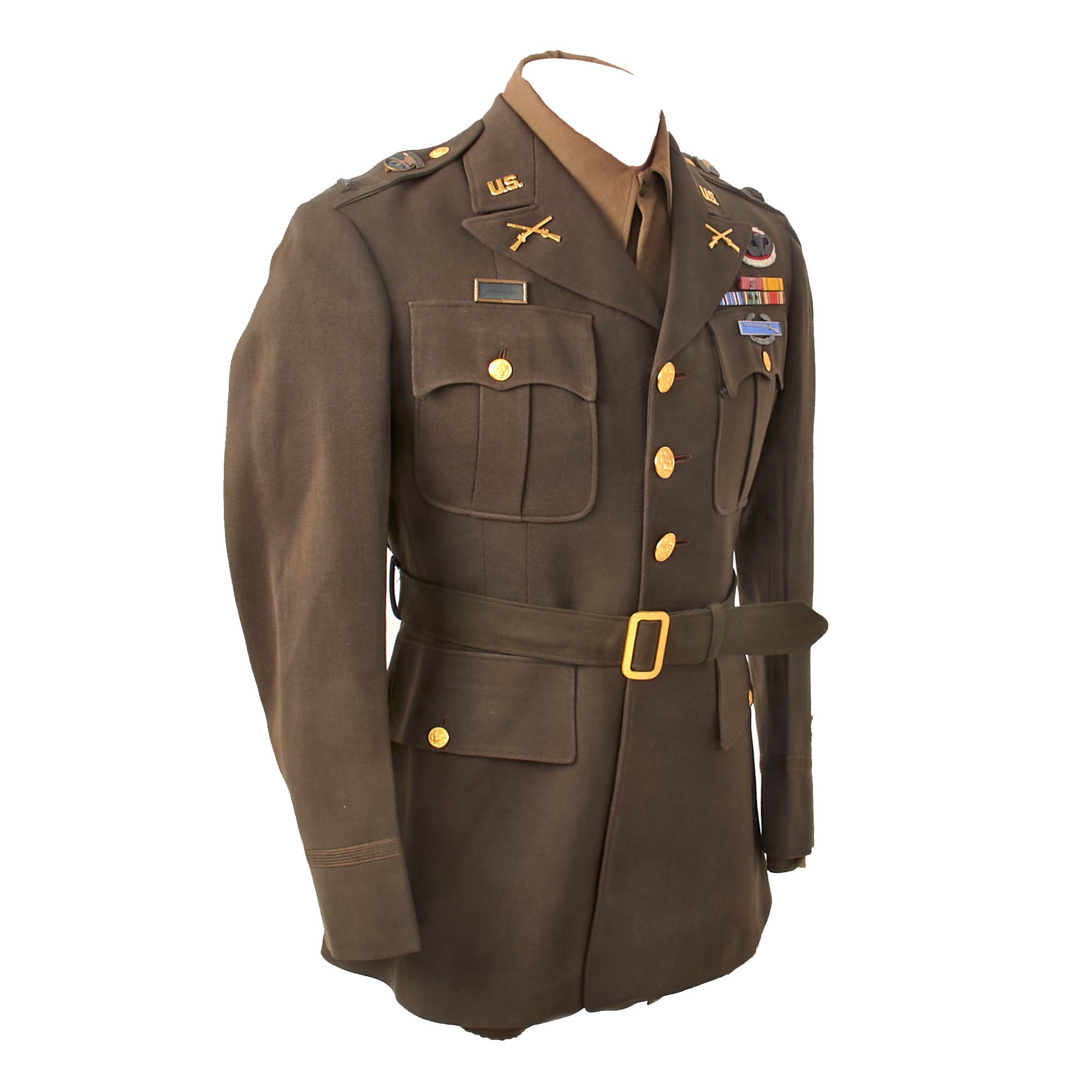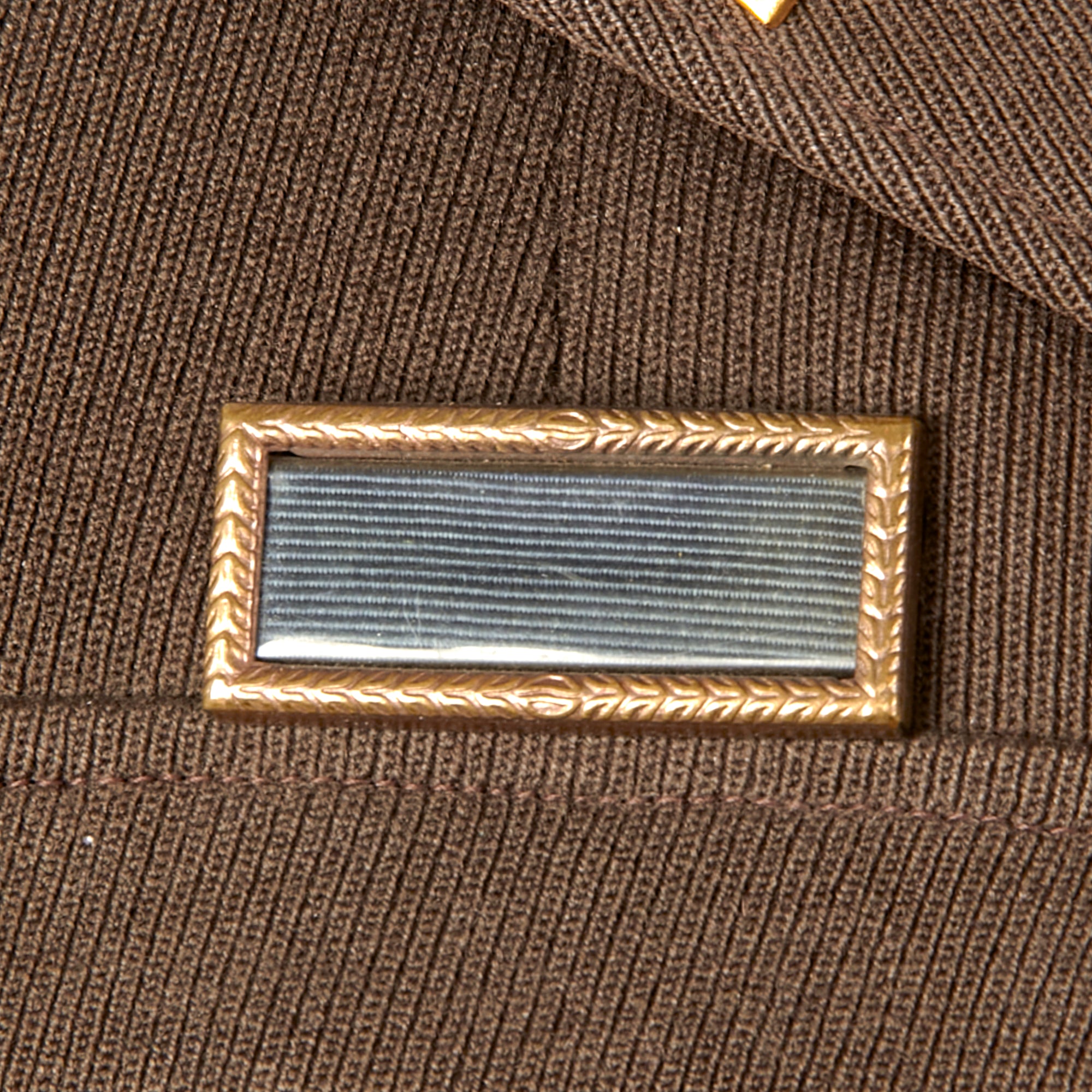 The jacket bears lovely bullion 1st Lieutenant ranks on the shoulder boards with 17th Airborne enamel Distinguished Insignia pinned above them. There is a 17th Airborne patch & rocker on the left shoulder, with two overseas stripes on the left cuff. There are US & Infantry collar insignia, and a Presidential Unit Citation with frame over the right breast pocket. On the left breast pocket is a Sterling Combat Infantryman Badge, and above the pocket is a five-place ribbon bar with the Bronze Star with OLC, the American Defense Medal, the American Campaign Medal, the European-African-Middle Eastern Campaign medal with two campaign stars, and the WWII Victory Medal. The top two ribbons have a long pin, while the lower three have later butterfly pins. Above this is an 11th Airborne Command oval with Sterling Paratrooper wings pinned over them. This doesn’t appear correct as the 11th and 17th Airborne Divisions were in different theaters.