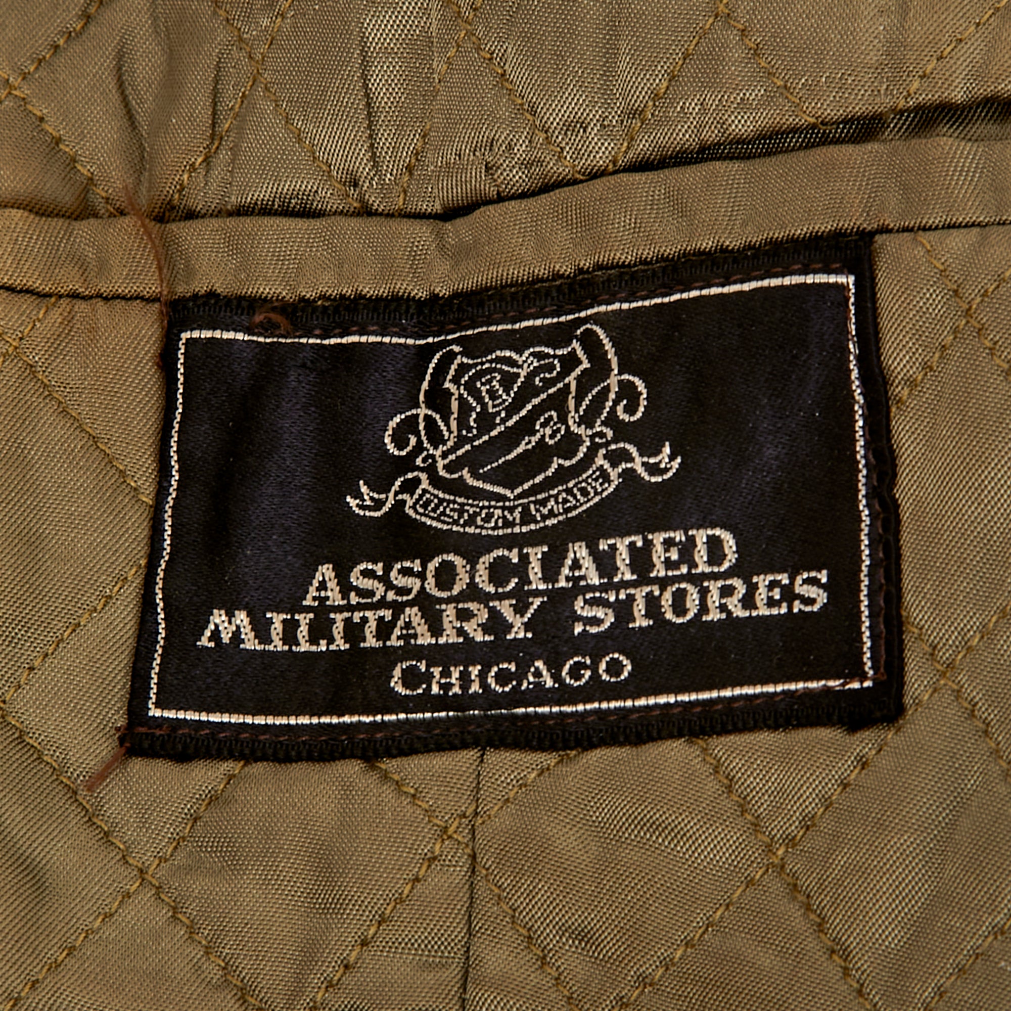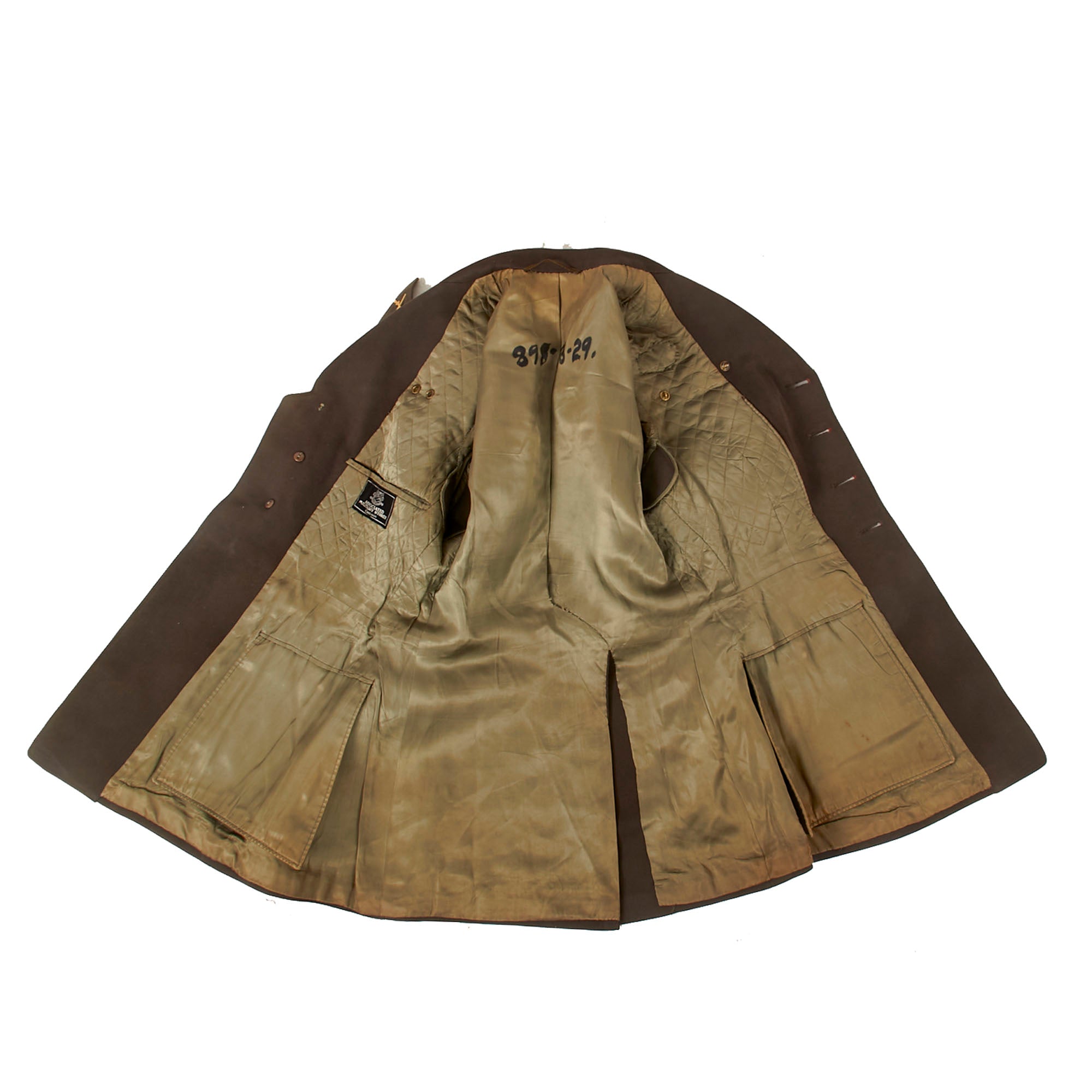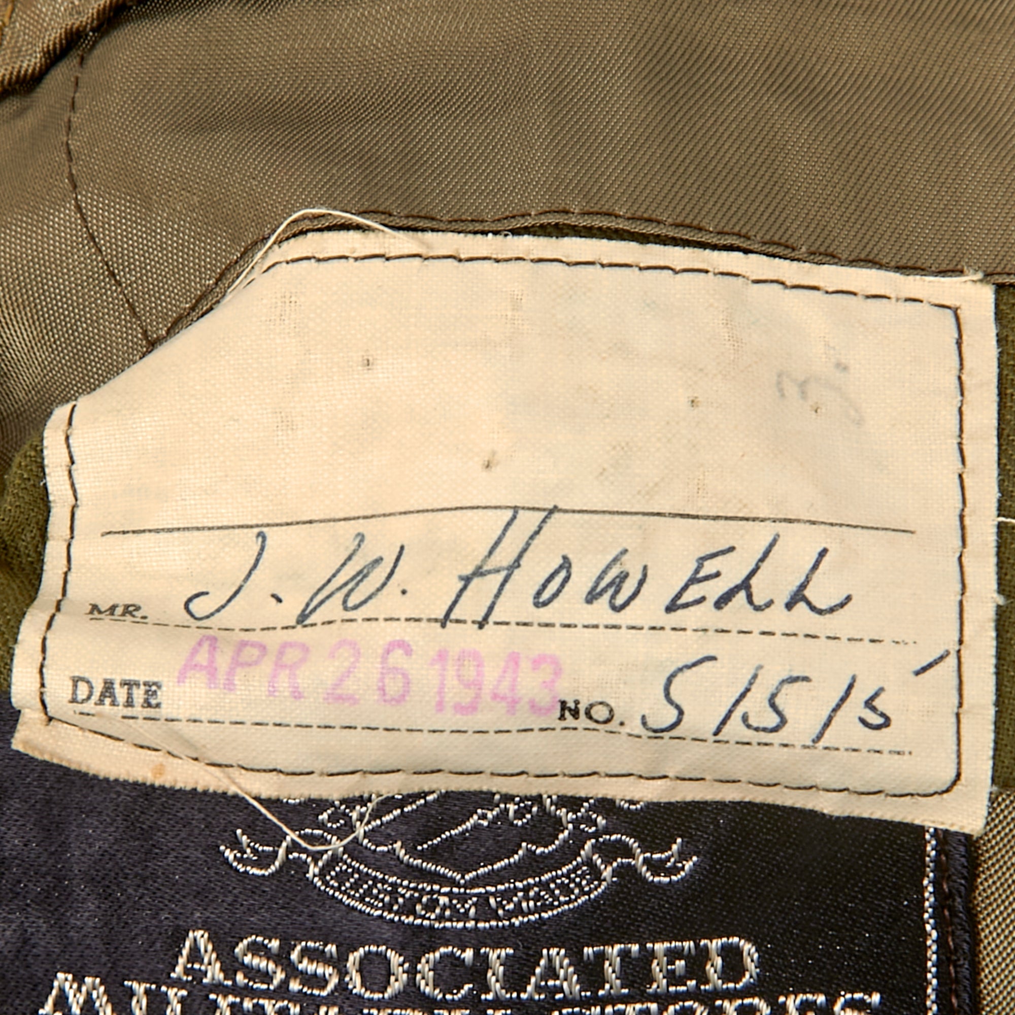 Interestingly, the button-holes on the front are stitched with red string. The interior shows the quality of the uniform, with a tag on the interior pocket for the Associated Military Stores of Chicago. In the pocket is a name tag for J.W. Howell, dated April 26th, 1943.