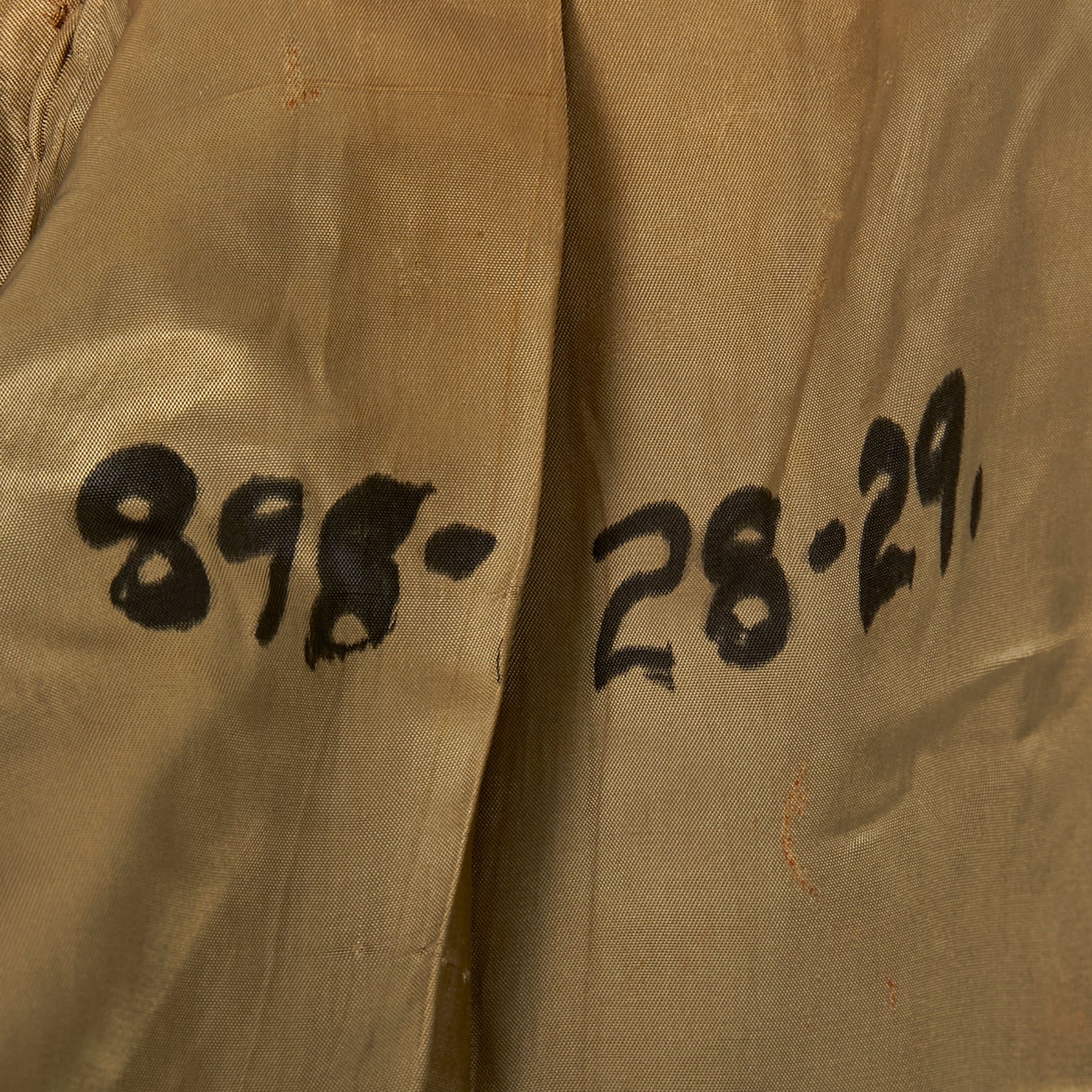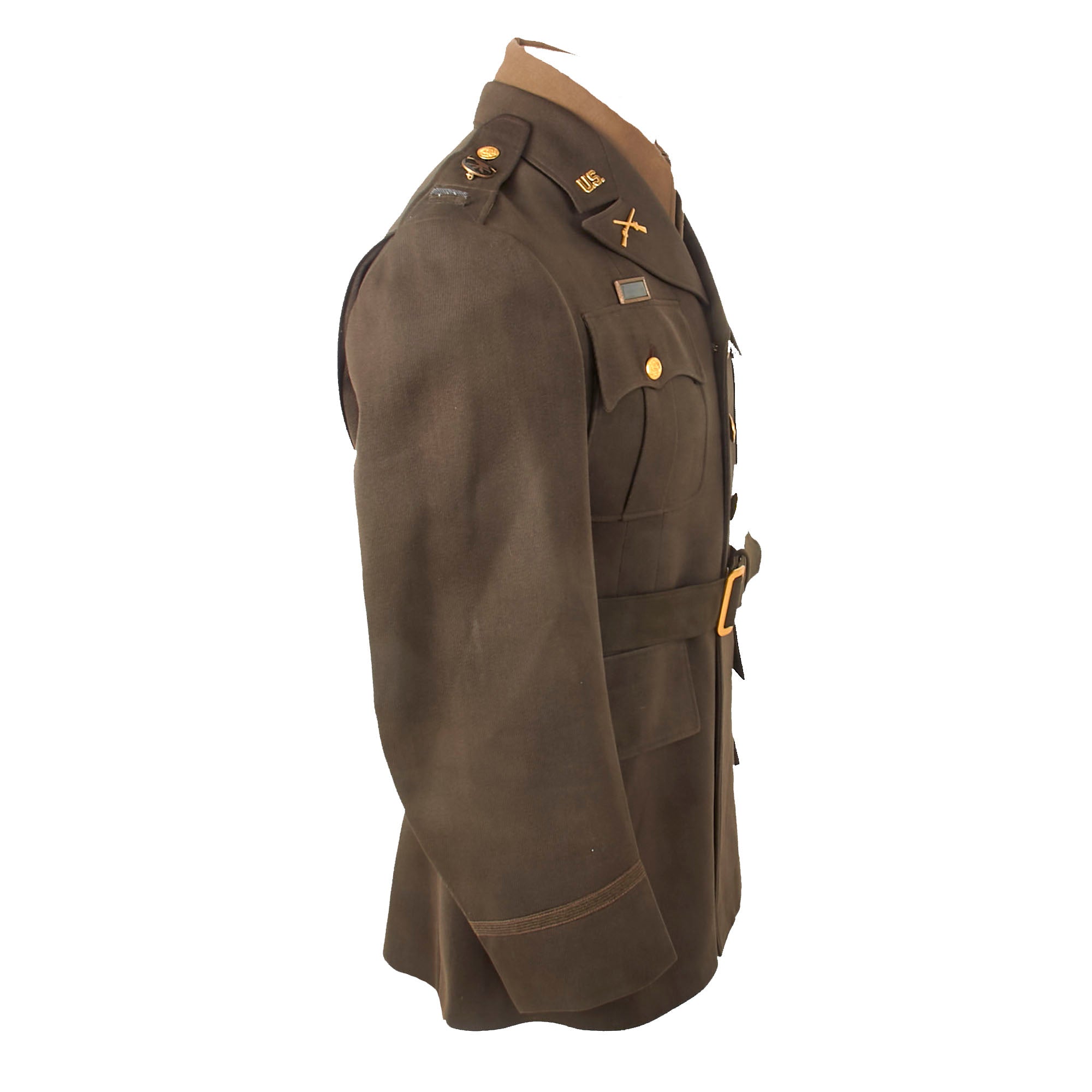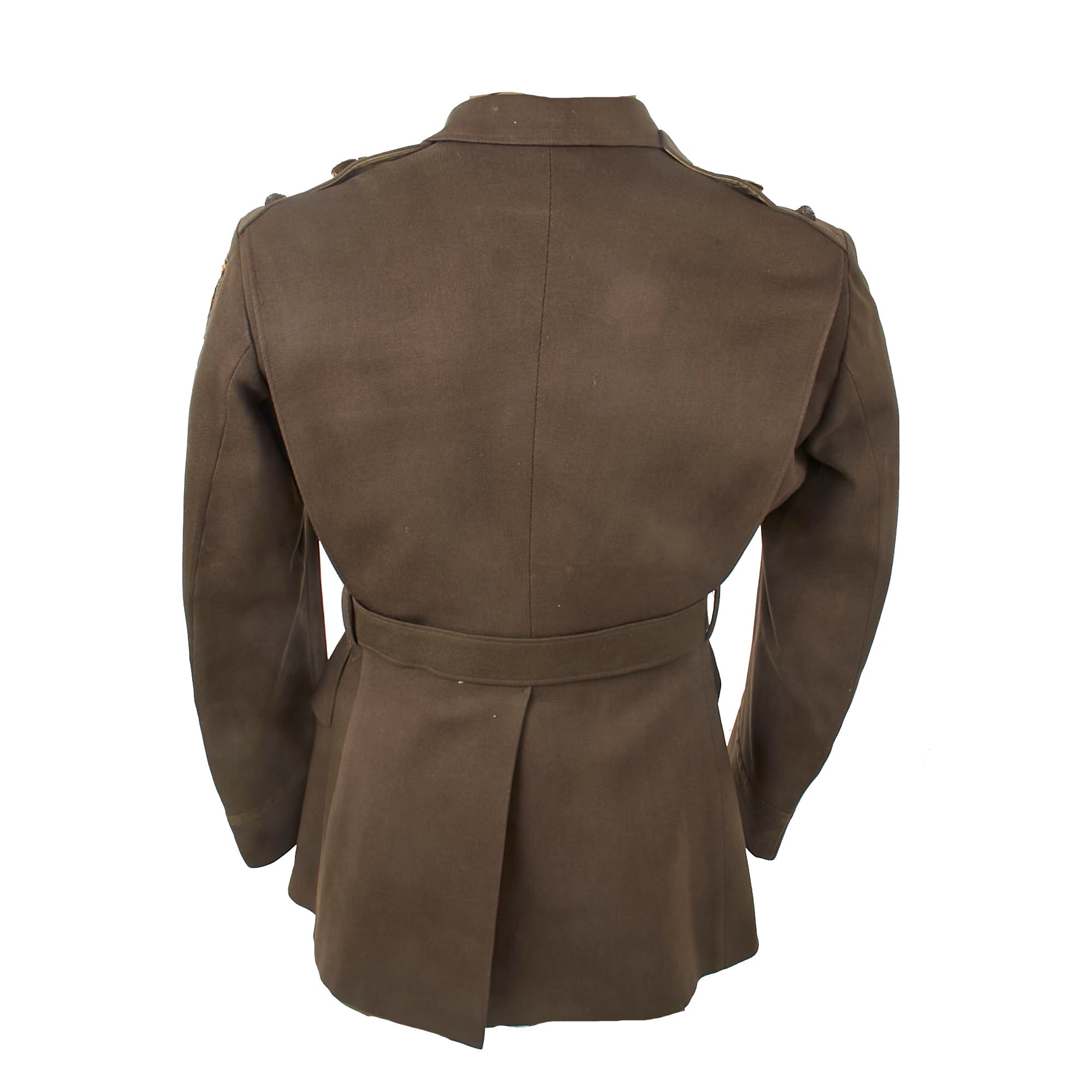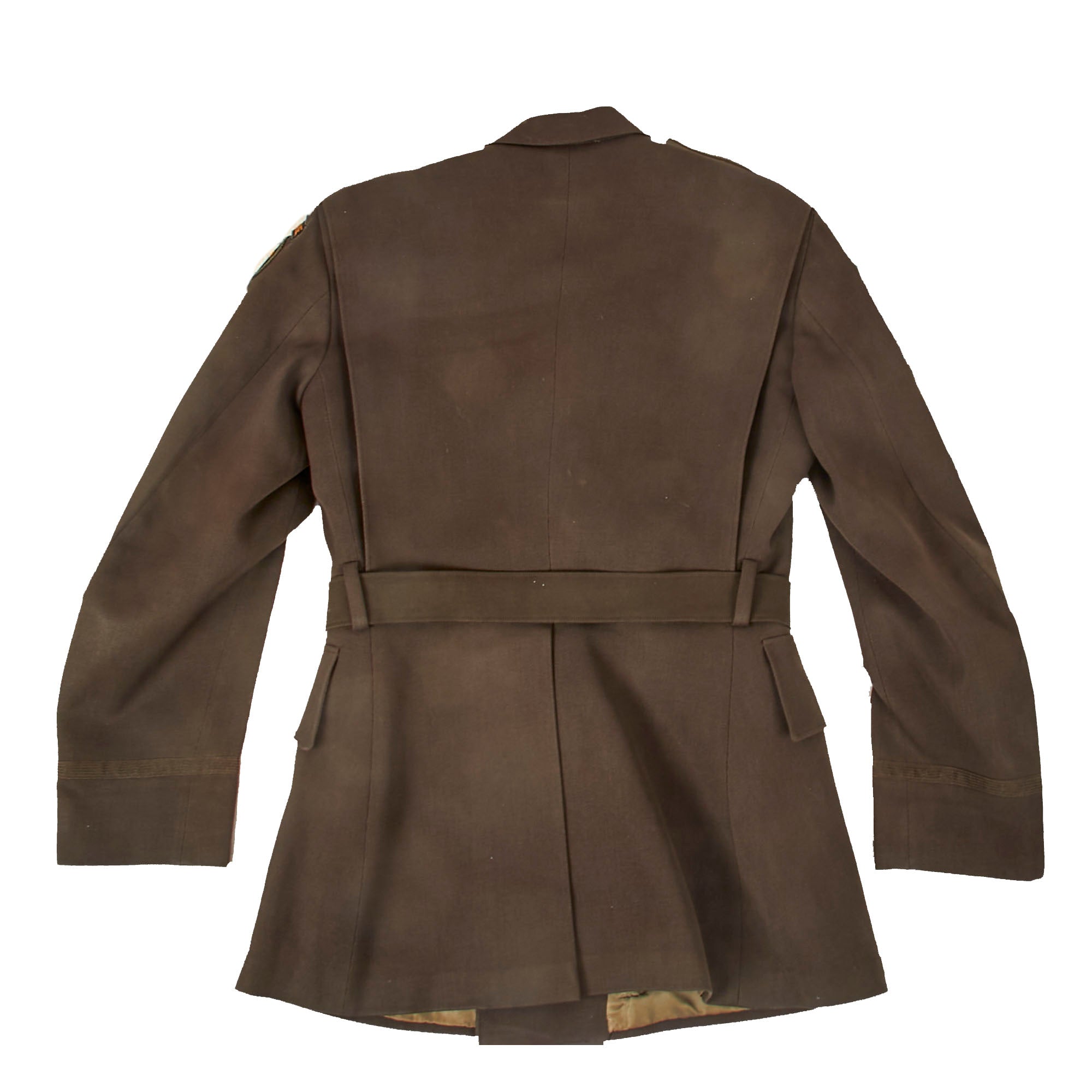 Interestingly, the button-holes on the front are stitched with red string. The interior shows the quality of the uniform, with a tag on the interior pocket for the Associated Military Stores of Chicago. In the pocket is a name tag for J.W. Howell, dated April 26th, 1943.