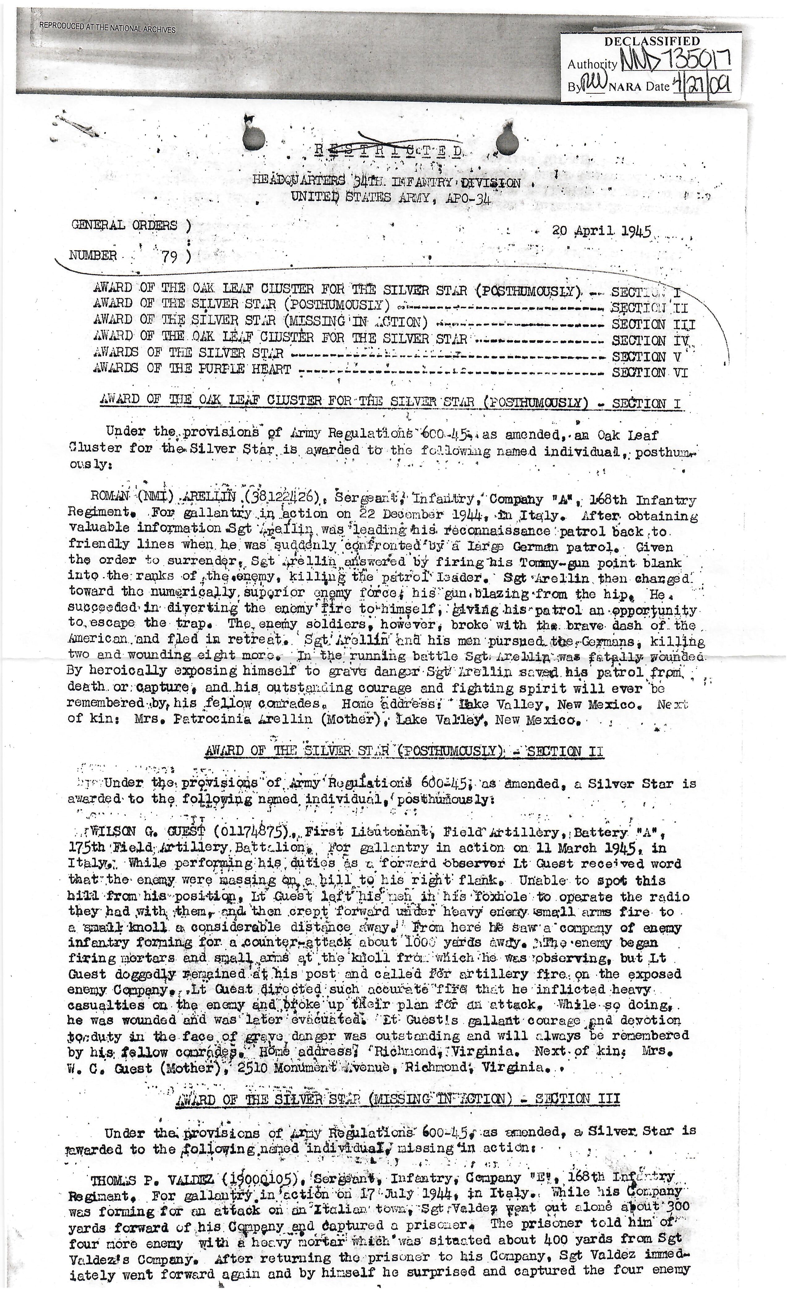 - Documents: The documents include an original Silver Star citation, original typed letters and a copy of the General Orders which shows his Silver Star citation and other soldiers’ awards.