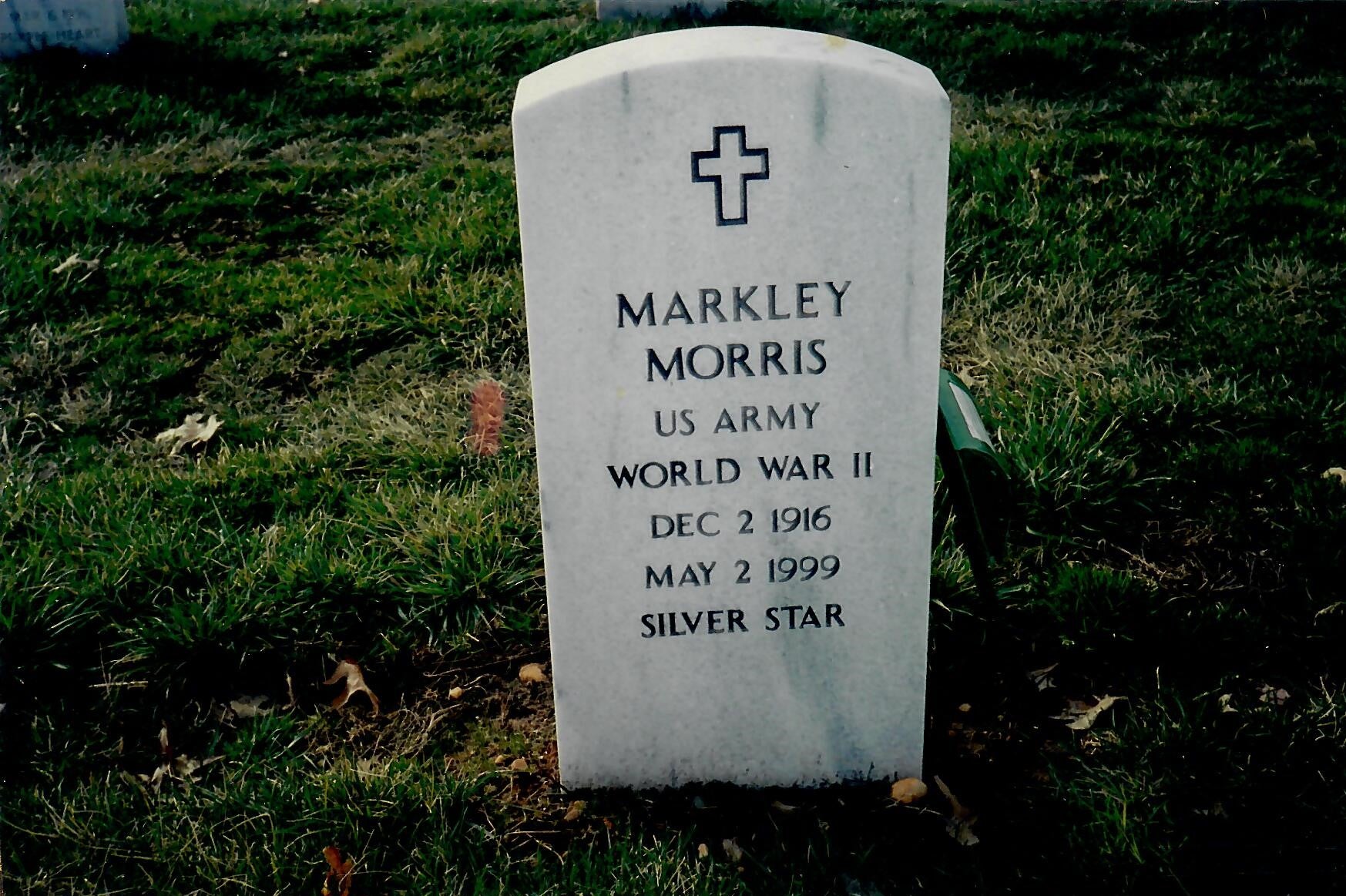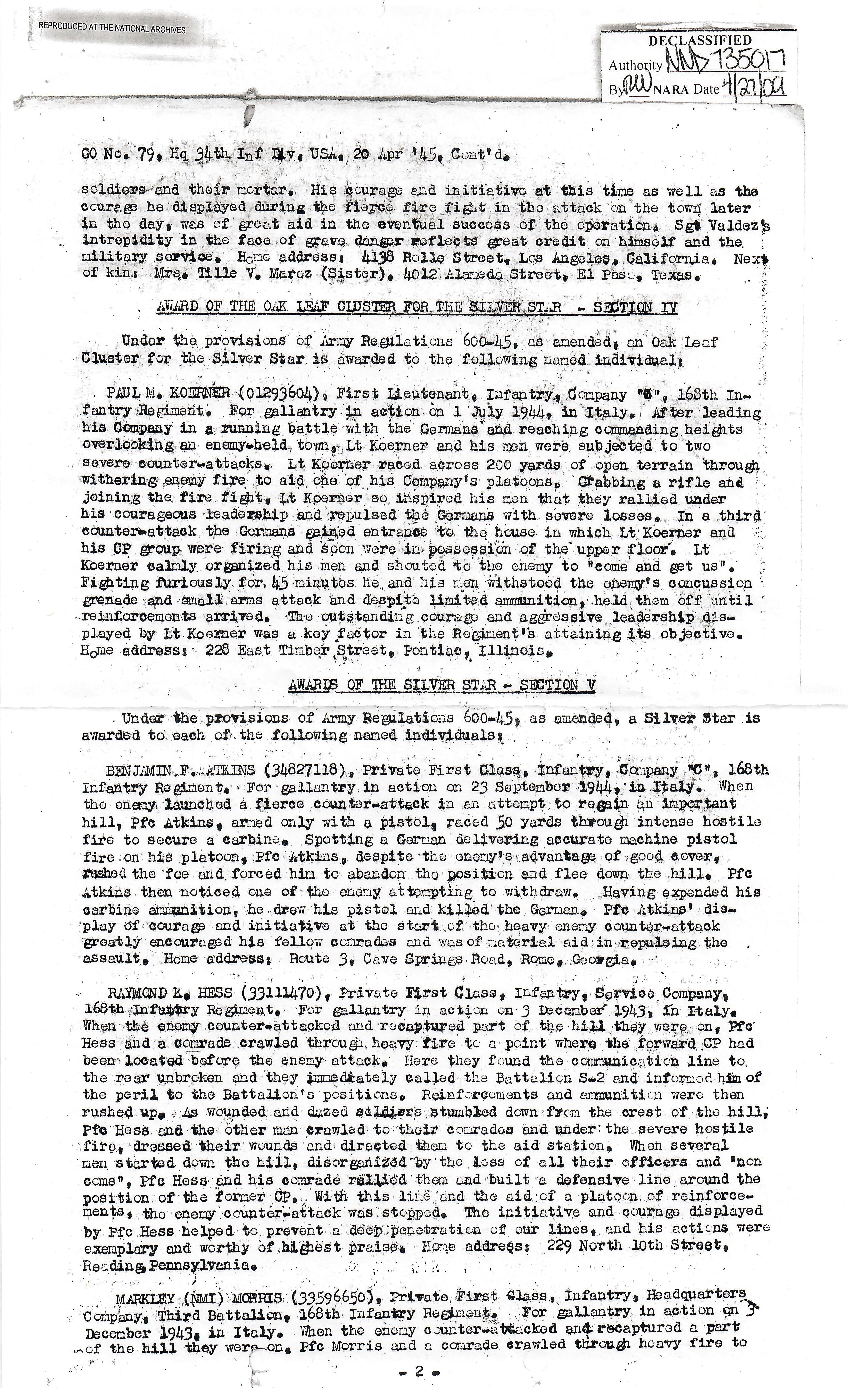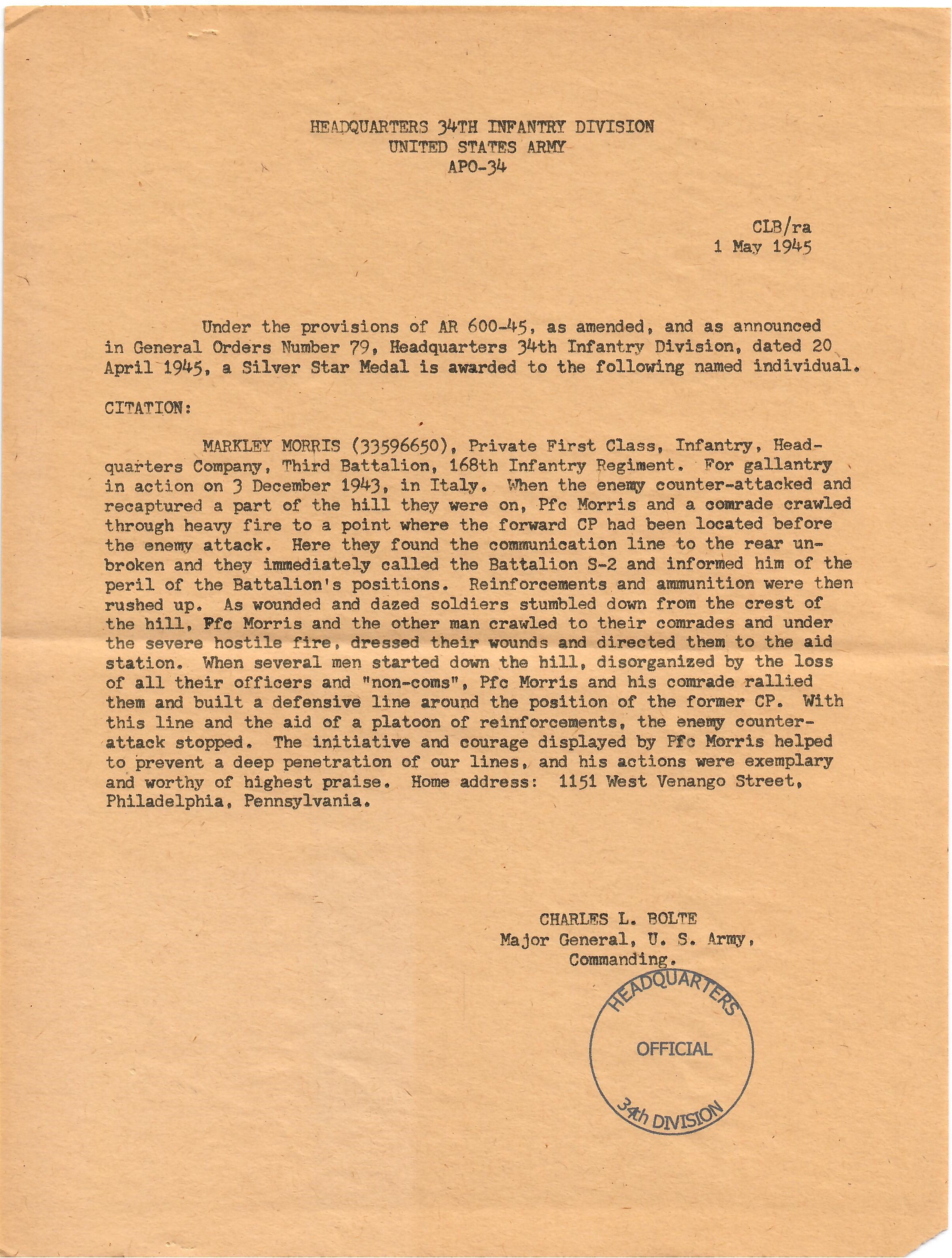 The Silver Star was presented to Private First Class Markley Morris (ASN: 33596650), United States Army, for gallantry in action while serving with Headquarters Company, 3d Battalion, 168th Infantry Regiment, 34th Infantry Division, in action against the enemy on 3 December 1943, in Italy. When the enemy counter-attacked and re-captured a part of the hill they were on, Private First Class Morris and a comrade crawled through heavy fire to a point where the forward CP had been located before the enemy attack. Here they found the communication line to the rear unbroken and they immediately called the Battalion S-2 and informed him of the peril of the Battalion's positions. Reinforcements and ammunition were then rushed up. As wounded and dazed soldiers stumbled down from the crest of the hill, Private First Class Morris and the other man crawled to their comrades and while under the severe hostile fire, dressed their wounds and directed them to the aid station. When several men started down the hill, disorganized by the loss of all their officers and non-commissioned officers, Private First Class Morris and his comrade rallied them and built a defensive line around the position of the former CP. With this line and the aid of a platoon of reinforcements, the enemy counterattack was stopped. The initiative and courage displayed by Private First Class Morris helped to prevent a deep penetration of friendly lines, and his actions were exemplary and worthy of highest praise.