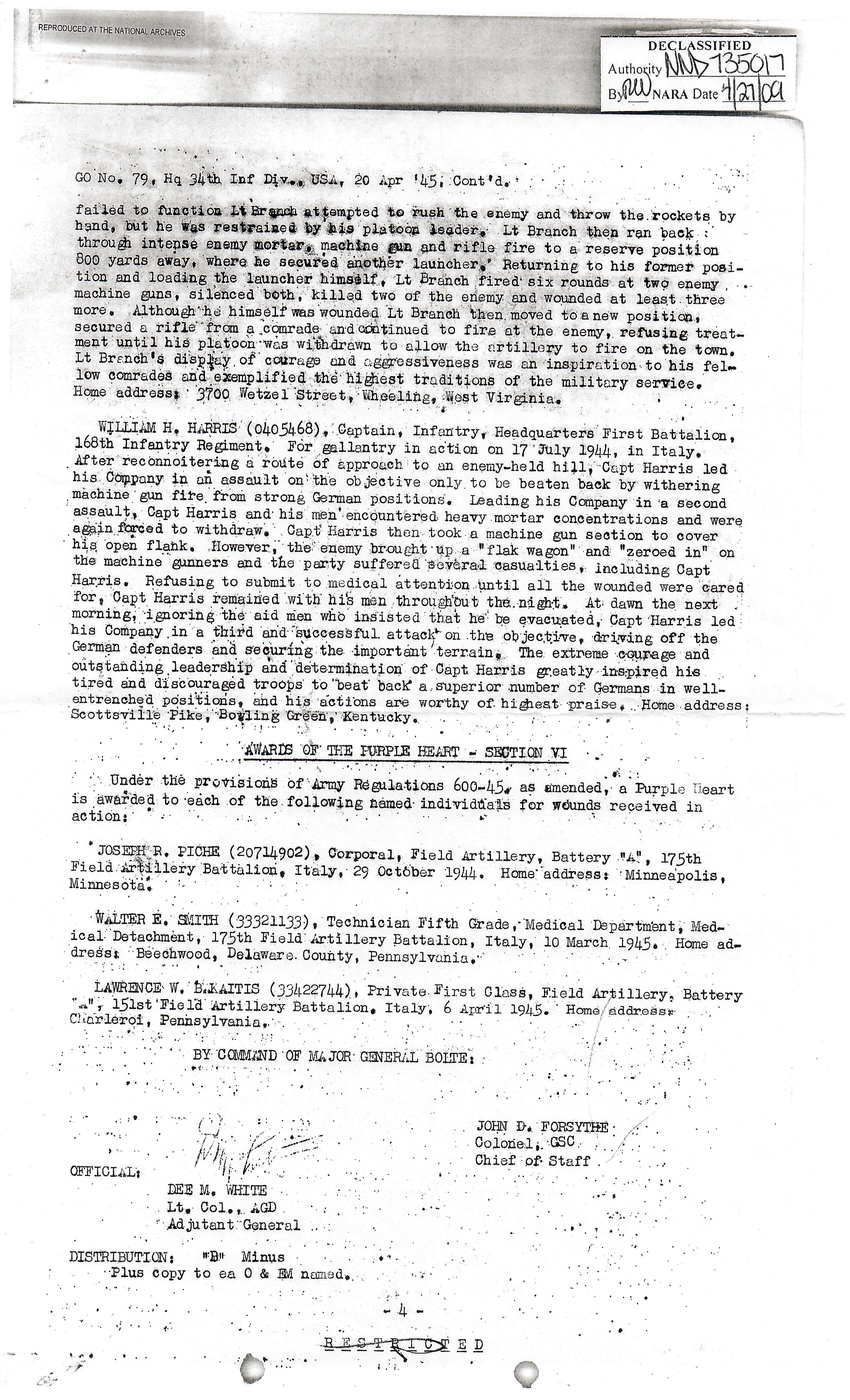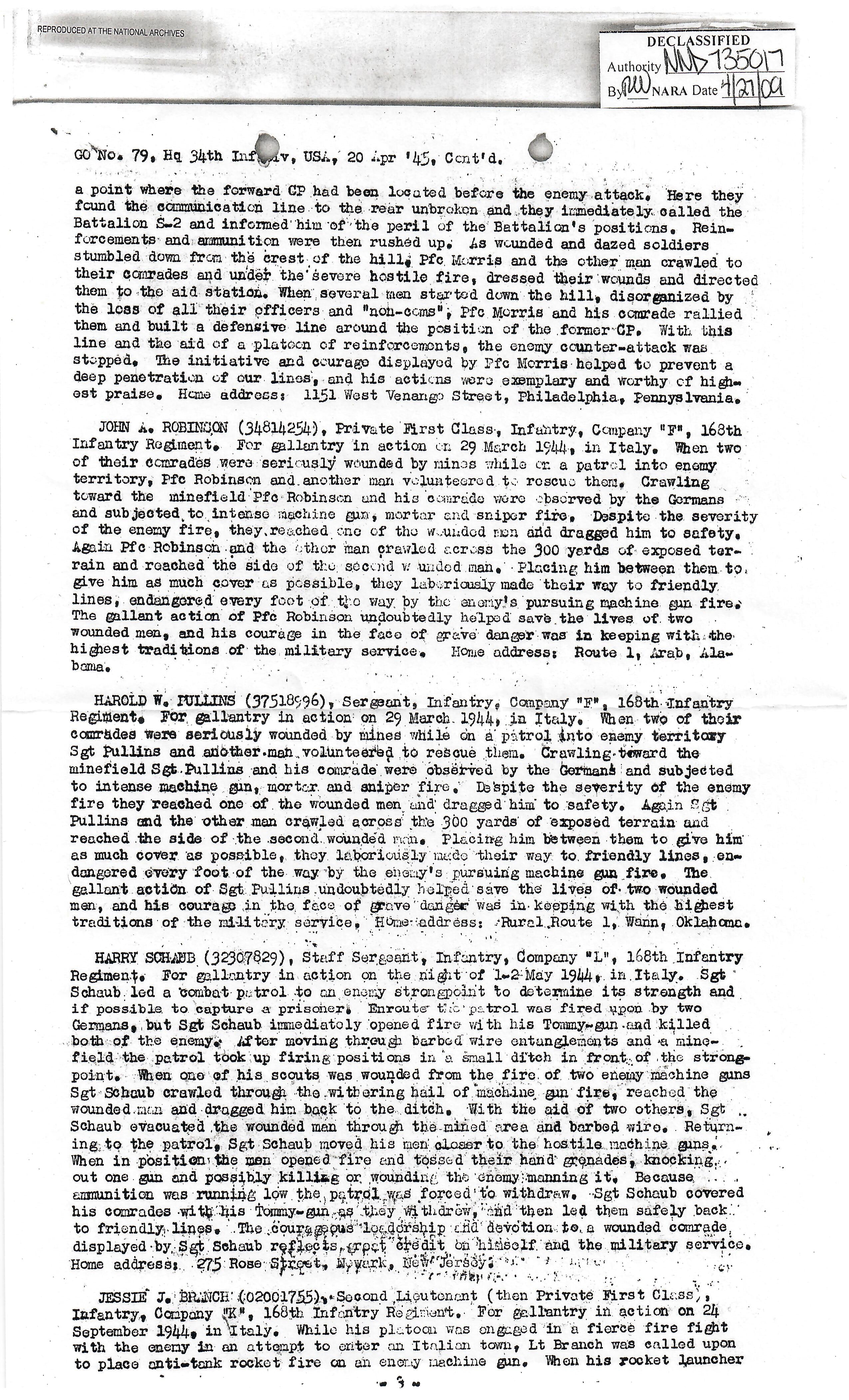 Original Items: Only One Lot of 17 Available. The 34th Infantry Division is an infantry division of the United States Army, part of the National Guard, that participated in World War I, World War II and multiple current conflicts. It was the first American division deployed to Europe in World War II, where it fought with great distinction in the Italian Campaign. This campaign is where Private First Class Markley Morris while with the 3rd Battalion, 34th Infantry Division, conducted himself keeping with the highest traditions of military service and reflecting great credit upon himself and the United States Army.