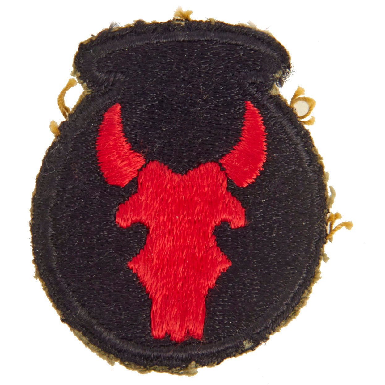 - 34th Infantry Division “Red Bulls” Shoulder Sleeve Insignia: The division takes its name from the shoulder sleeve insignia designed for a 1917 training camp contest by American regionalist artist Marvin Cone, who was then a soldier enlisted in the unit. Cone's design evoked the desert training grounds of Camp Cody, New Mexico, by superimposing a red steer skull over a black Mexican water jug called an "olla." In World War I, the unit was called the "Sandstorm Division." German troops in World War II, however, called the U.S. division's soldiers "Red Devils" and "Red Bulls," the division later officially adopted the divisional nickname Red Bulls.