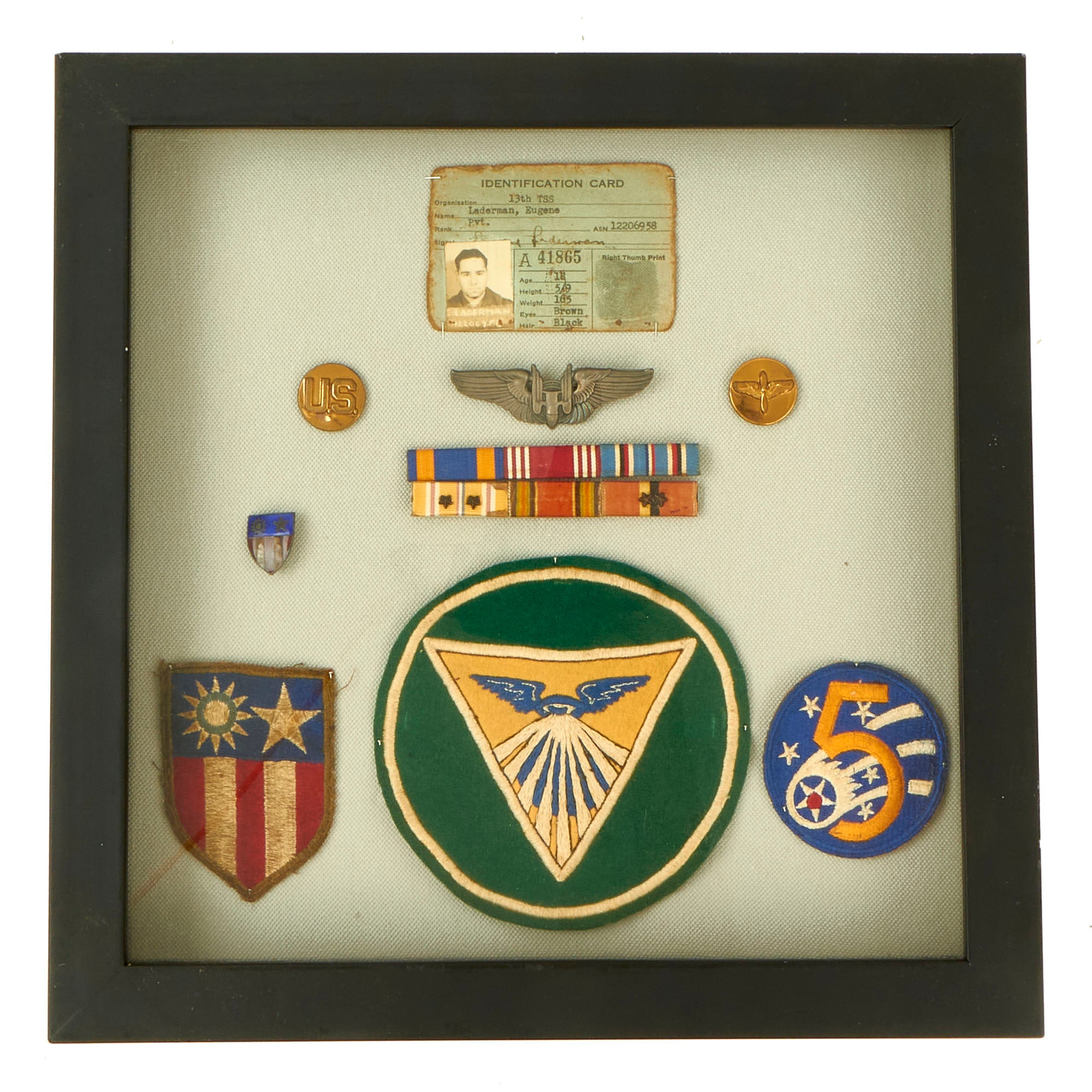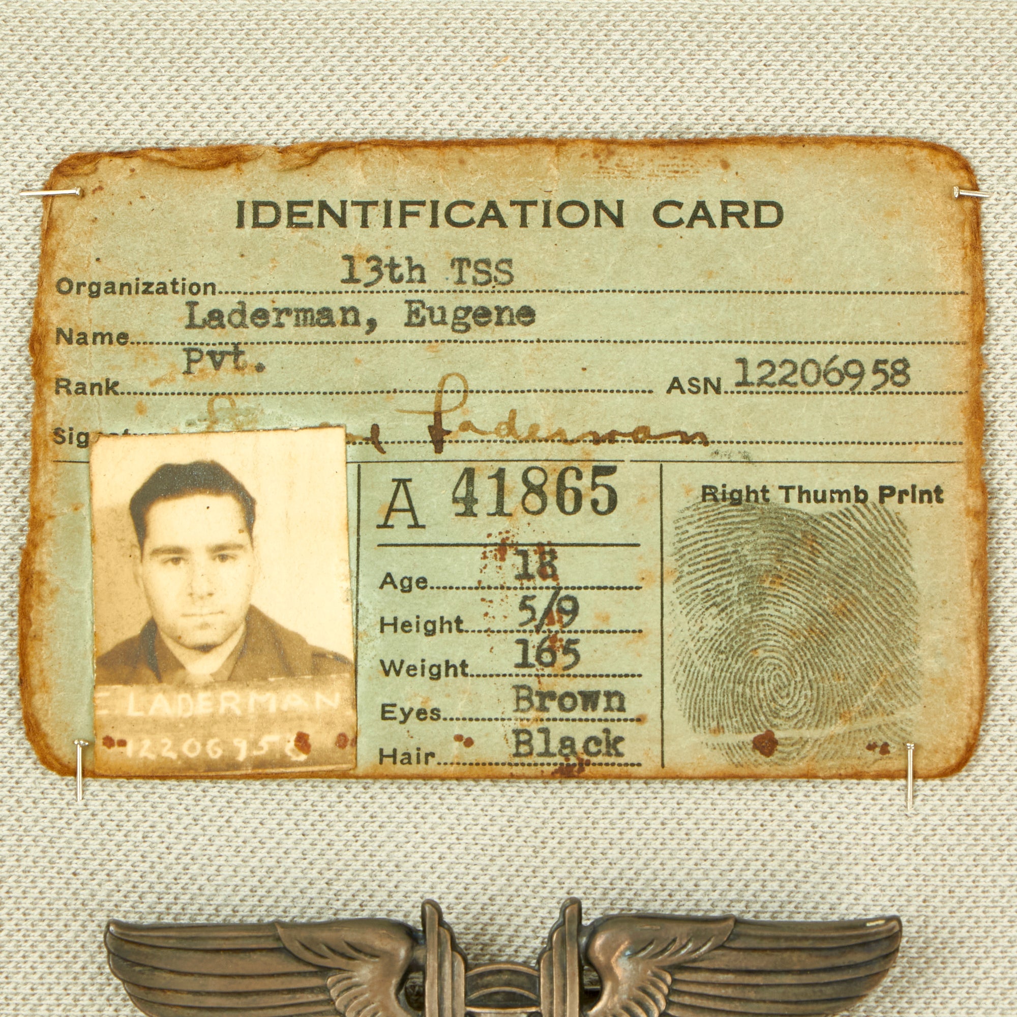 - Identification Card: The ID card is for Laderman from when he was a Private with the 13th Training Support Squadron. His image is still clear and all text still legible.