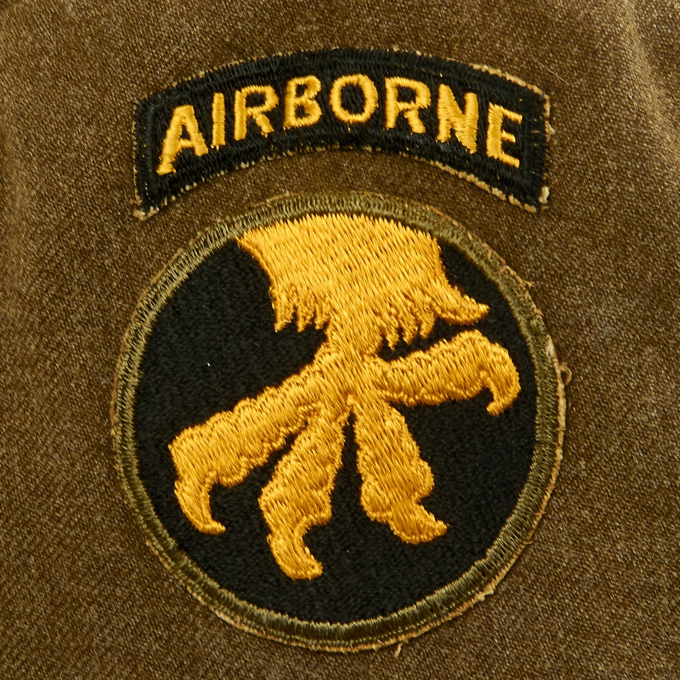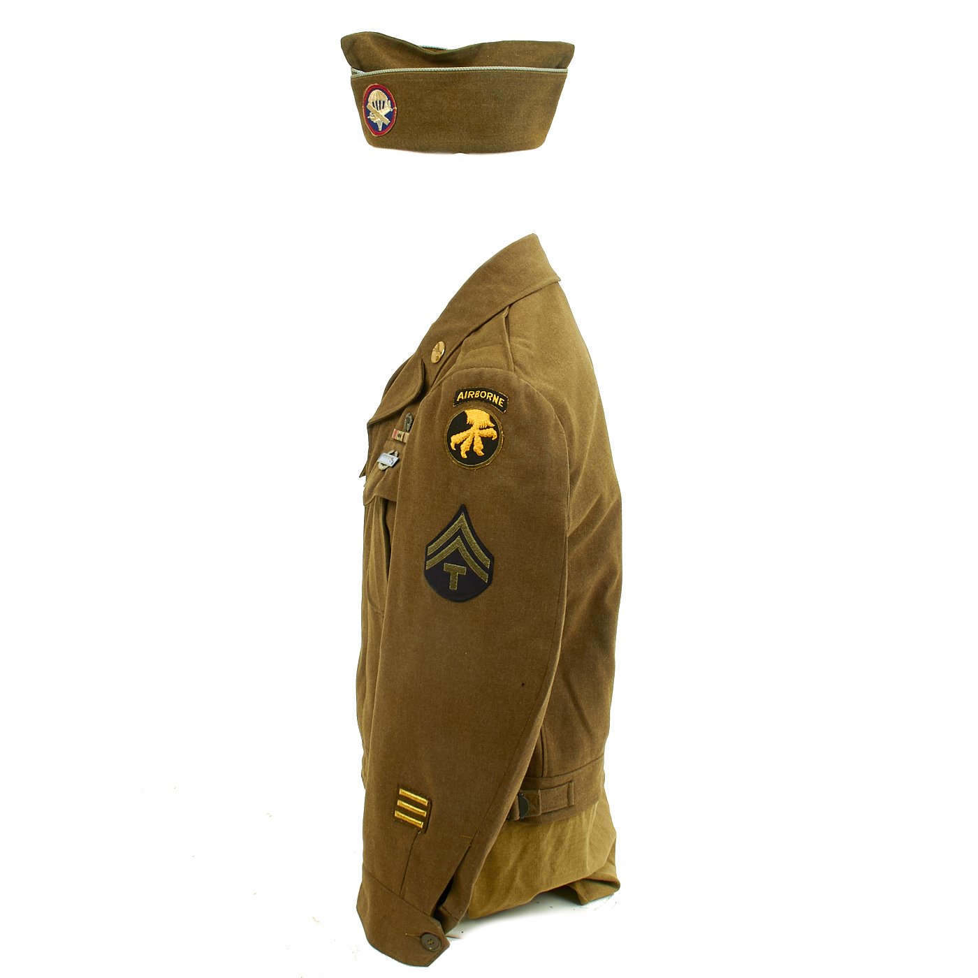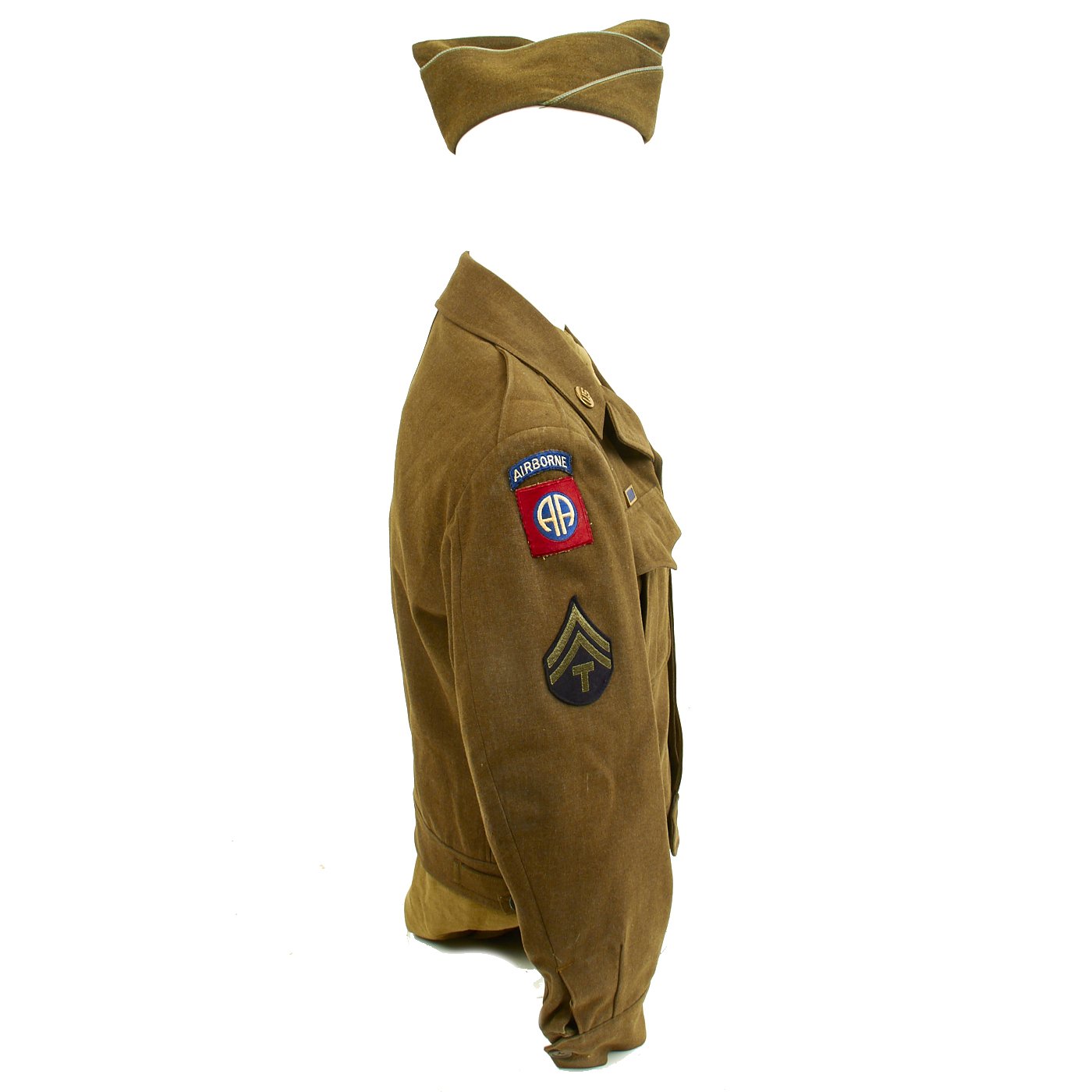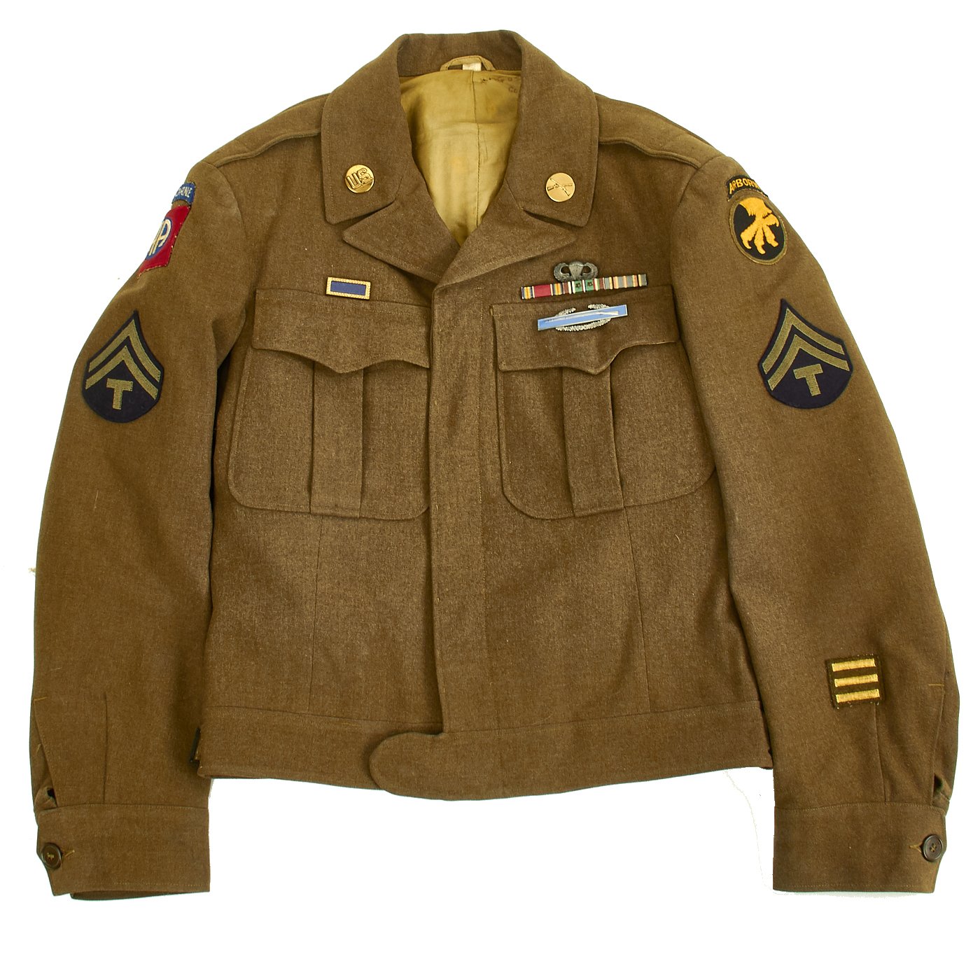 Original Item: One-of-a-kind. Ike Jacket, Pants and Shirt Owned by Lieutenant Gus Sanders, and Later Tech 5 Wyatt, c. 1944-45. Lt. Gus Sanders participated in the Sicily Invasion, D-Day (Normandy, Holland and Central Europe. The jacket has an olive drab wool body, 17th Airborne Battalion patch on the left sleeve, parachute wing, campaign bars, and a combat infantry badge on the left chest, Infantry and U.S. collar discs on the lapels, a presidential unit citation on the right breast, an 82nd Airborne "All American" Division patch, and an olive drab pair of trousers and shirt. Jacket is a size 36R. Also included is an airborne garrison side cap.