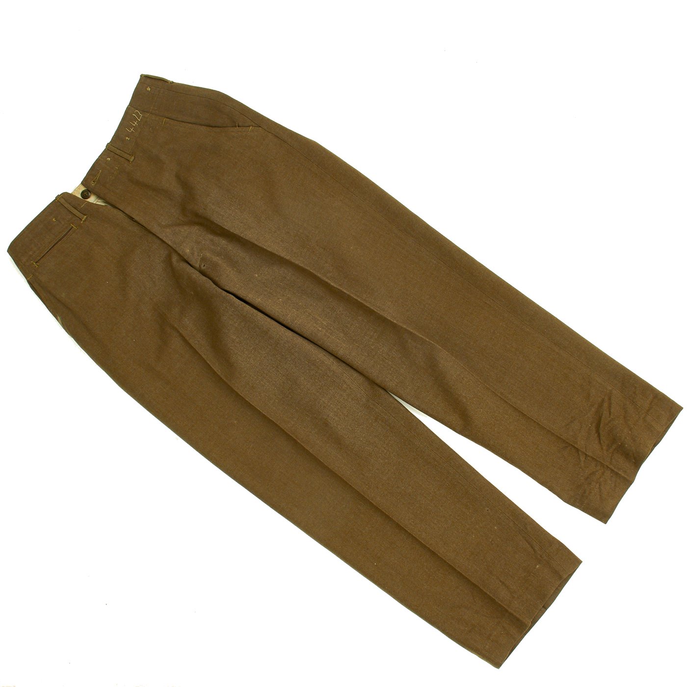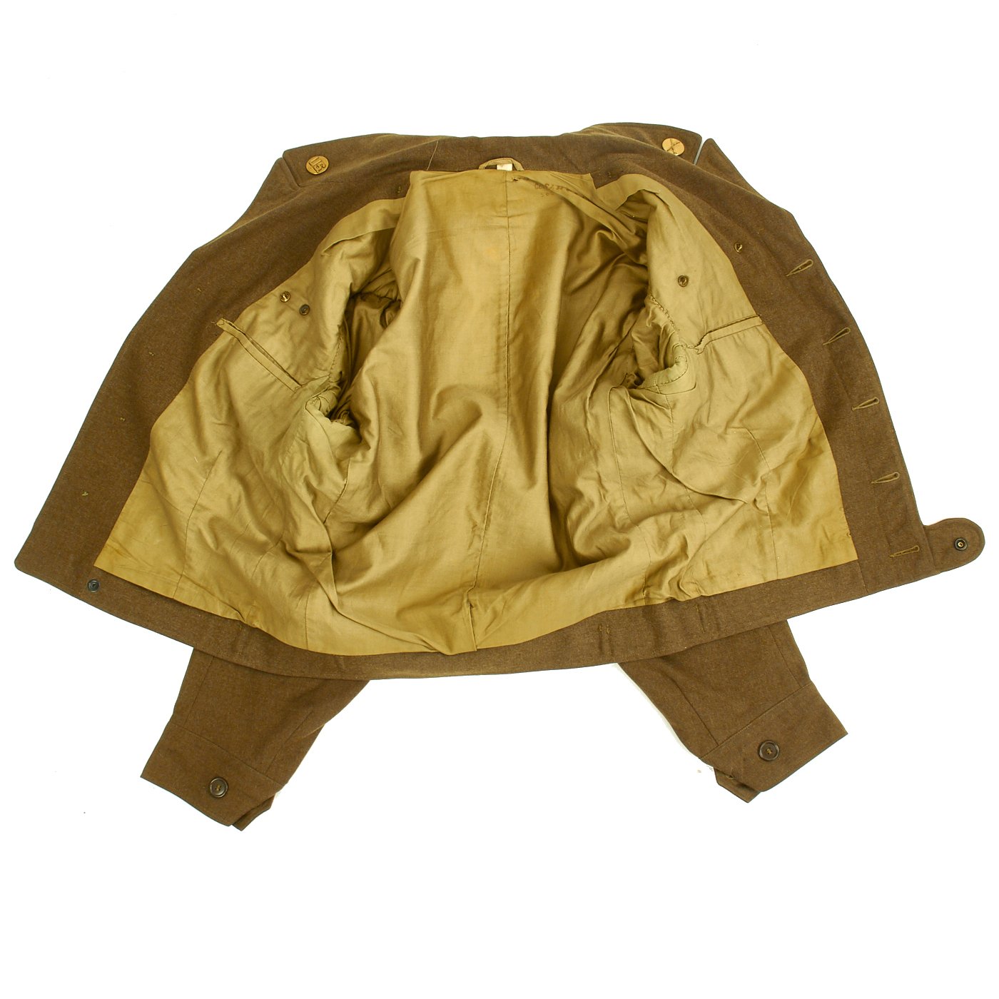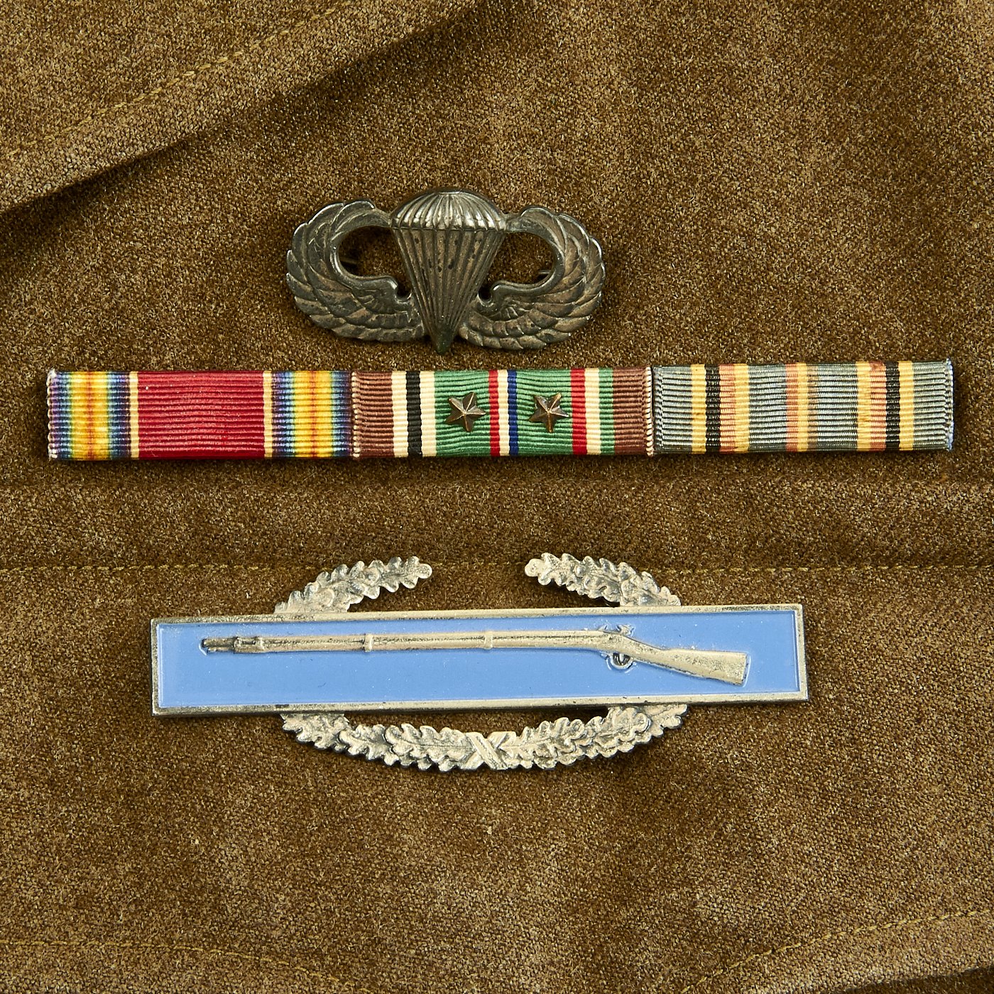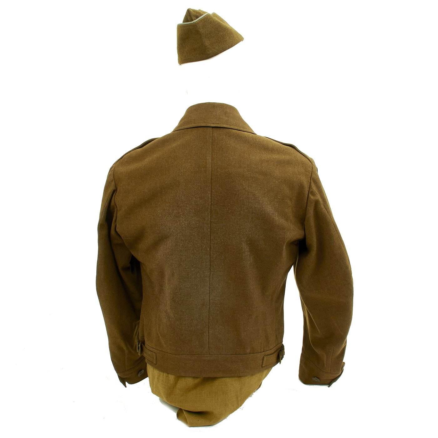 Original Item: One-of-a-kind. Ike Jacket, Pants and Shirt Owned by Lieutenant Gus Sanders, and Later Tech 5 Wyatt, c. 1944-45. Lt. Gus Sanders participated in the Sicily Invasion, D-Day (Normandy, Holland and Central Europe. The jacket has an olive drab wool body, 17th Airborne Battalion patch on the left sleeve, parachute wing, campaign bars, and a combat infantry badge on the left chest, Infantry and U.S. collar discs on the lapels, a presidential unit citation on the right breast, an 82nd Airborne "All American" Division patch, and an olive drab pair of trousers and shirt. Jacket is a size 36R. Also included is an airborne garrison side cap.