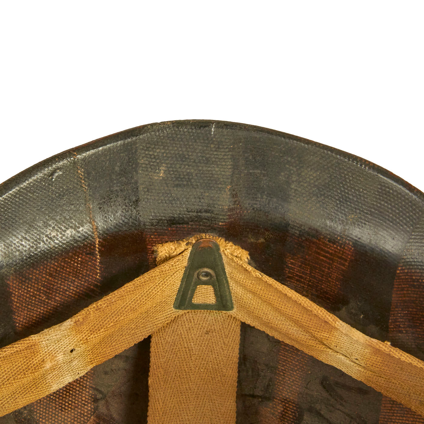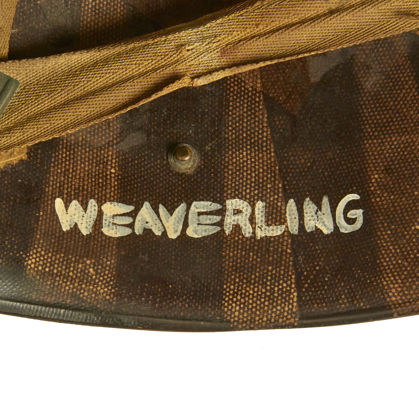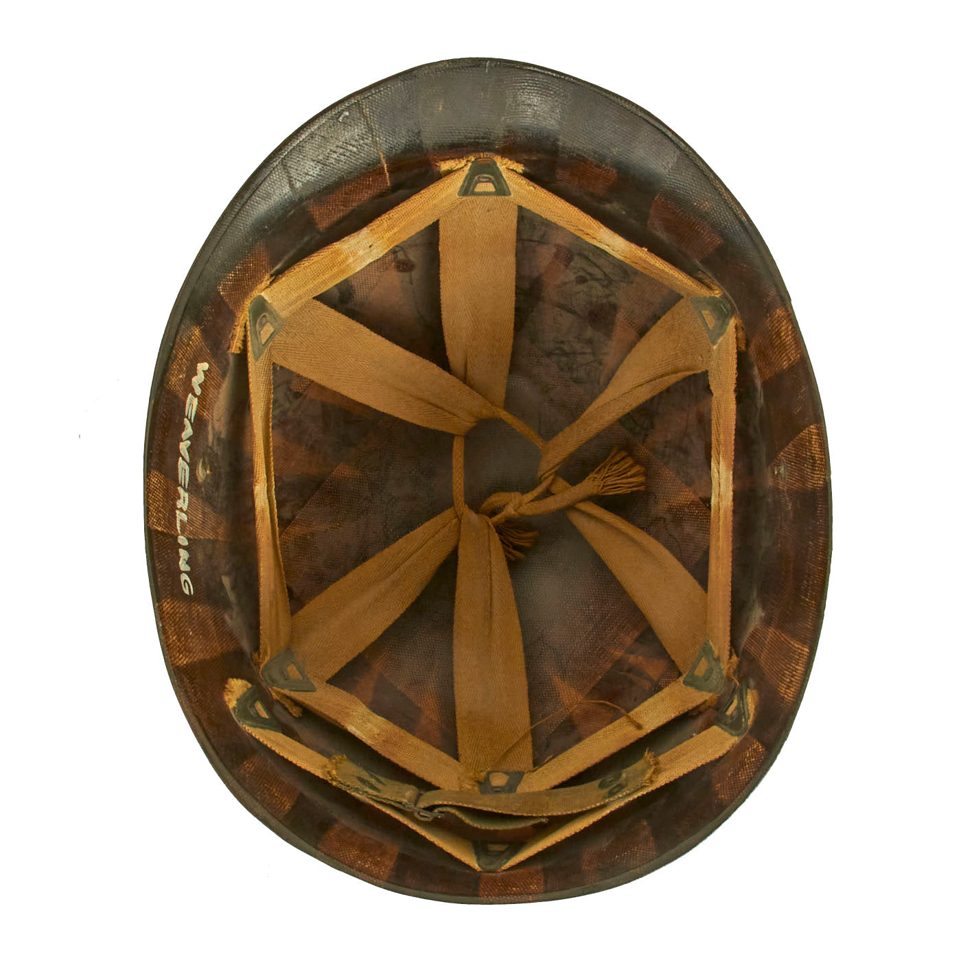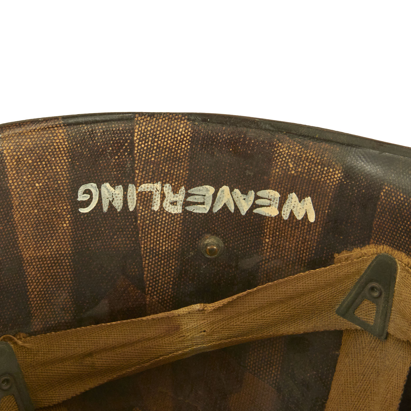 This true US WWII M-1 helmet liner can be identified through the frontal eyelet hole. Other correct WWII features include OD Green #3 cotton herringbone twill (HBT) cloth suspension liner, with the webbing in good condition, but is missing the liner chin strap as well as the leather sweatband. This HBT suspension is held tightly within the M-1 helmet liner by rivets and a series of triangular "A" washers. The three upper suspension bands are joined together with the correct OD green string. This way the wearer could adjust the fit. “WEAVERLING” is written in white on the inside. Due to the popularity of the last name we were unable to locate any service information on this trooper, but that doesn’t mean you won’t have any luck!