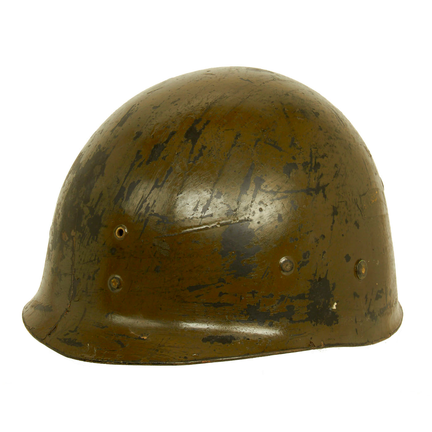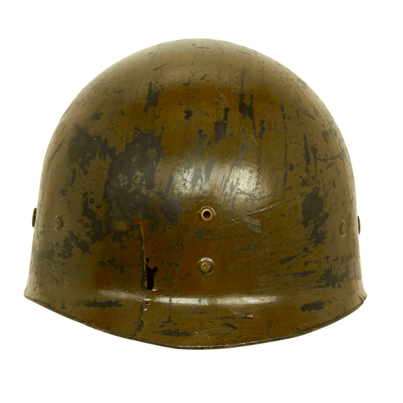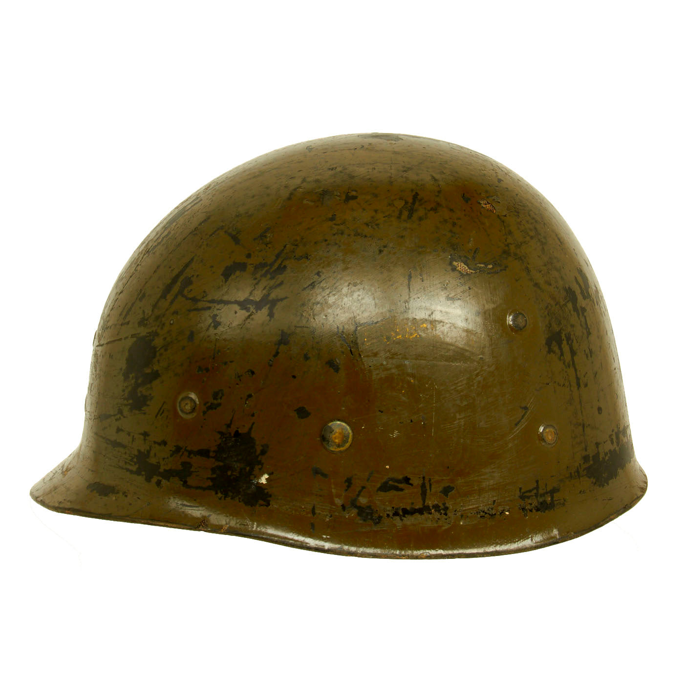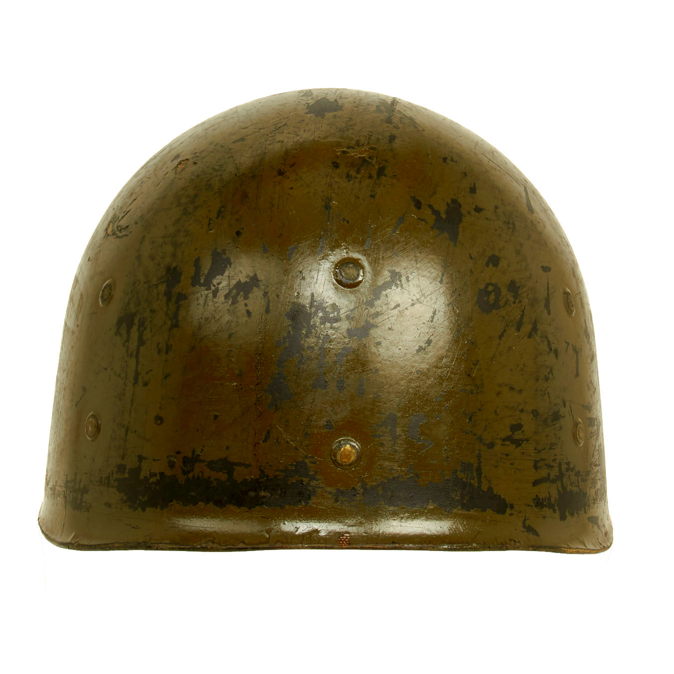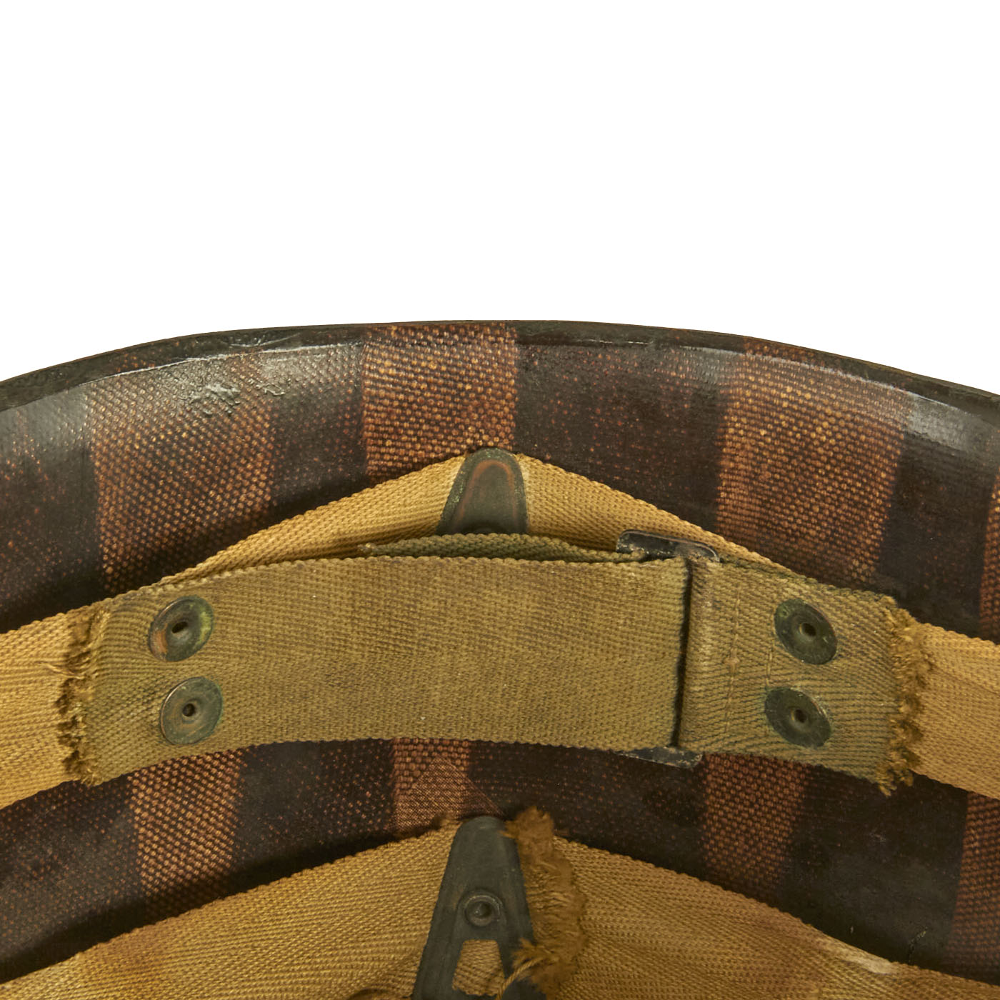 This true US WWII M-1 helmet liner can be identified through the frontal eyelet hole. Other correct WWII features include OD Green #3 cotton herringbone twill (HBT) cloth suspension liner, with the webbing in good condition, but is missing the liner chin strap as well as the leather sweatband. This HBT suspension is held tightly within the M-1 helmet liner by rivets and a series of triangular "A" washers. The three upper suspension bands are joined together with the correct OD green string. This way the wearer could adjust the fit. “WEAVERLING” is written in white on the inside. Due to the popularity of the last name we were unable to locate any service information on this trooper, but that doesn’t mean you won’t have any luck!