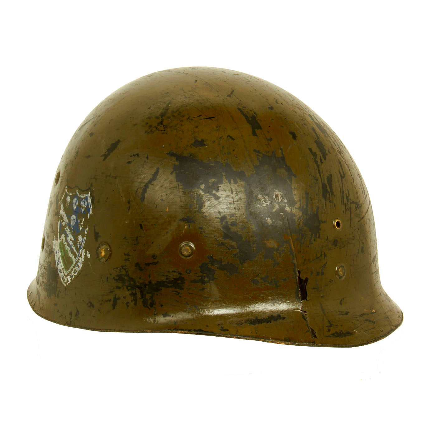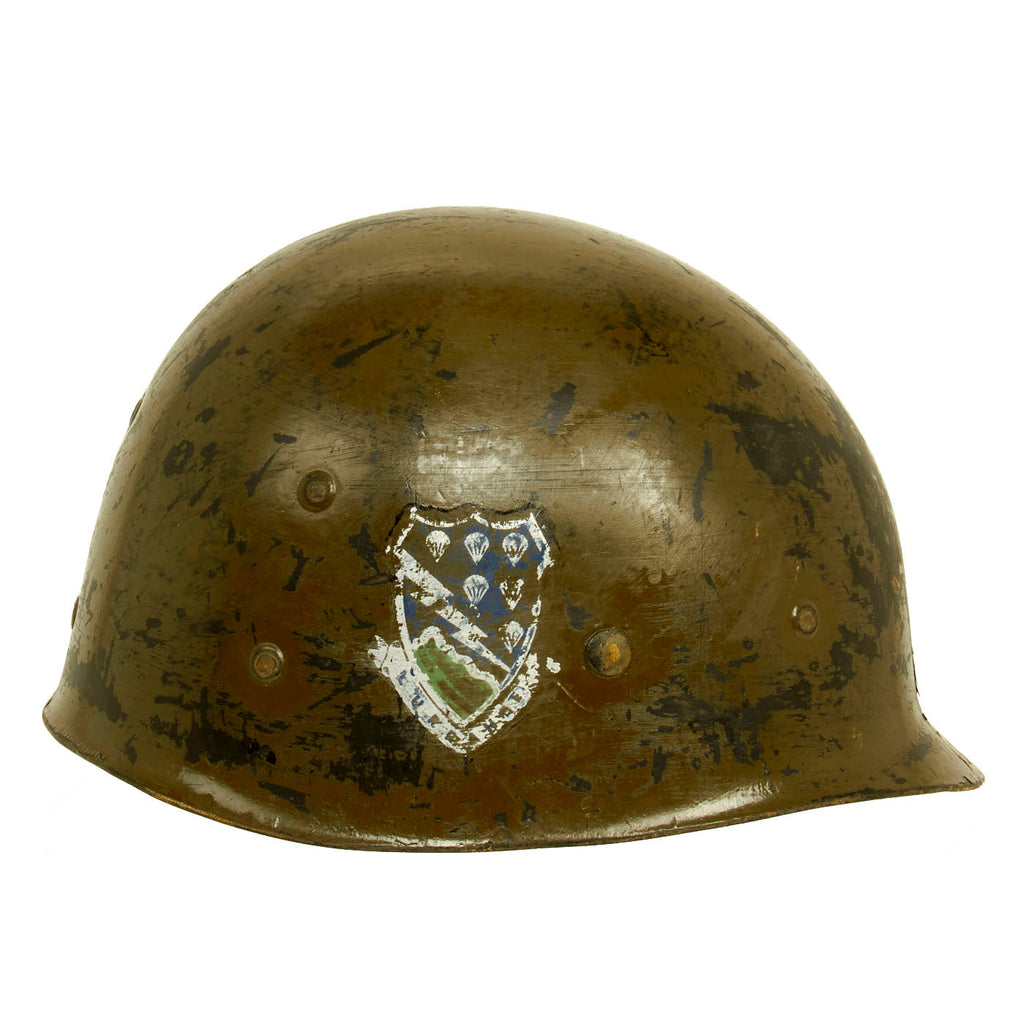 We are uncertain if either of these decals were painted post-war for parade use, but they are still beautiful regardless! This lovely M1 helmet liner comes more than ready for research and display!