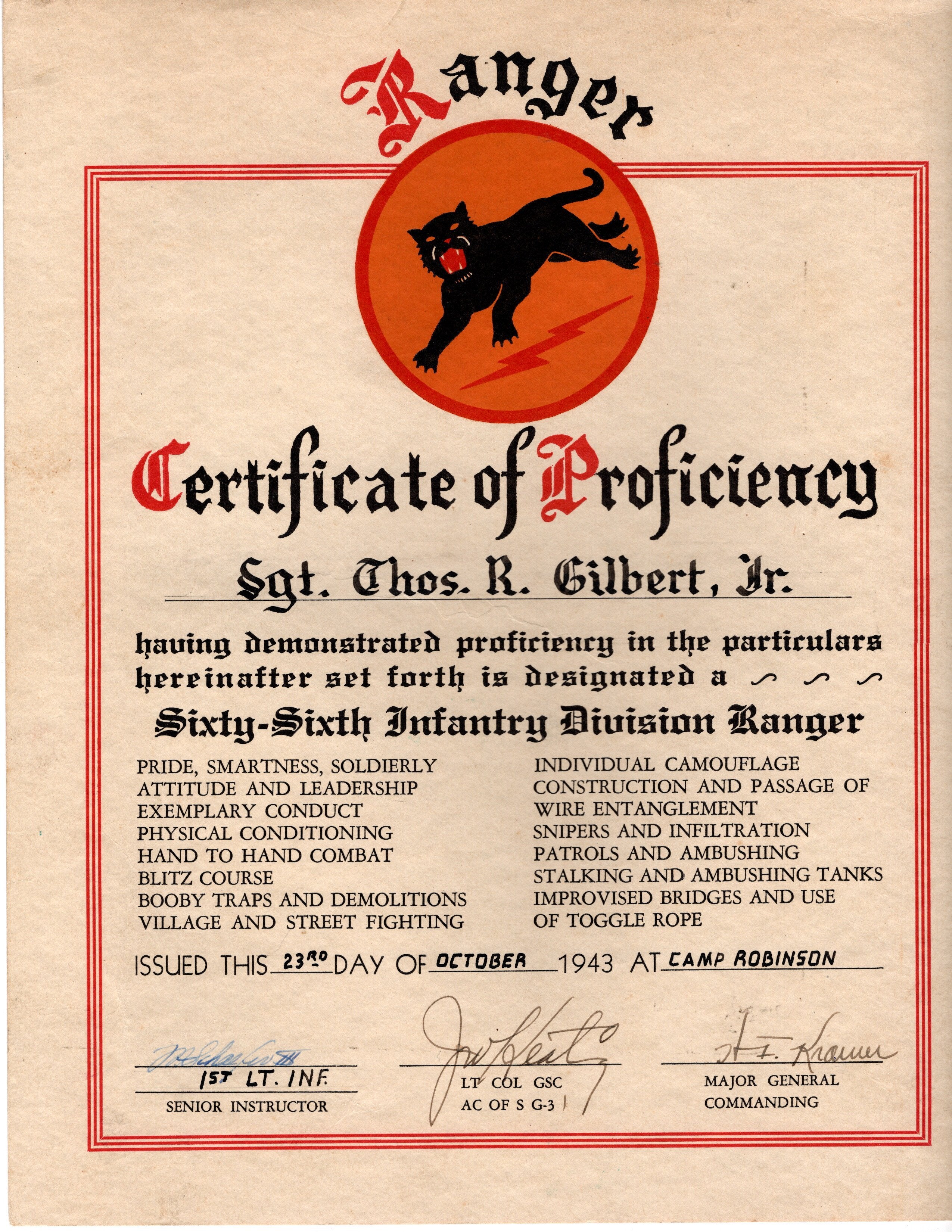 - Original Ranger Certificate of Proficiency named to Sgt. Thos. R. Gilbert. Jr. dated 23rd October 1943 at Camp Robinson.