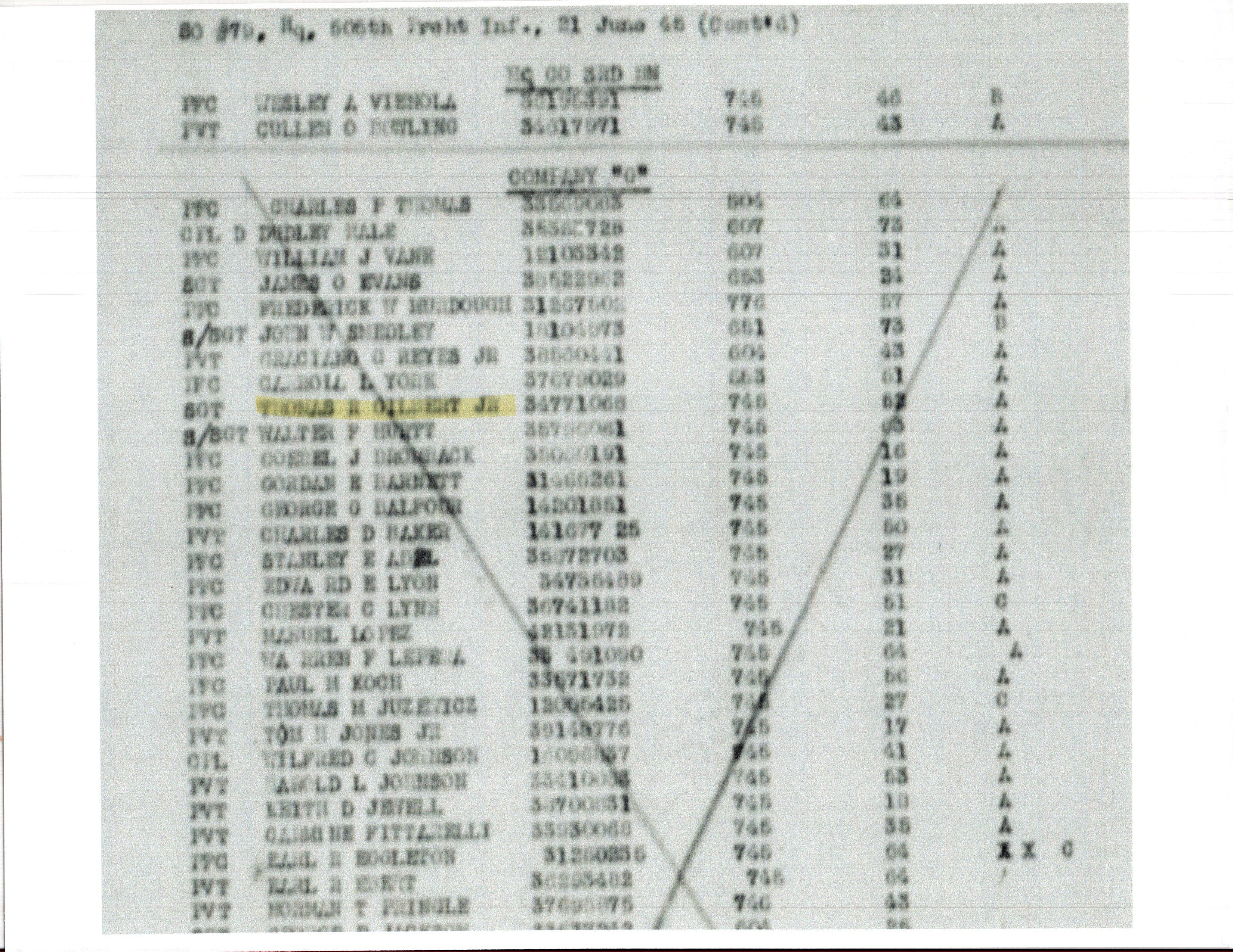 - Copy of June 22nd 1944 roster for the HQ company, 506th PIR naming Sgt. Gilbert with ASN.