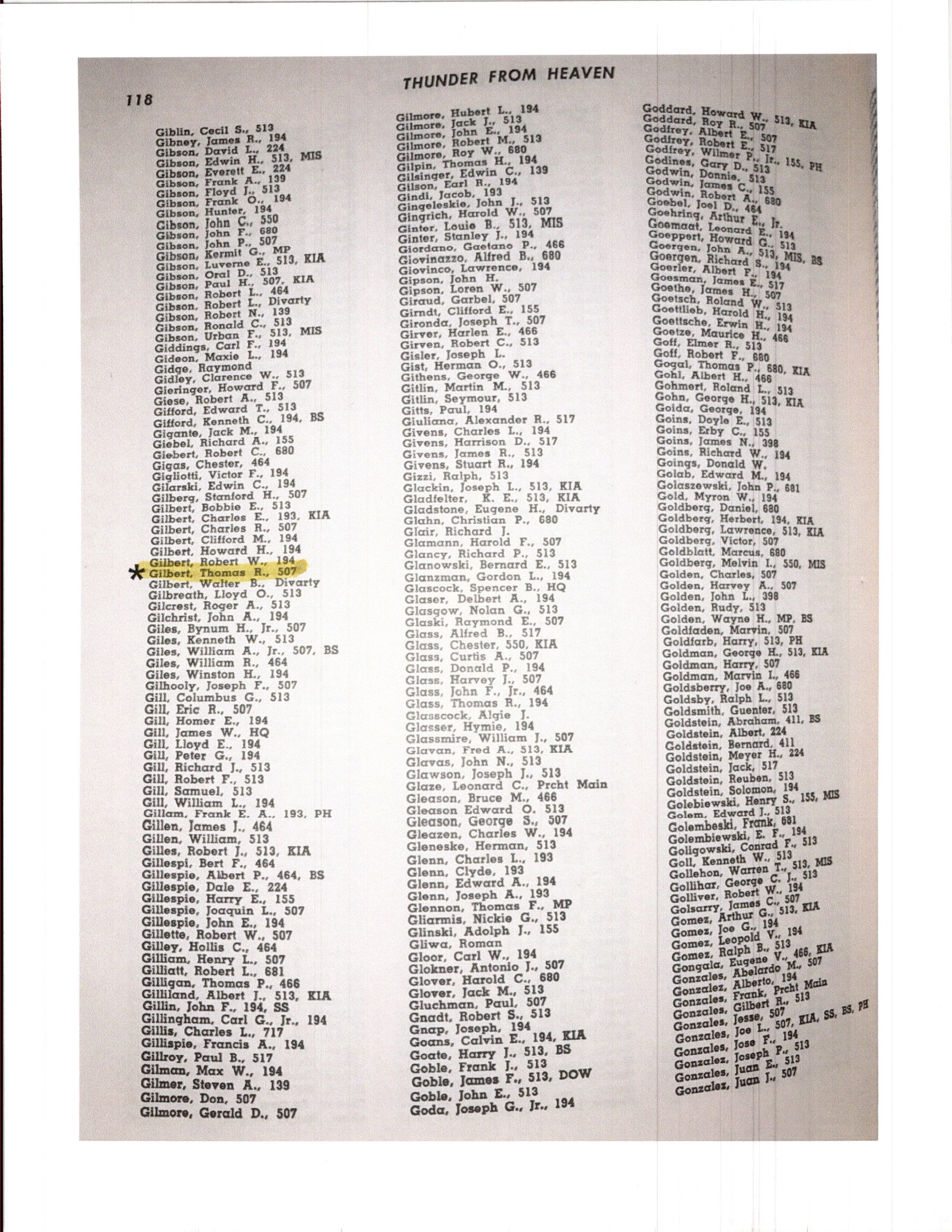 - Copy of page 118 from the book Thunder From Heaven named Sgt. Gilbert and identifying him as a member of the 50th Parachute Infantry Regiment (most likely who he came home with).