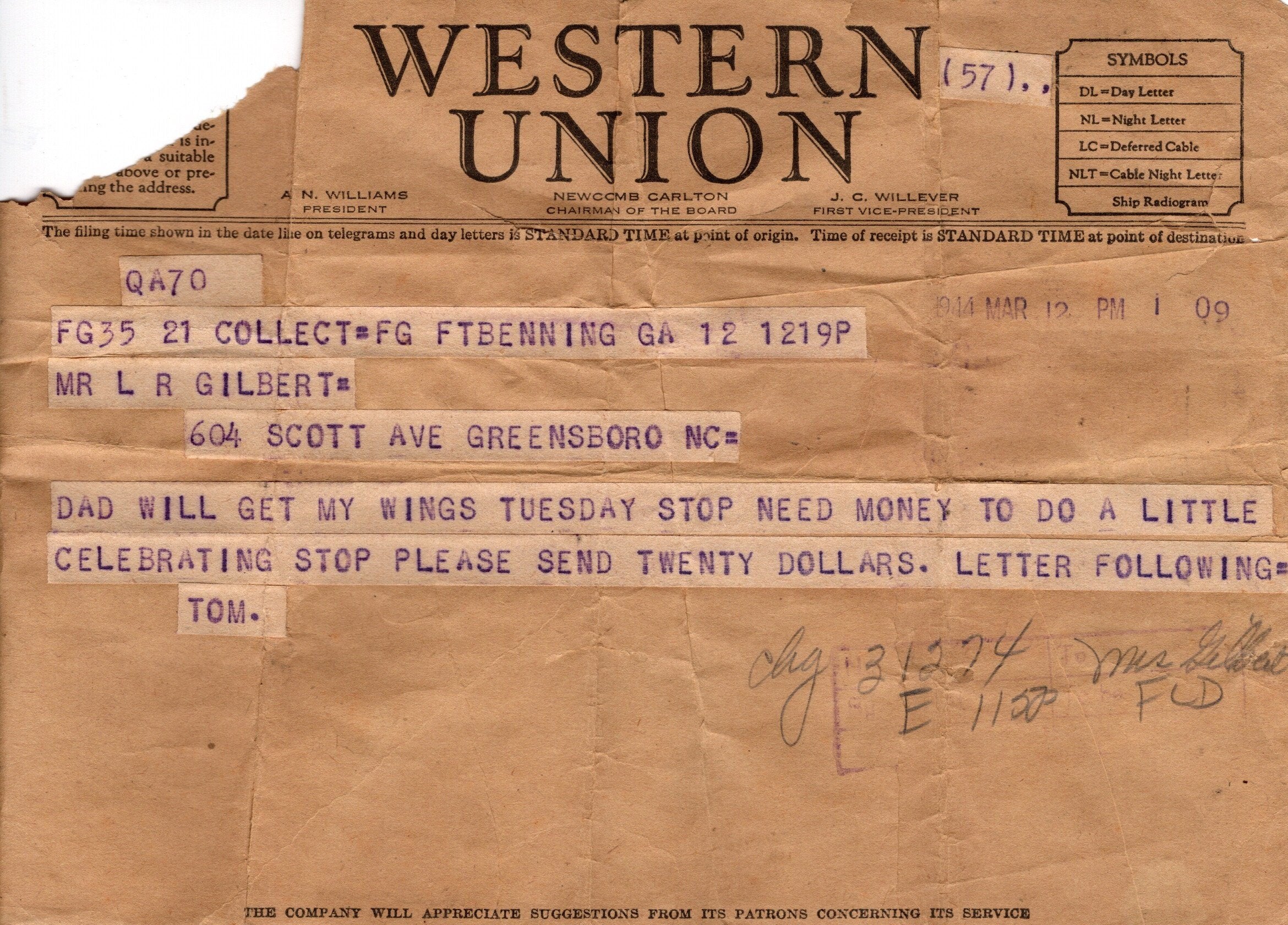 - Original Western Union telegram from Sgt. Gilbert to his father dated March 12th, 1944 that reads: DAD WILL GET MY WINGS TUESDAY STOP NEED MONEY TO DO A LITTLE CELEBRATING STOP PLEASE SEND TWENTY DOLLARS. LETTER FOLLOWING TOM.