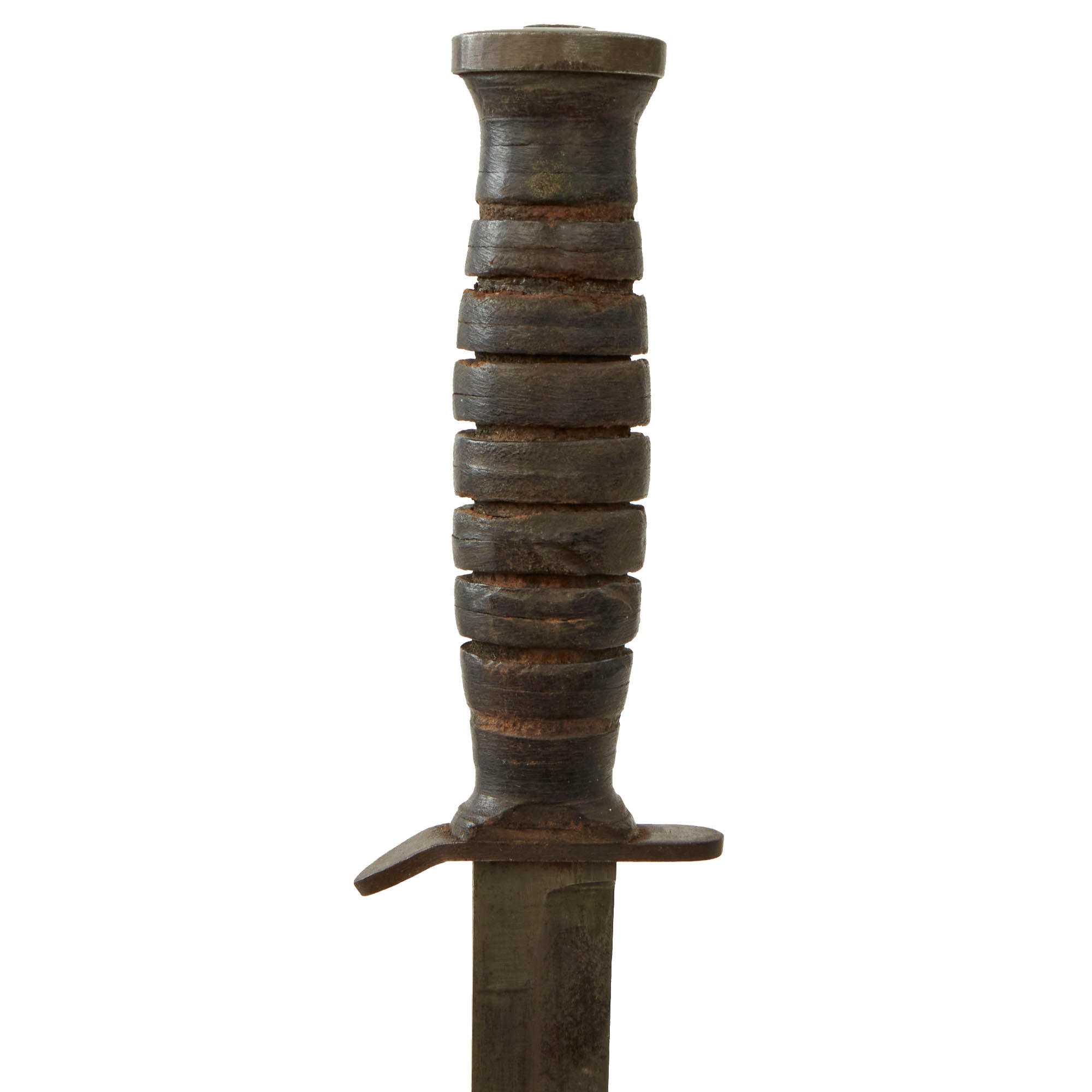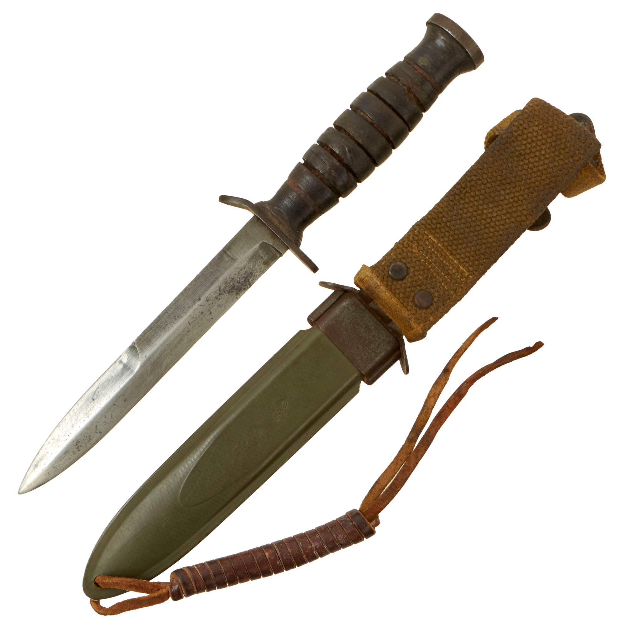 Original Item: Only One Available. This is a very good example of a WWII M3 U.S. fighting knife, made by the desirable maker, Imperial Knife Co.. With the marking on the blade, this is the more desirable "2nd Pattern", which was replaced quickly by the 3rd pattern with markings on the crossguard. It comes complete in the correct M8 scabbard, which was updated during the war to the M8A1 standard. These fighting knives were preferred by American infantry during World War Two for hand to hand combat. This example is named and serial numbered on the scabbard to PFC Richard Cox “Red” Rickard, serial number 38045239. We haven’t found much on his service, making this a great research project.