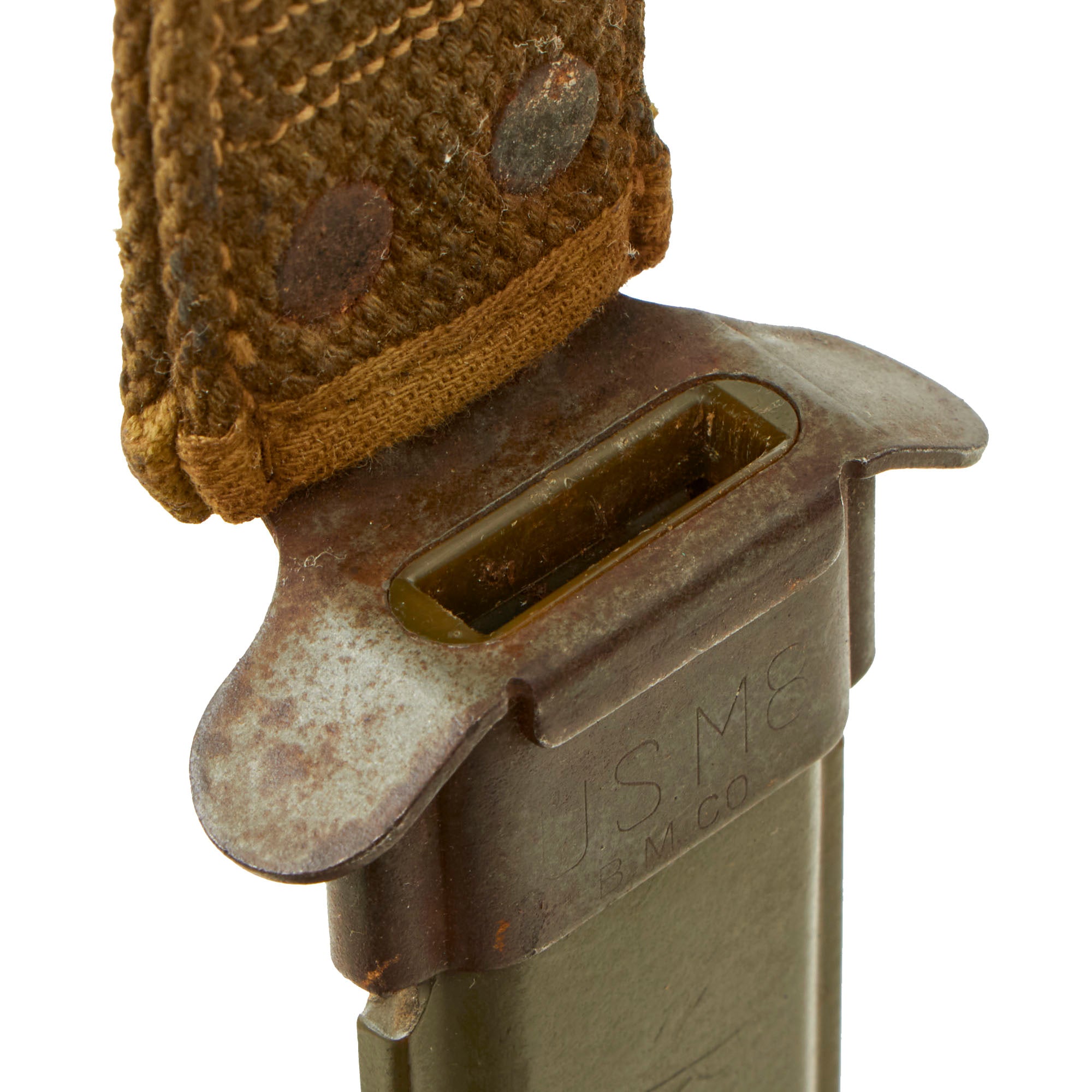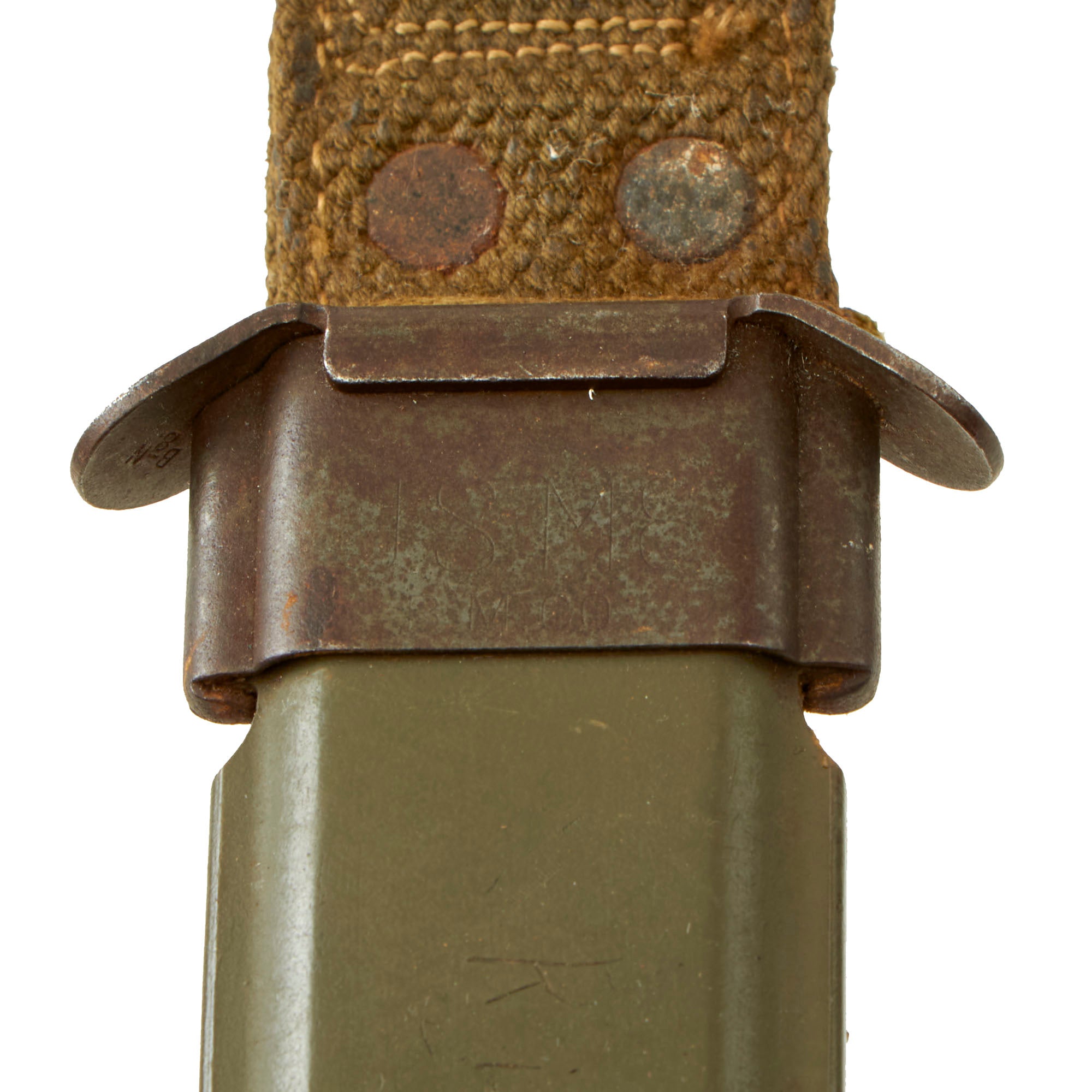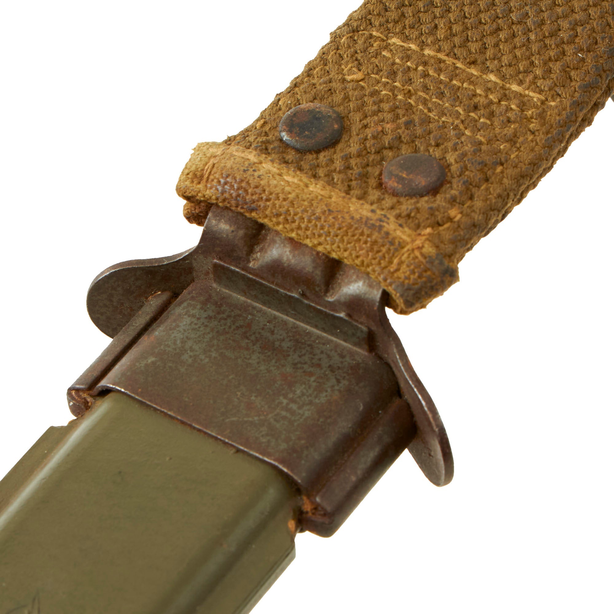 The original scabbard is marked, U.S. M8 / B.M. CO and is in very good condition, with light overall wear. This is the earlier pattern of the scabbard, without the retaining loop, though it was later updated to have one. These feature a thermoplastic impregnated cotton fabric body, metal throat, and canvas frog and securing strap. The body still has most of the original OD Green finish. The metal finish is somewhat worn, but looks great. The scabbard was manufactured by Beckwith Mfg Co. a division of Victory Plastics. This example still retains its leather tiedown.