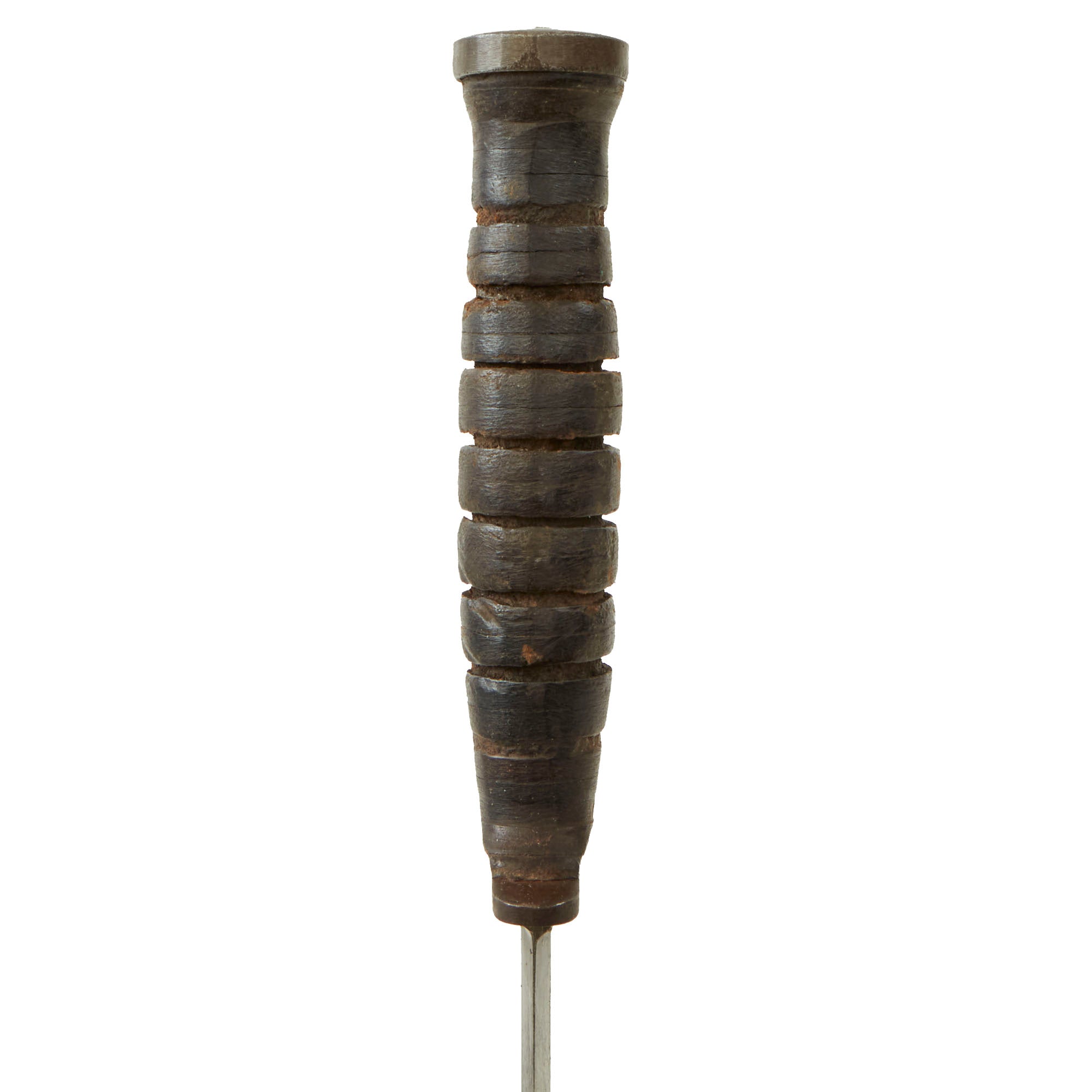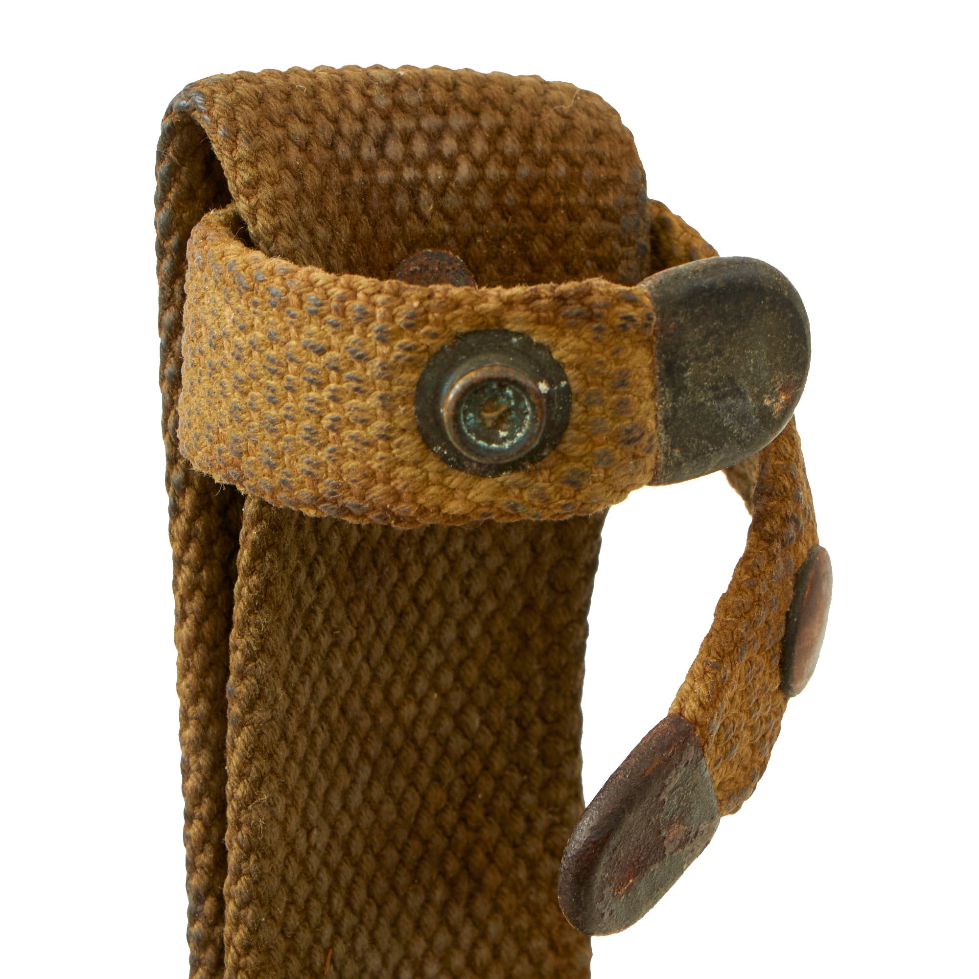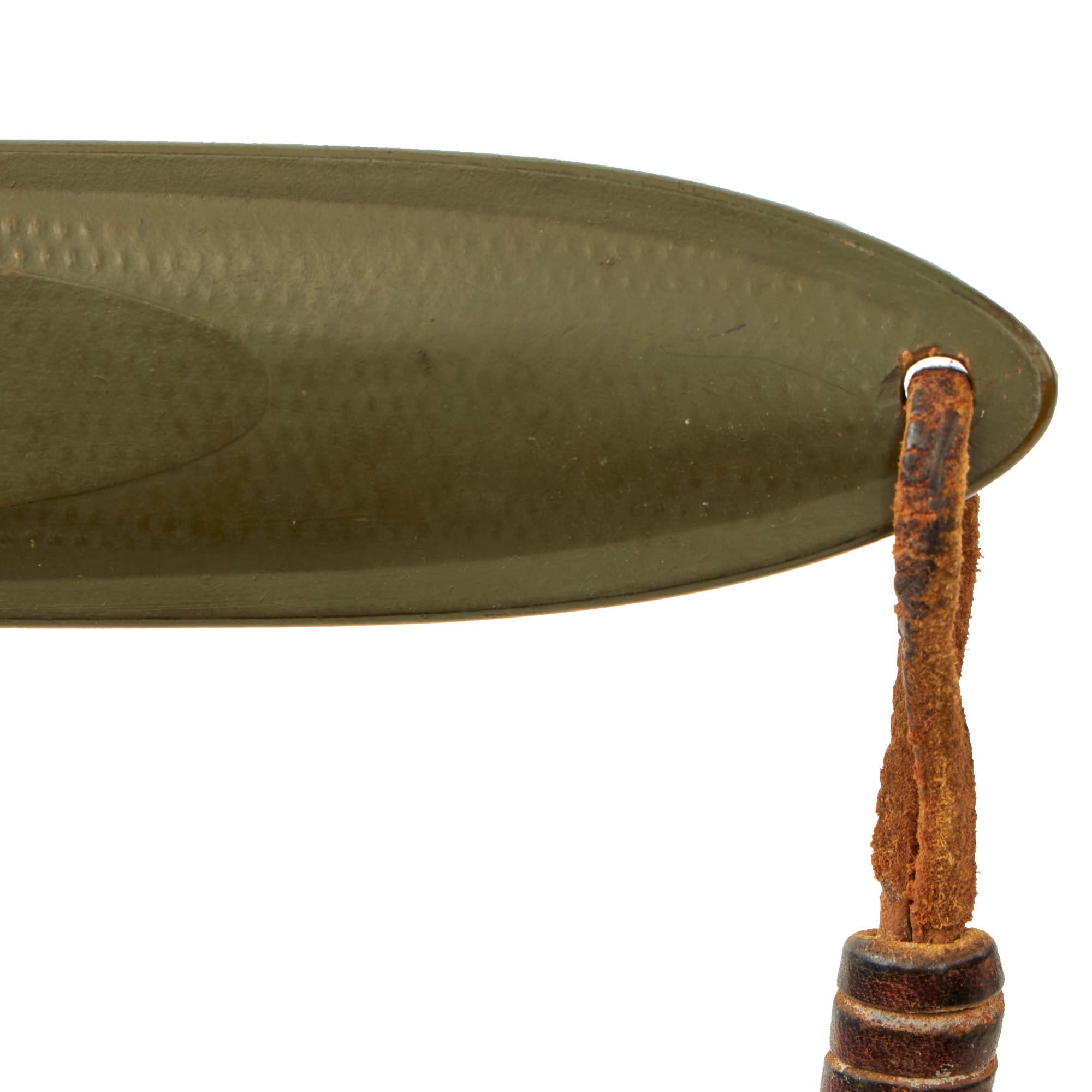 The original scabbard is marked, U.S. M8 / B.M. CO and is in very good condition, with light overall wear. This is the earlier pattern of the scabbard, without the retaining loop, though it was later updated to have one. These feature a thermoplastic impregnated cotton fabric body, metal throat, and canvas frog and securing strap. The body still has most of the original OD Green finish. The metal finish is somewhat worn, but looks great. The scabbard was manufactured by Beckwith Mfg Co. a division of Victory Plastics. This example still retains its leather tiedown.