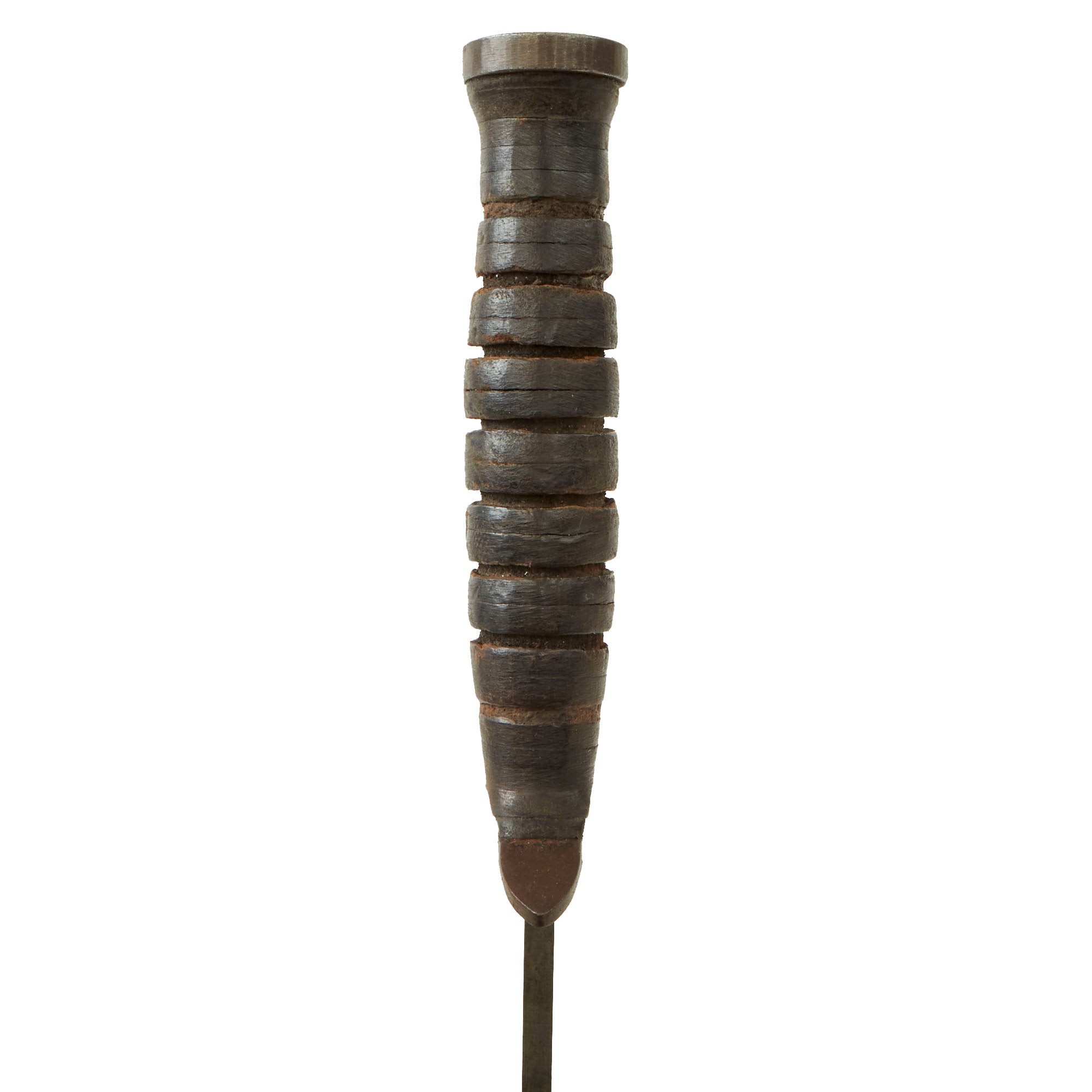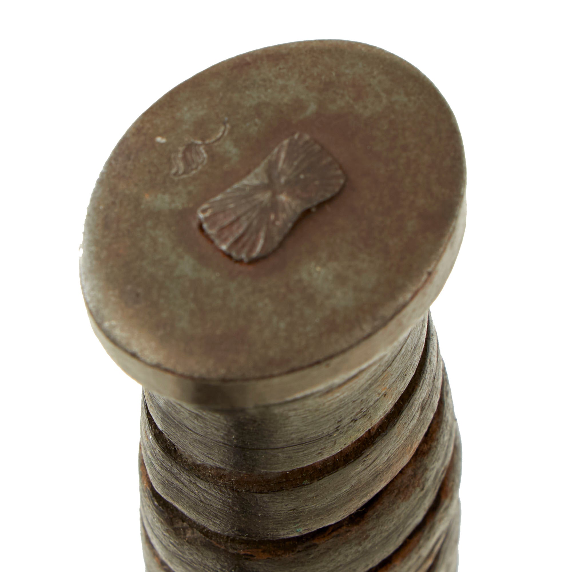 The handle and stacked leather grip are in very good, moderately used condition, with no major issues or cracking. There is a bit of wear on the outside, as expected for a knife that has seen service. The crossguard is still in the correct shape, straight with a forward bend at the top for the thumb, and has only a tiny bit of movement. The bottom of the pommel shows the U.S. "Flaming Bomb" ordnance proof mark and correct peened over tang.