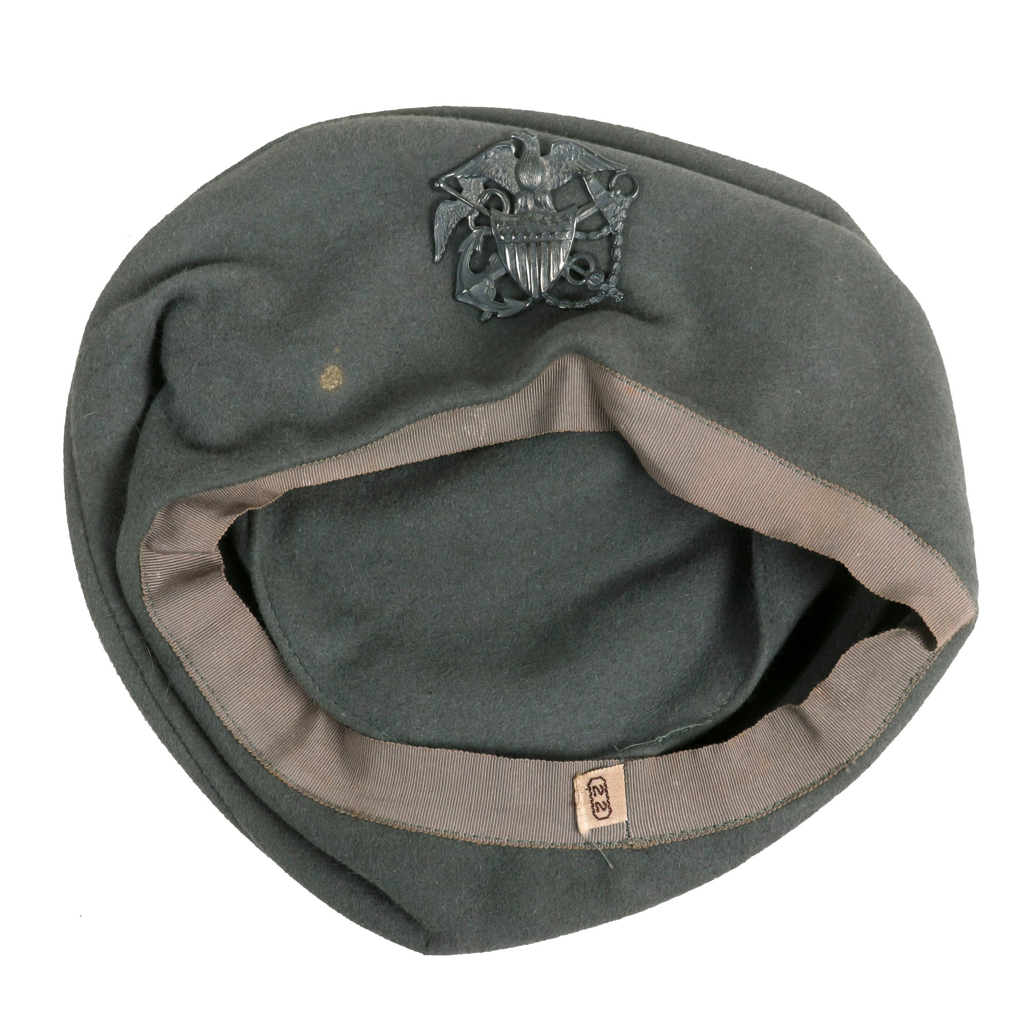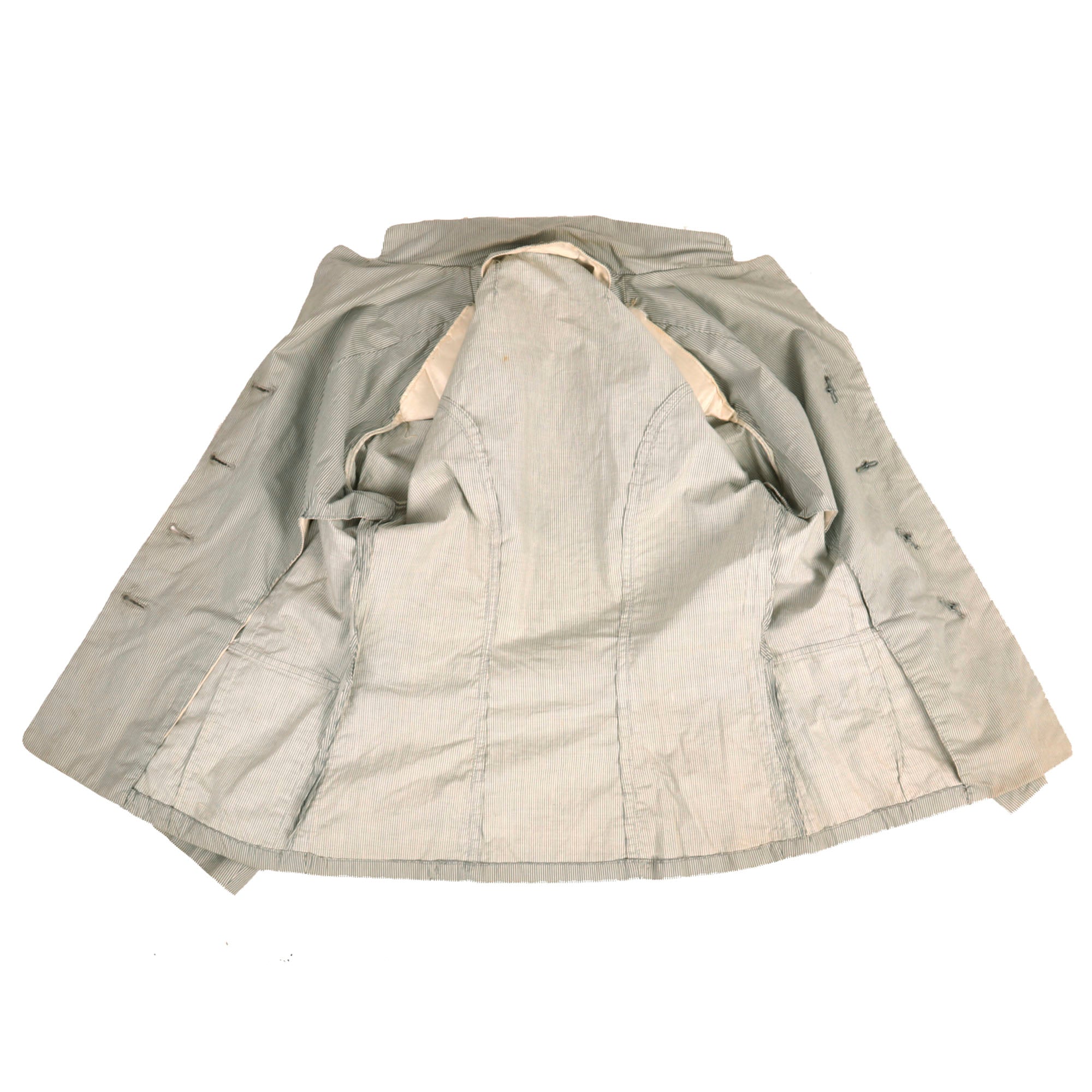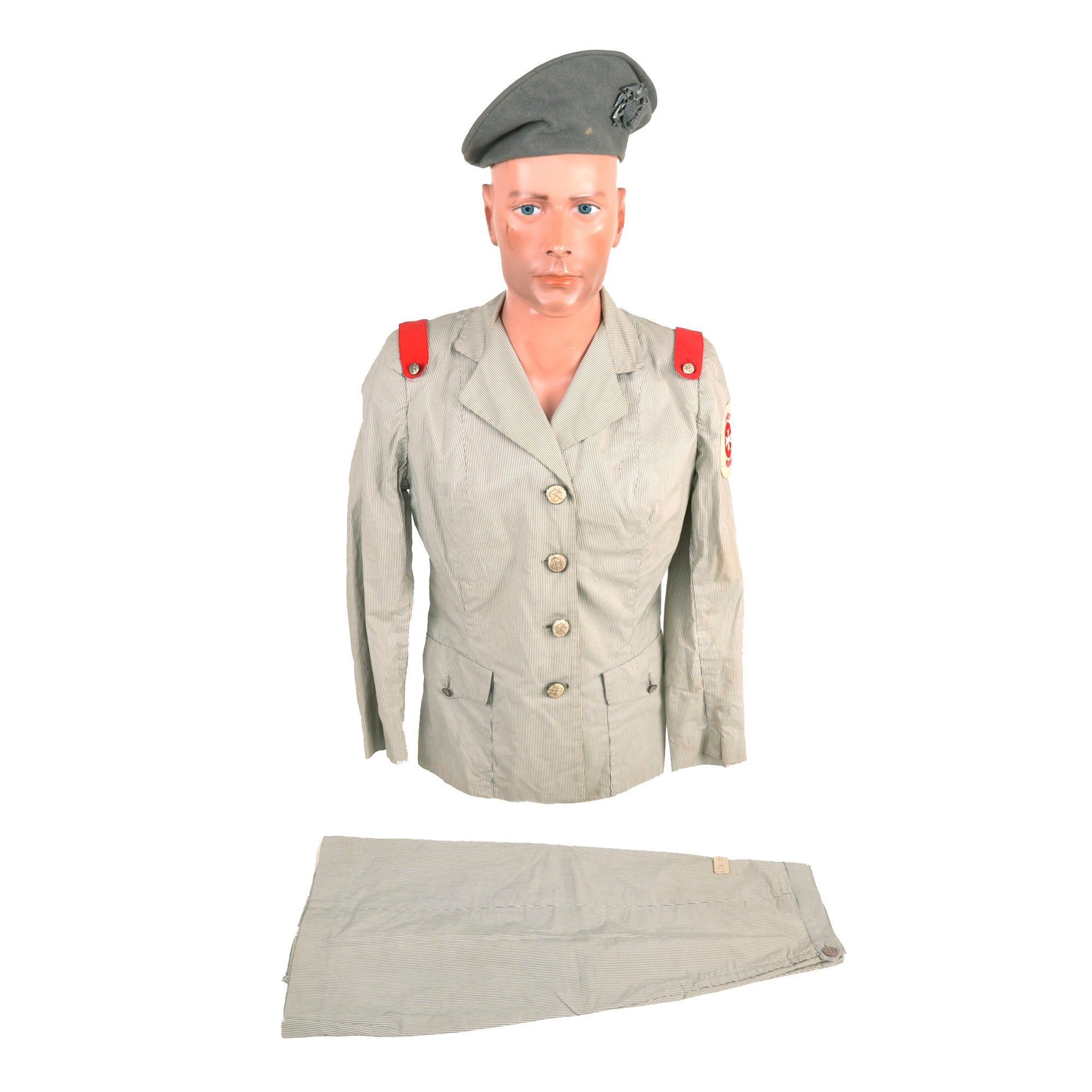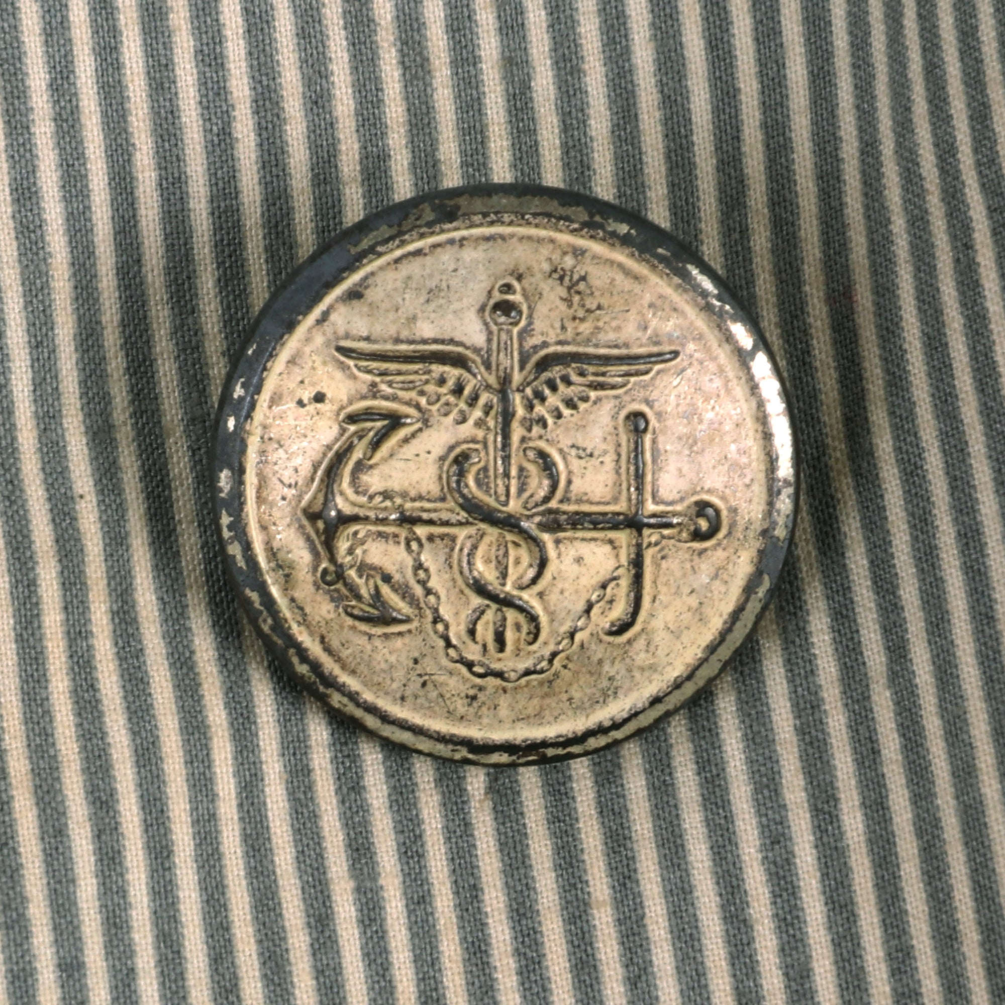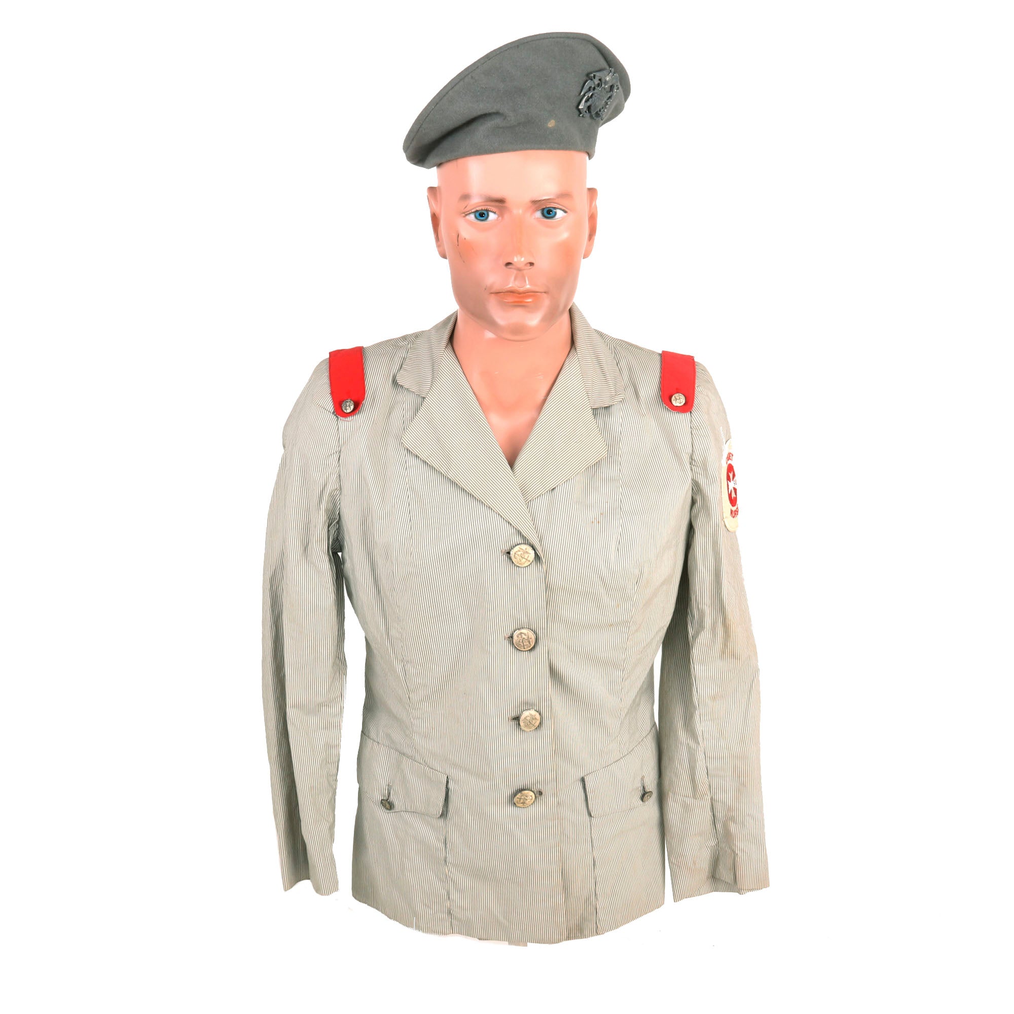 The pants are also in good condition with few flaws. The cap has some minor nipping being of a wool construction, with the sweatband still retained. There is a tag on the sweatband readings 22, likely the hat size. The cap has a hat badge for the U.S. Public Health Service, with the buttons of the uniform bearing the same insignia. There is an old tag in the pocket which reads WWII Cadet Nurse Uniform Class of 1944 Picture Top Row, Extreme Left Dorothy Fry who enlisted as a cadet nurse. This photo has been lost and is no longer with the uniform, but the photo is likely able to be found somewhere. We have provided some research on Fry including her gravestone and CNC membership card.