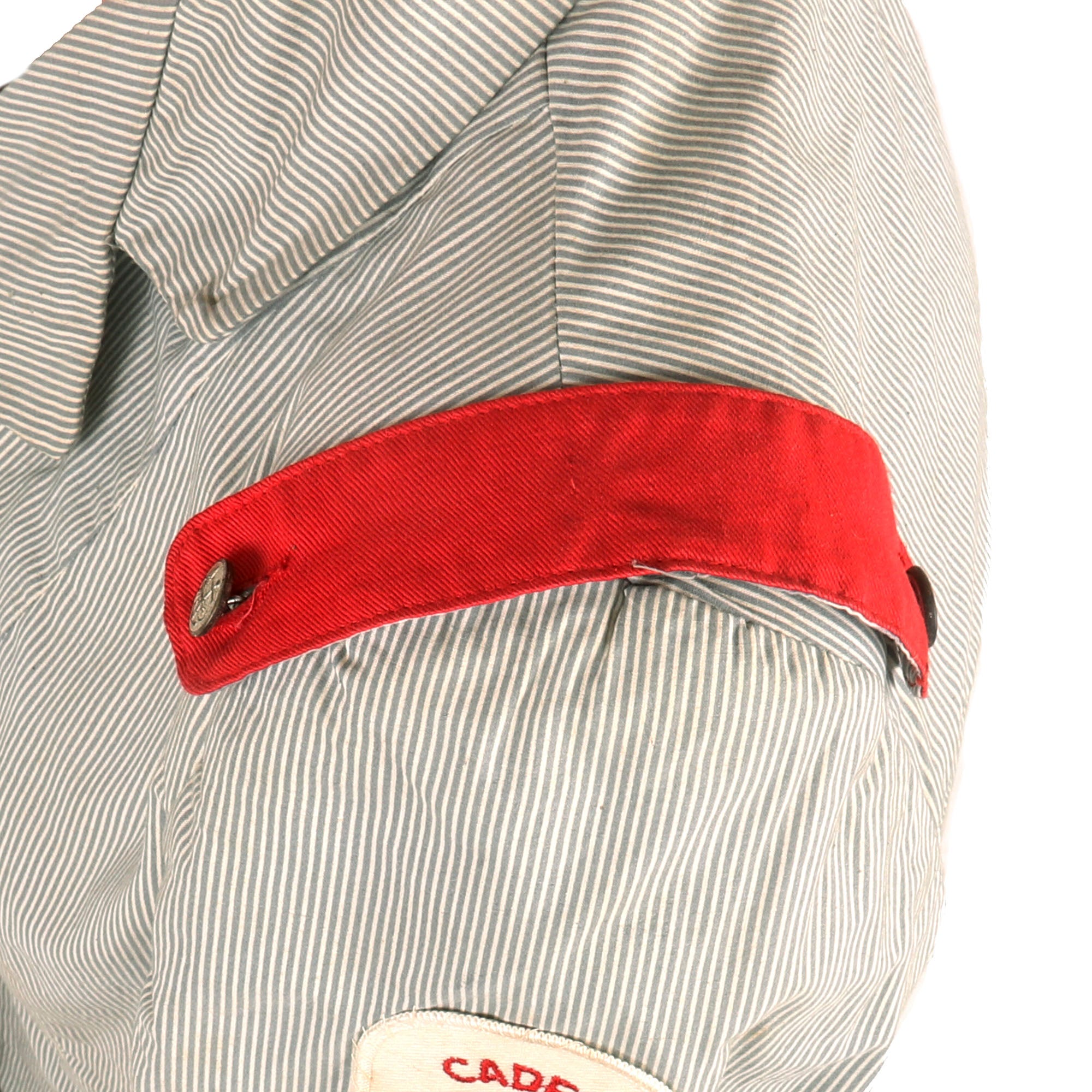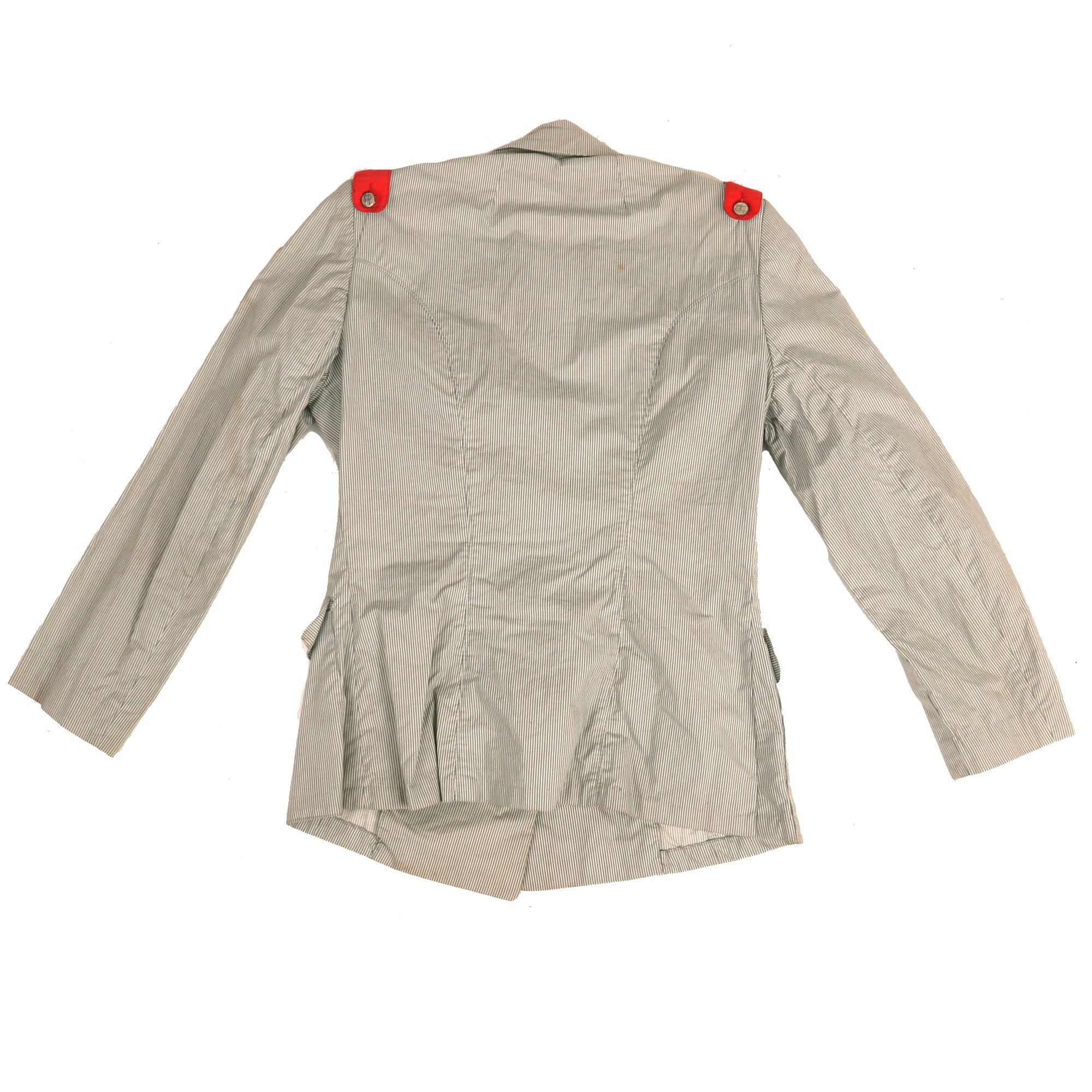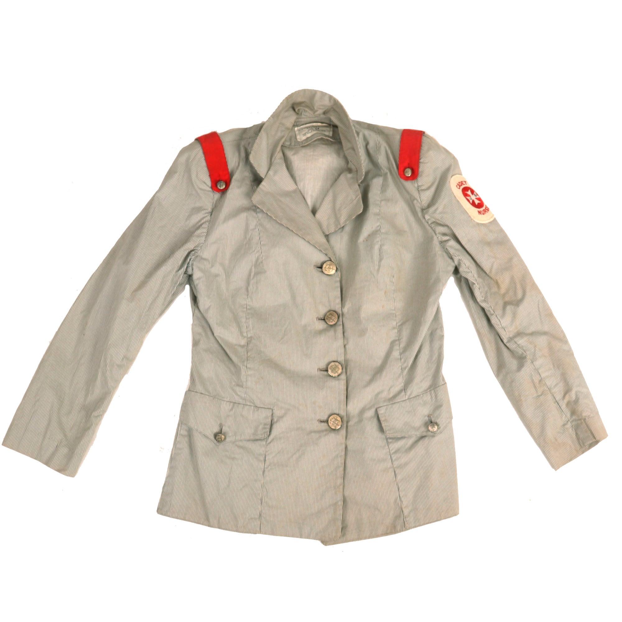 The uniform is overall in good shape, with the two pillows under the shoulders still retained. There is a patch for the Cadet Nurse Corps on the left sleeve, featuring an 8-pointed white maltese cross, and both red epaulets are still retained on the uniform. There is a tag below the collar of the uniform that reads: