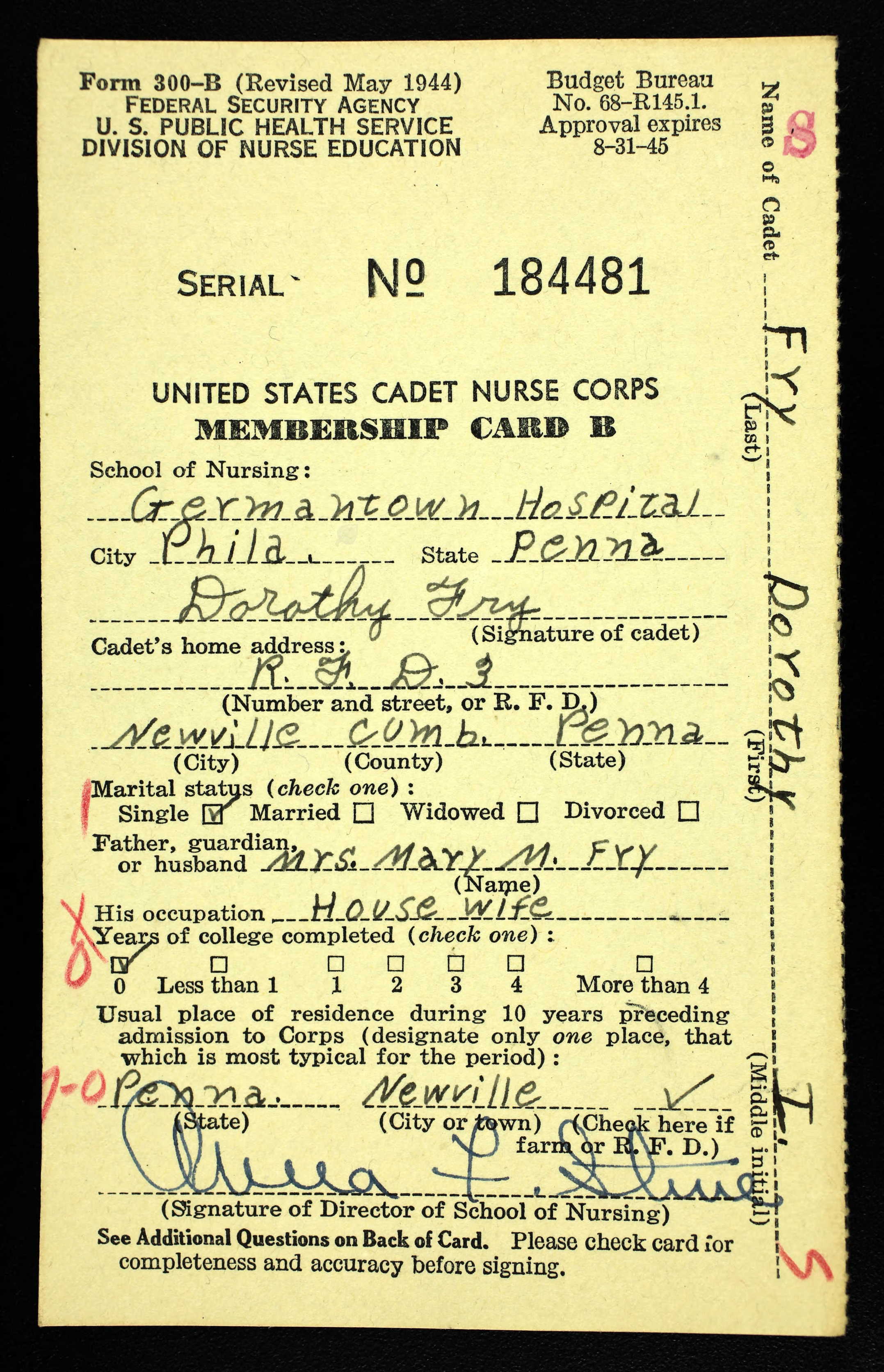 From the membership card which we found via ancestry, we know Dorothy Isabel Fry attended the school of nursing at Germantown Hospital in Philadelphia, Pennsylvania. Her home address was R.F.D. 3, Newville, PA. She was born November 2nd, 1926, and after the CNC became an Ensign in the U.S. Navy. She passed away as Dorothy Isabel Fry Brady on October 26th, 2003.