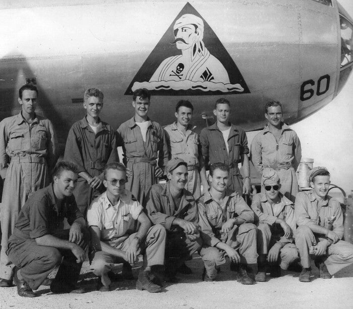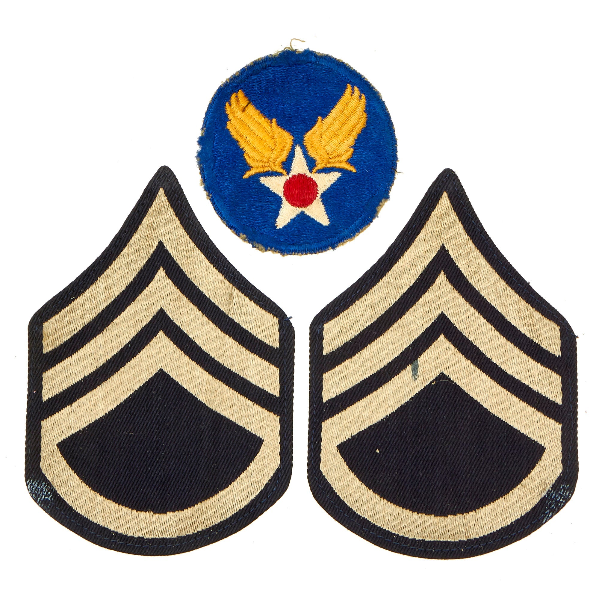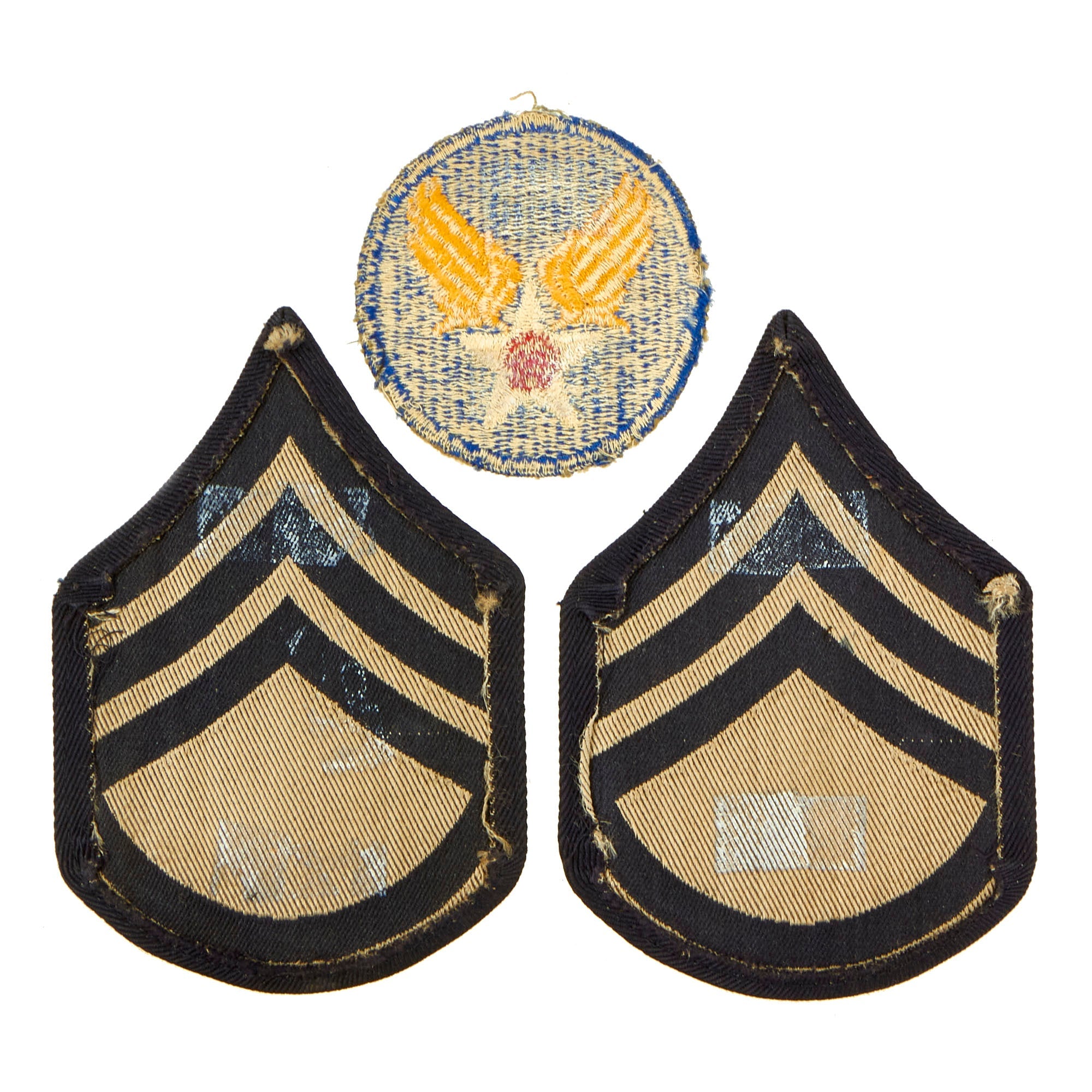 Other items include S/Sgt Majeski’s chevrons (2), Pilot and Crew Member Physical Record Card, Soldier’s Individual Pay Record and a U.S. Army Air Forces shoulder sleeve insignia. All items are in solid condition. We also found a period photo online of Majeski with members of the crew he was in beneath the front of a bomber (not included).