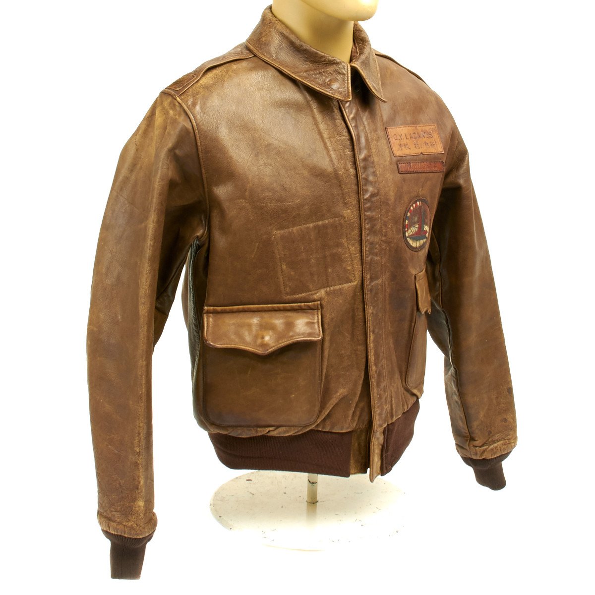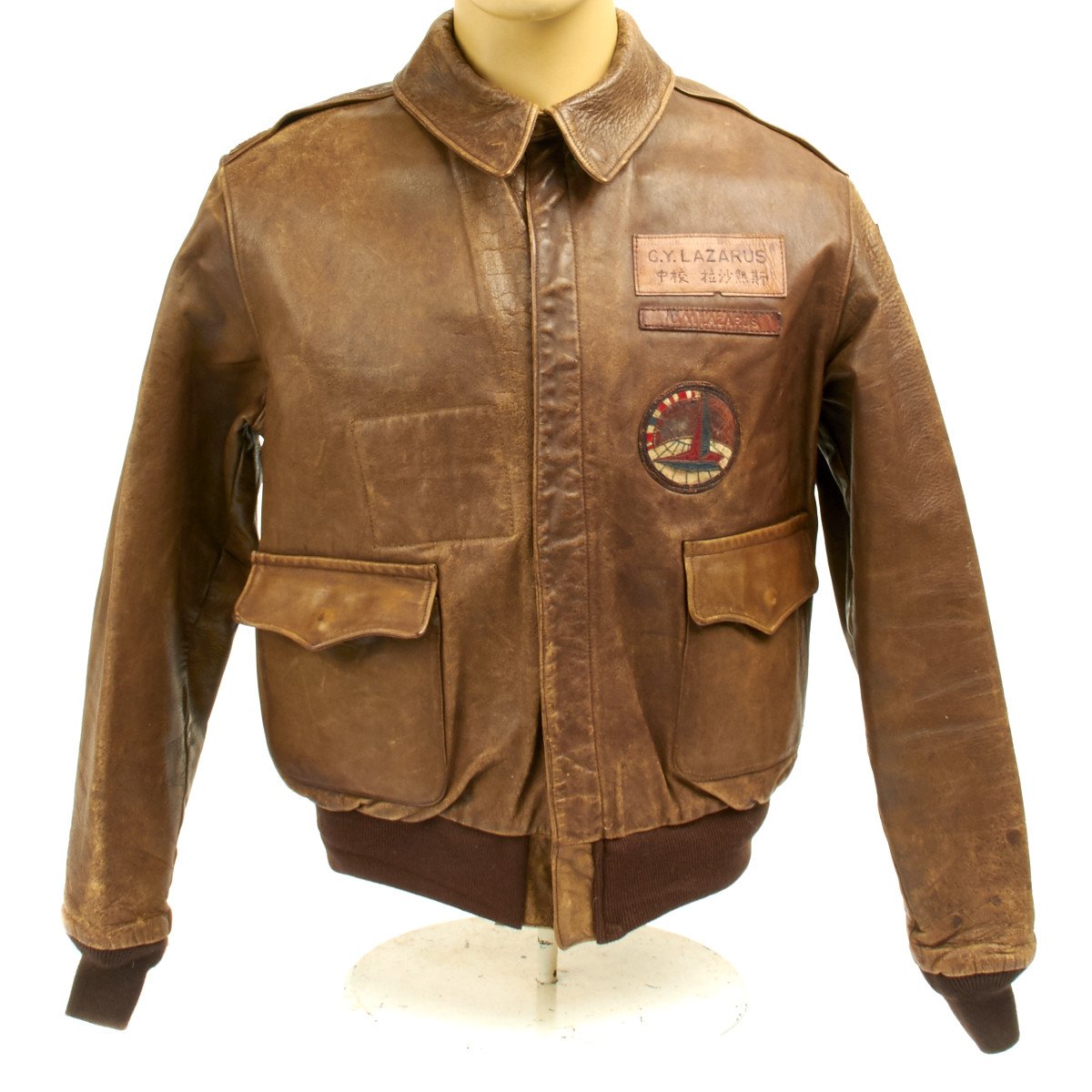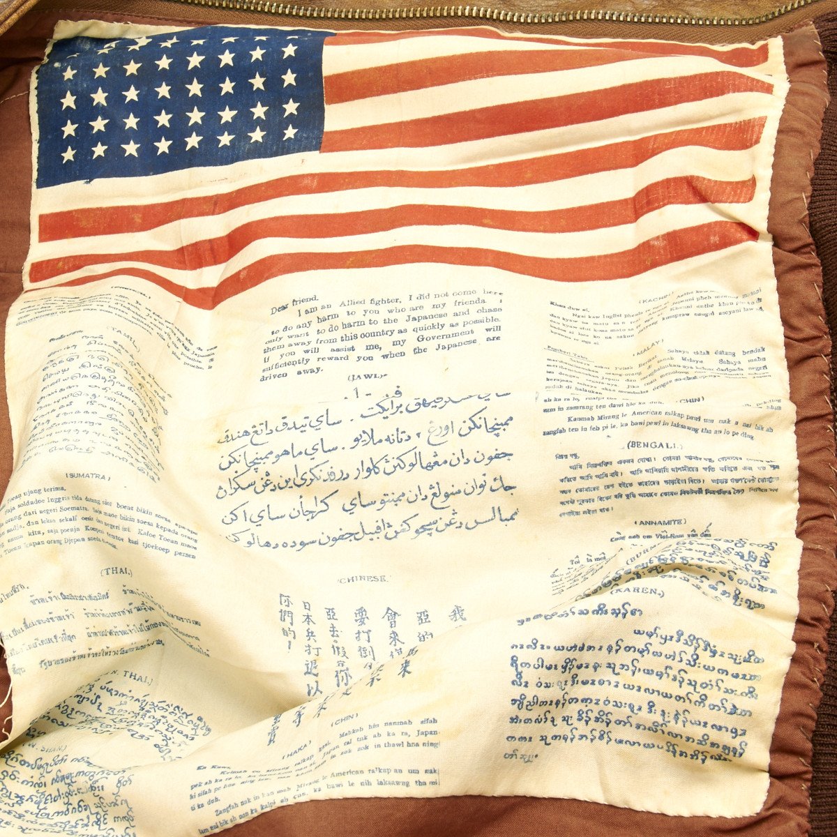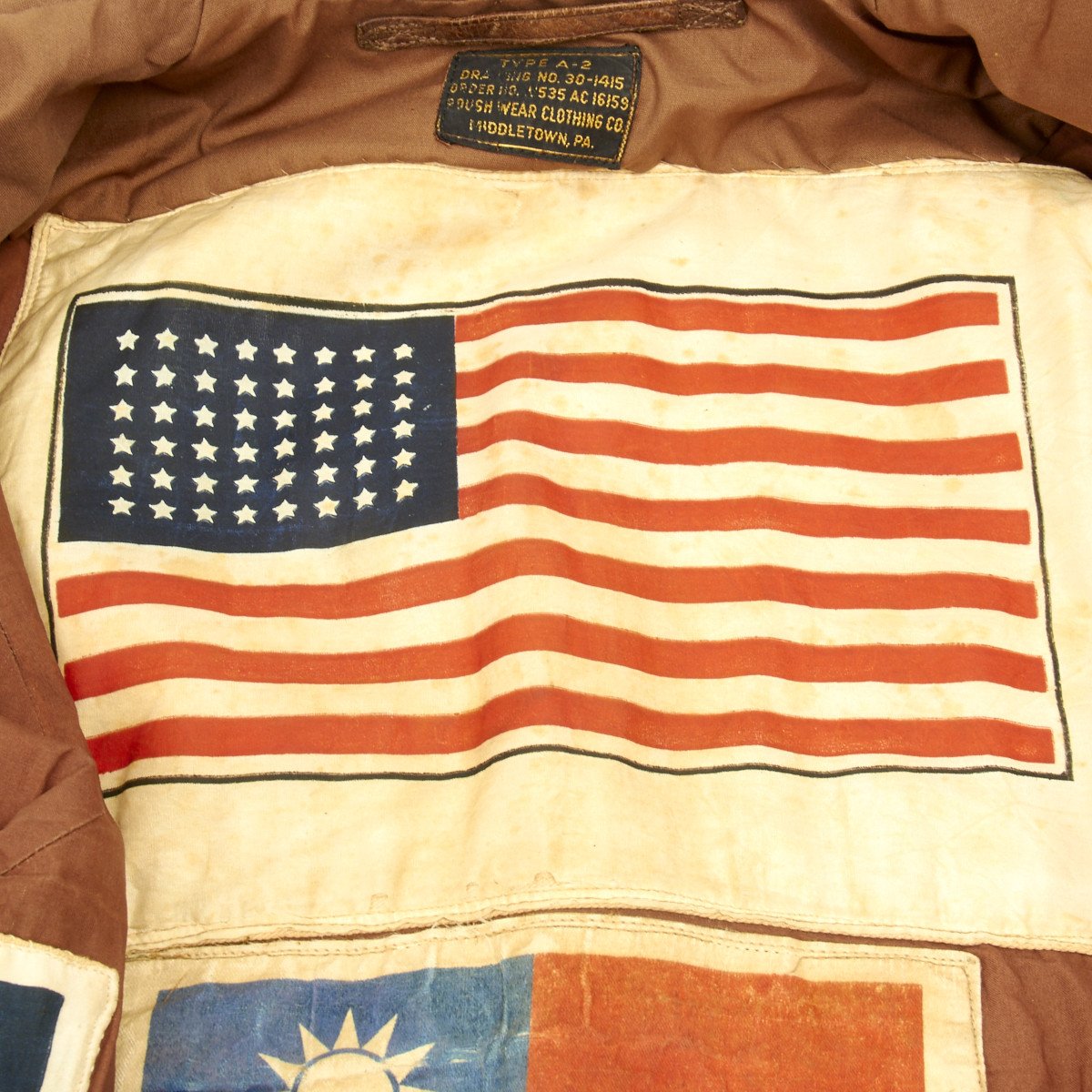 Original Item: One-of-a-kind. This is a jaw-dropping A2 leather flight jacket issued to a pilot who served in the Pacific Theatre during WW2. It is in wonderful condition in a large size. All aspects of this jacket are genuine WW2 (yes even the reddish hue waist and cuff bands) including some of the most detailed silk Blood Chits we have ever seen!