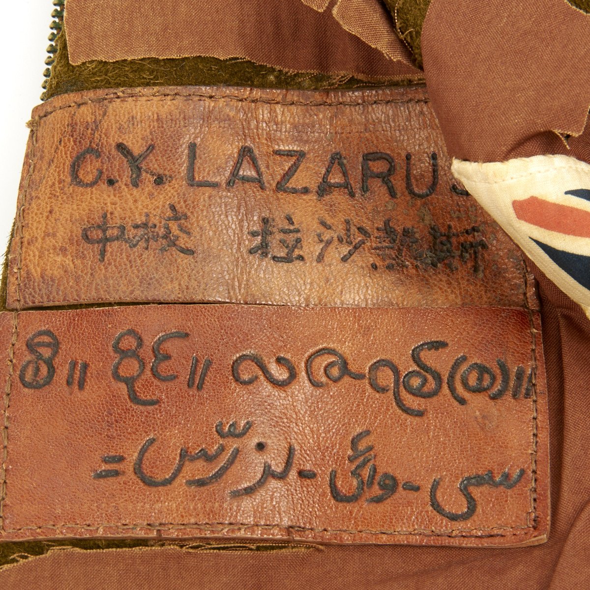 Included with this jacket is a 20 page interview with Major Cyrus Lazarus about his experiences during the war. Some of the stories will stop your breath they are so compelling and detailed. This jacket comes directly from his family and the provenance cannot be disputed. Of particular note are the theater made leather squadron patch, theater made leather CBI patch, name patches (both in English and Cambodian) and the leather Major's insignia.