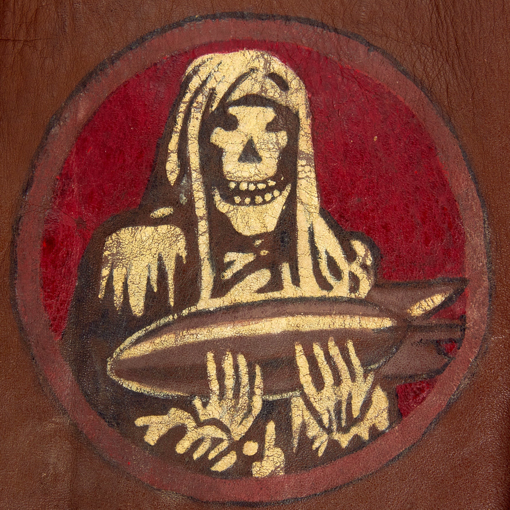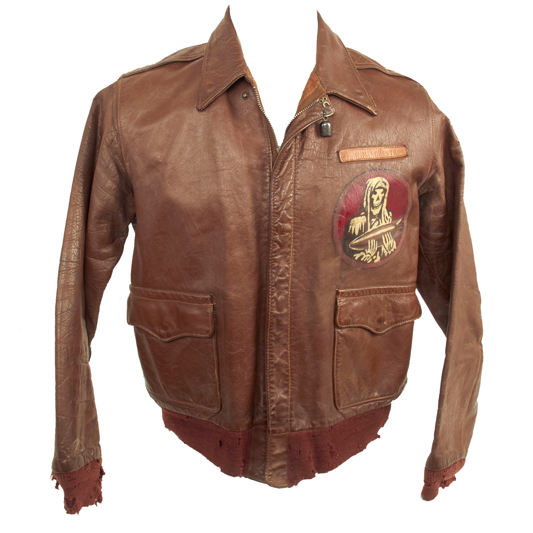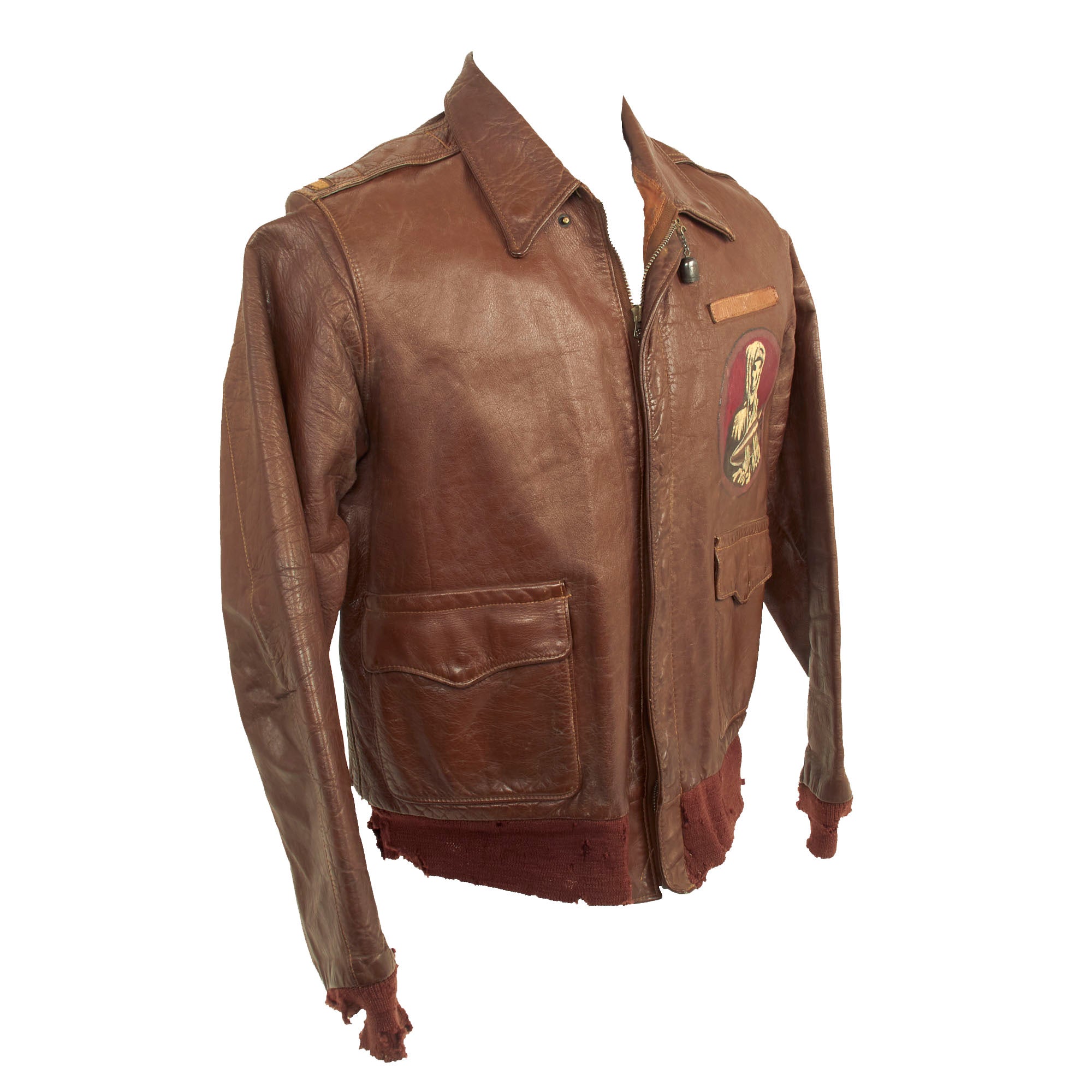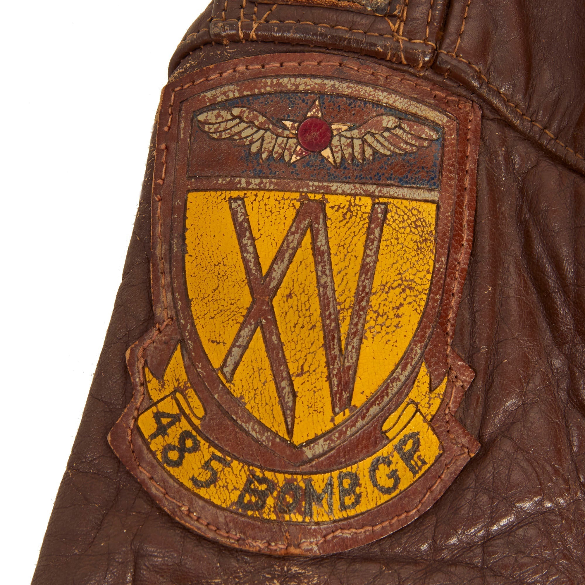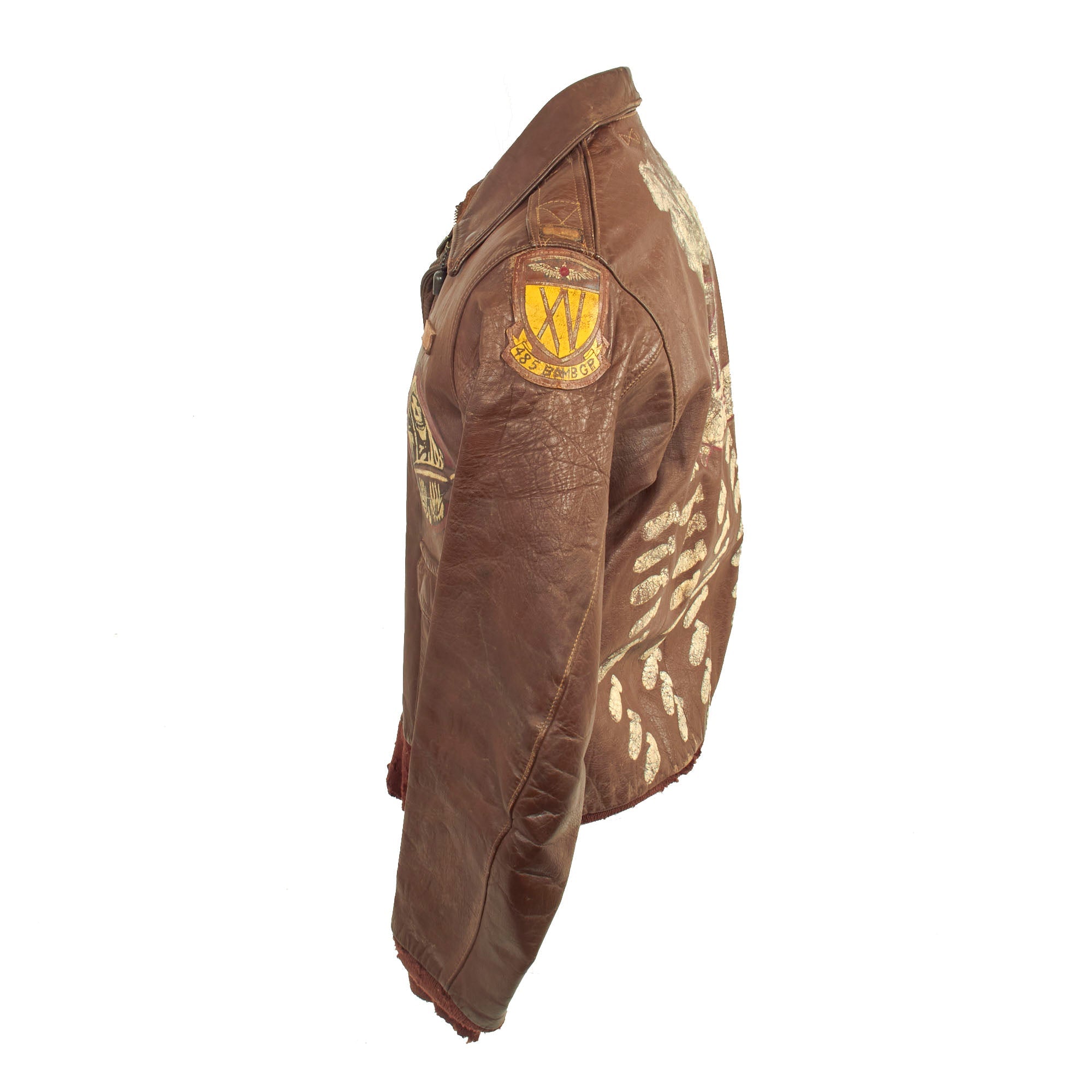 The A-2 jacket, which is in wonderful condition with fantastic hand painted insignia. The left chest features an incredibly painted Grim Reaper cradling a bomb. The colors vivid and discernible. Below the squadron insignia is a small leather name tag which faintly reads as W. M. ROBERTS. The left shoulder has a beautiful Italian made multi-piece painted leather 485th Bomb Group patch which features a large “XV” below an Army Air Forces winged insignia and in the rocker at the bottom is 485 BOMB GP.