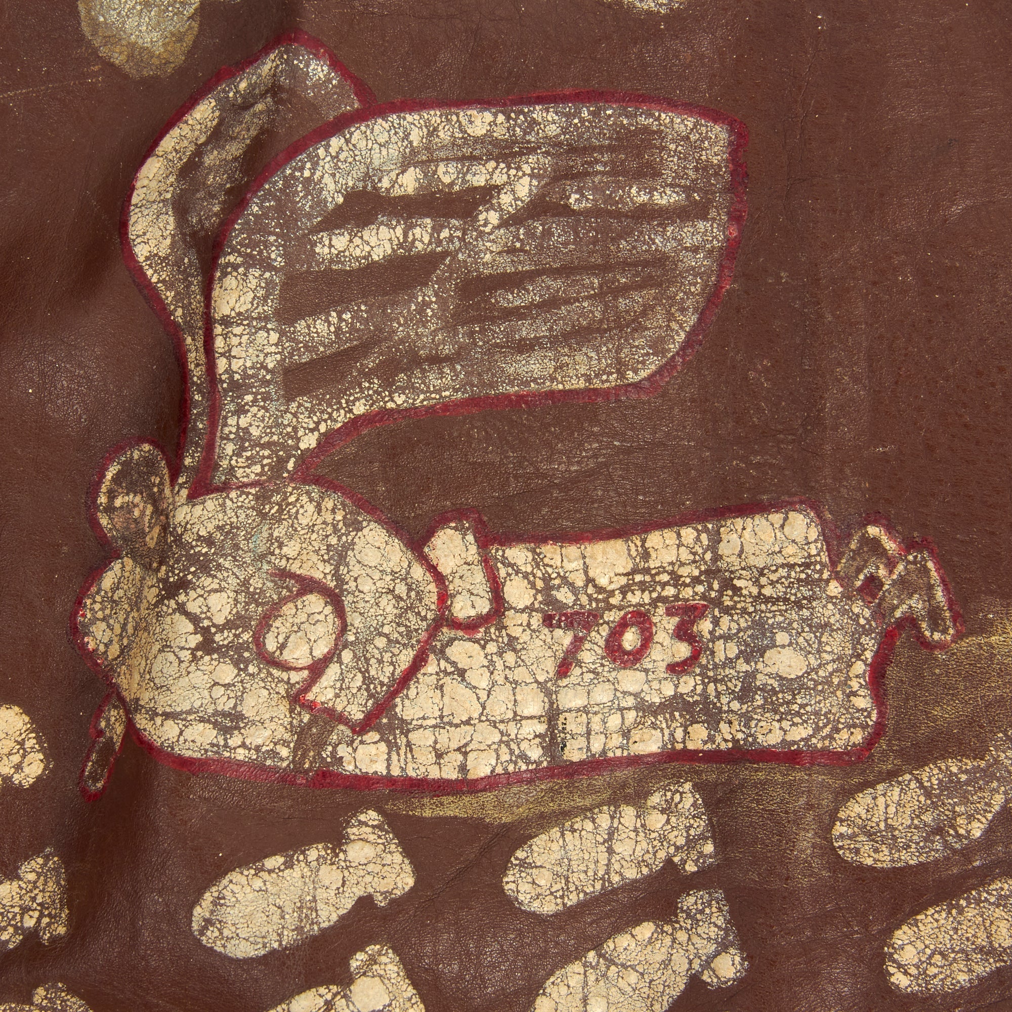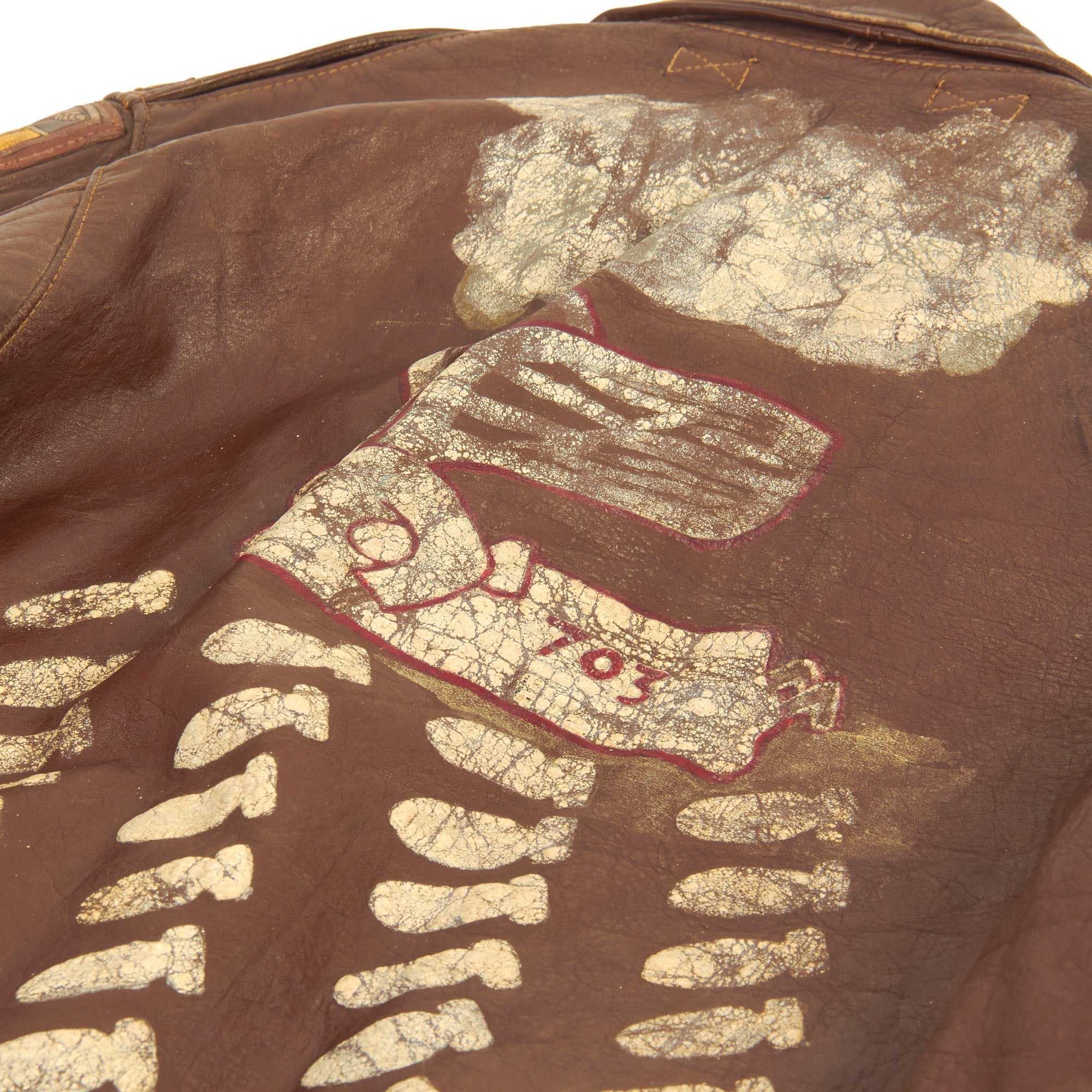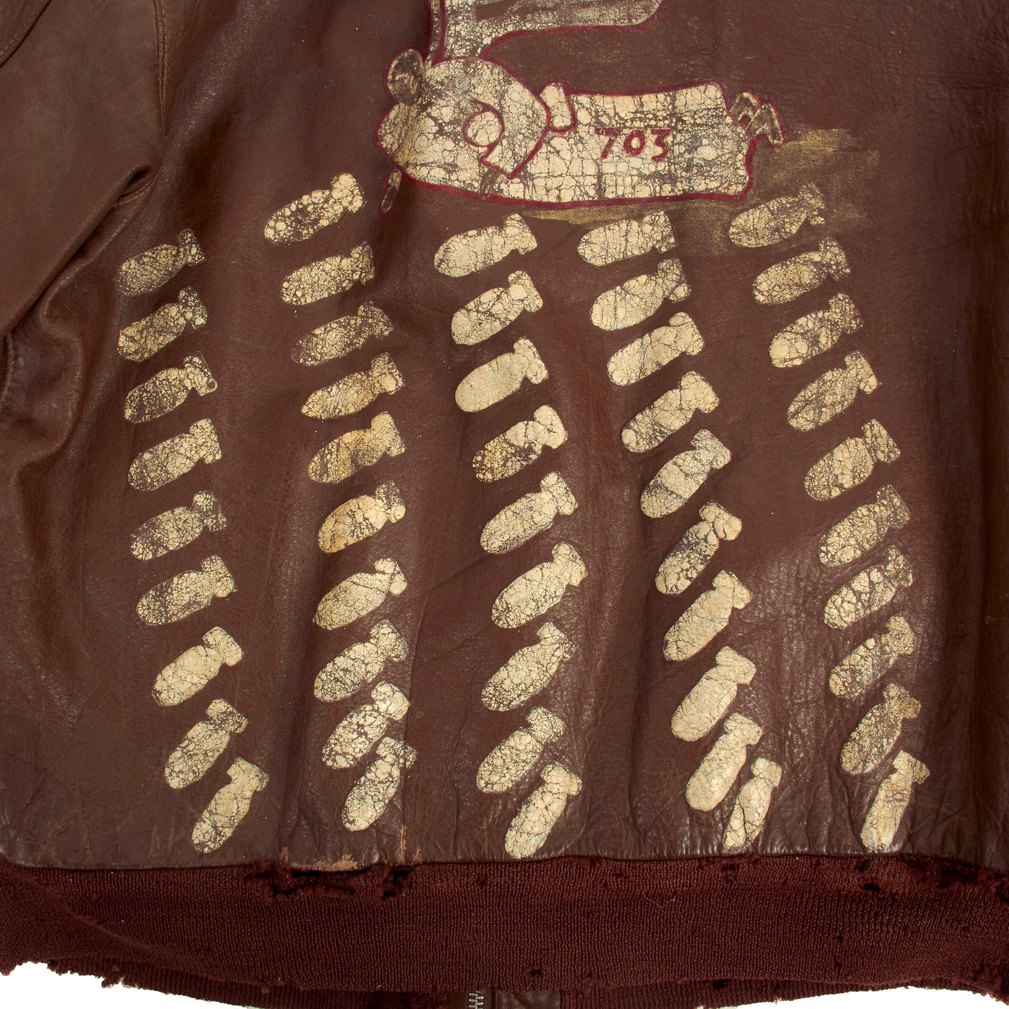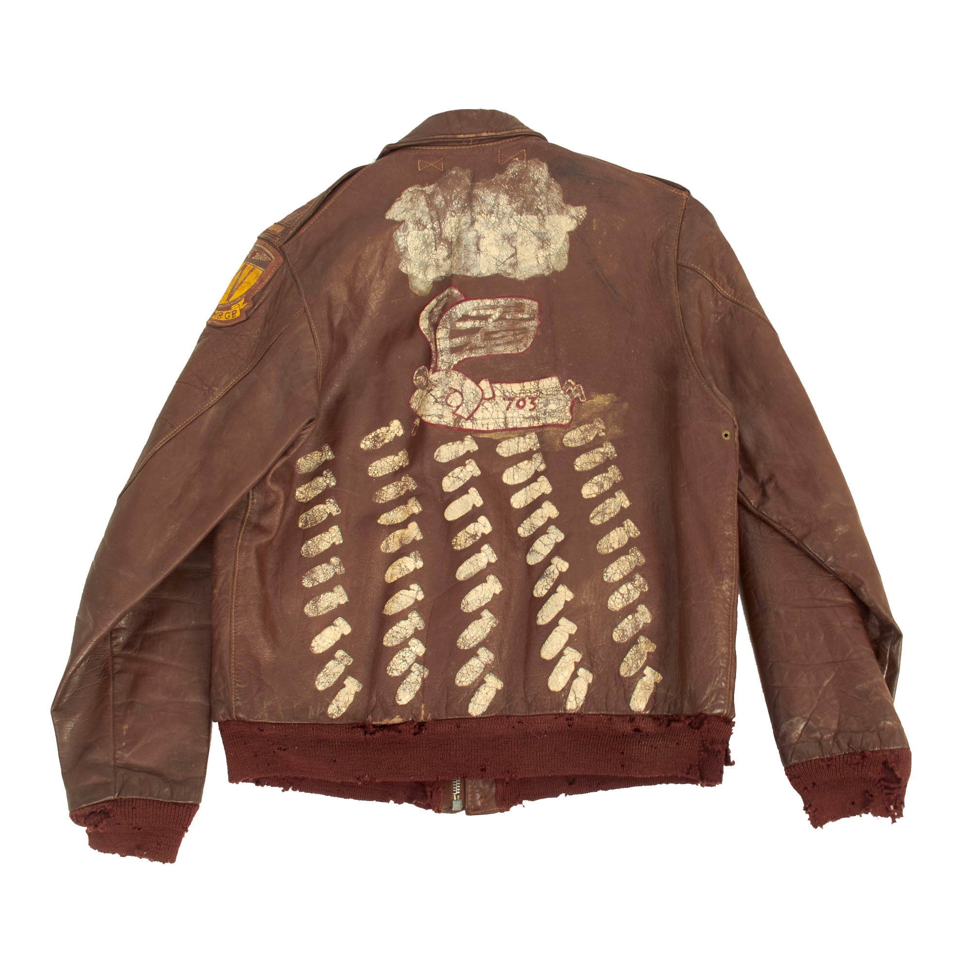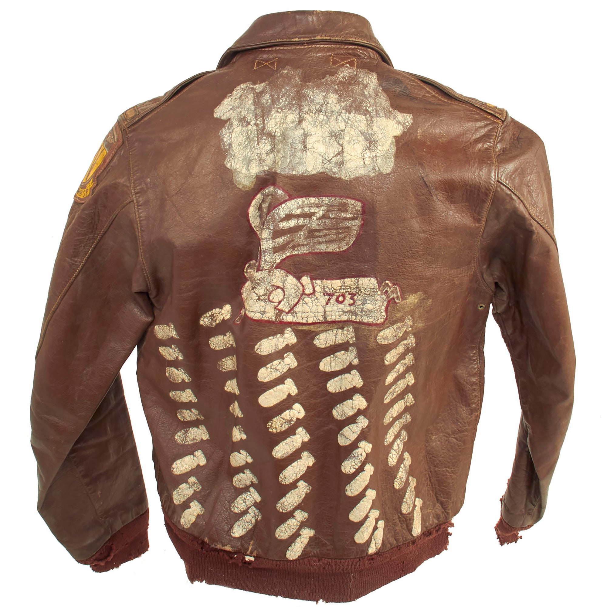The reverse of the jacket has an Angel riding a bomb with the number 703 near the tail fins. Beneath this image are 48 falling bombs signifying how many combat missions he participated in.