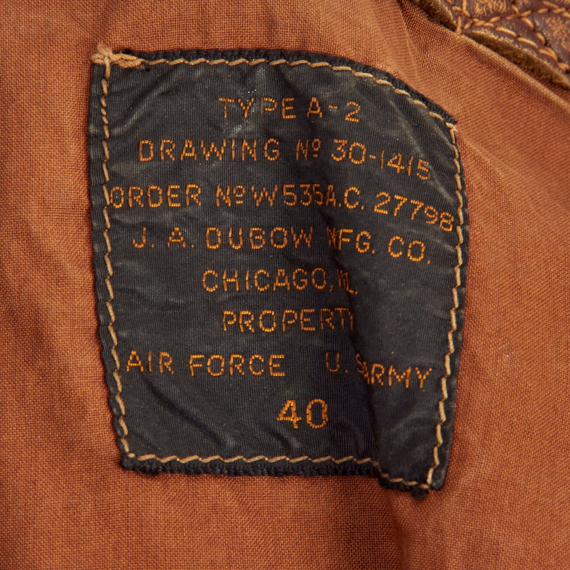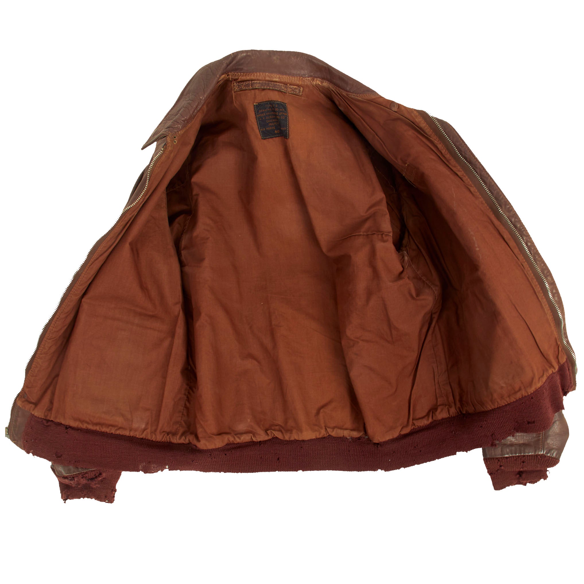 Jacket is in size US 40 and has retained all original components including original knit waist band and sleeve cuffs, something we often see replaced on A-2 jackets that saw extensive service. Also original is the TALON brand zipper which is still functional. Both epaulets have a painted Lieutenant bar.