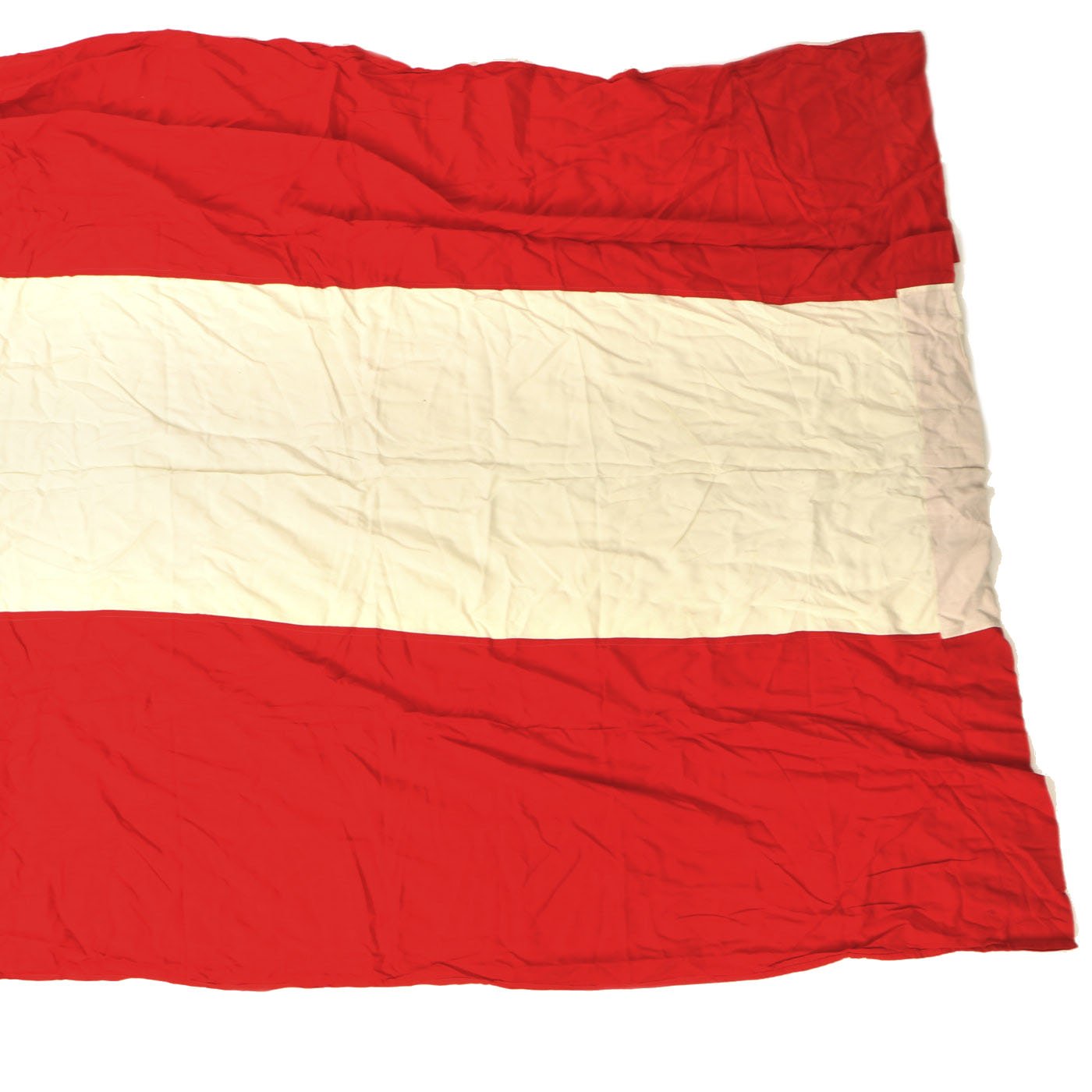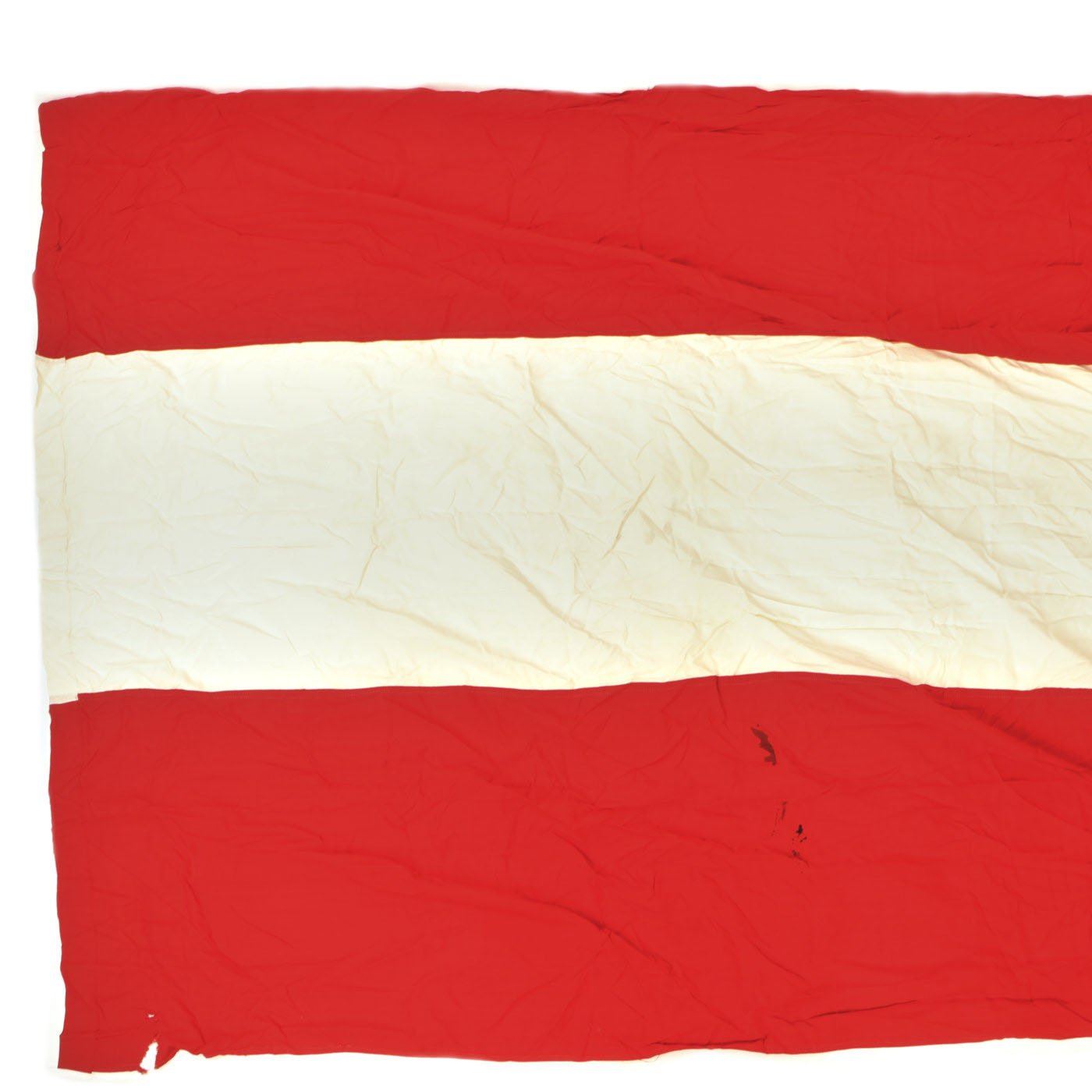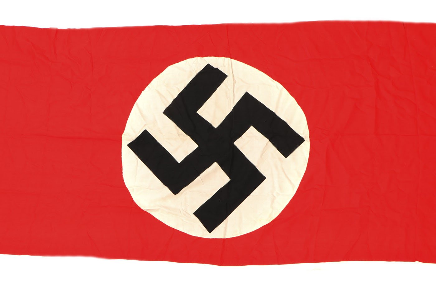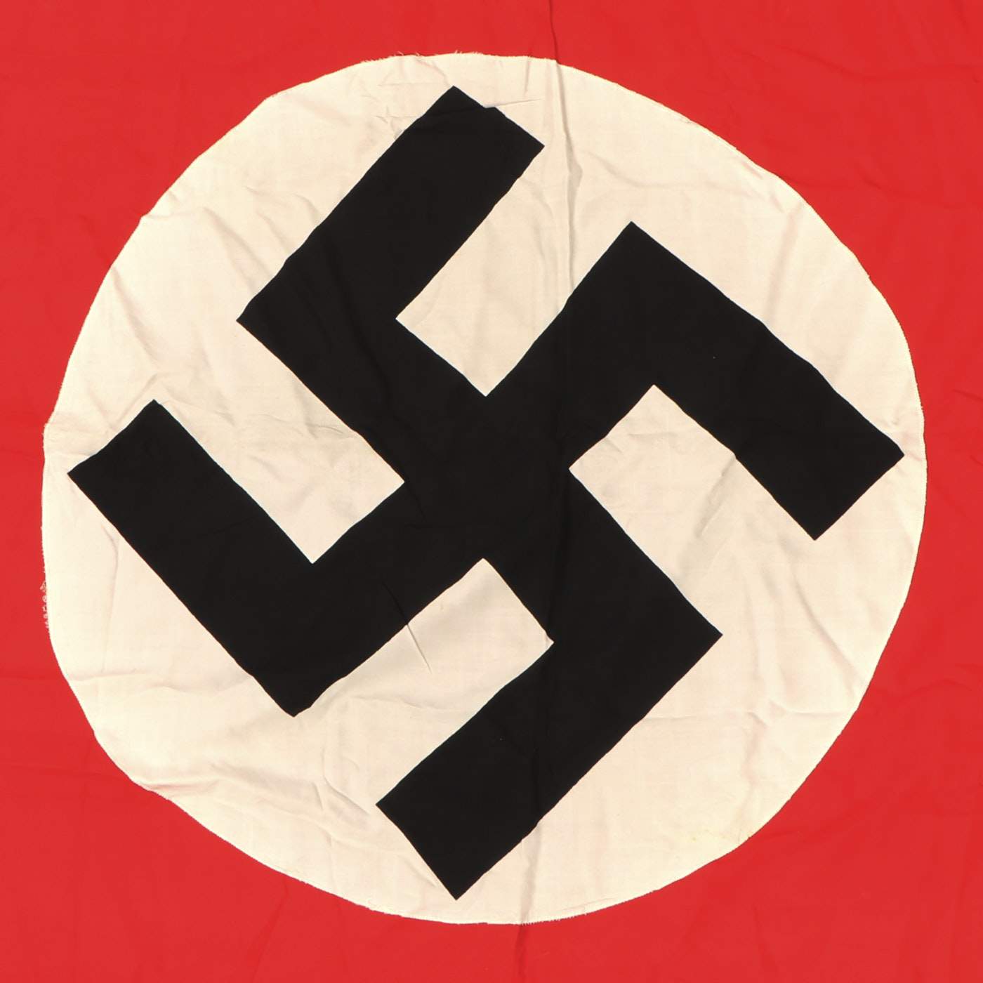 - One Original German WWII NSDAP Double sided Parade or Building banner. It is the standard red cotton body with sewn on dyed white circles bearing the Swas (hook cross) insignia of the NSDAP. This large banner measures 114"L by 38"W, or approximately 9 1/2' long by 3' wide, definitely at least parade size. condition looks to be nearly unused, and it has the correct hanging sleeve at the top. This is marked 100 300, for 100cm x 300cm.