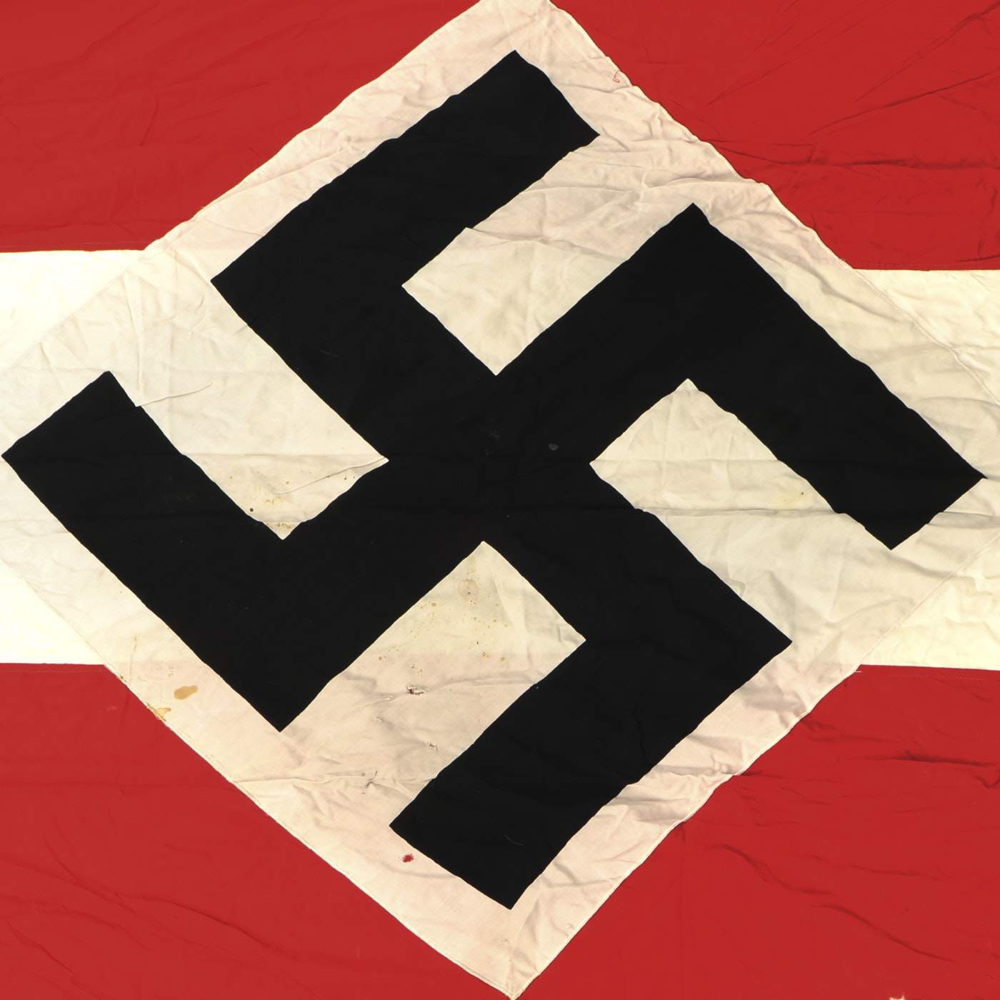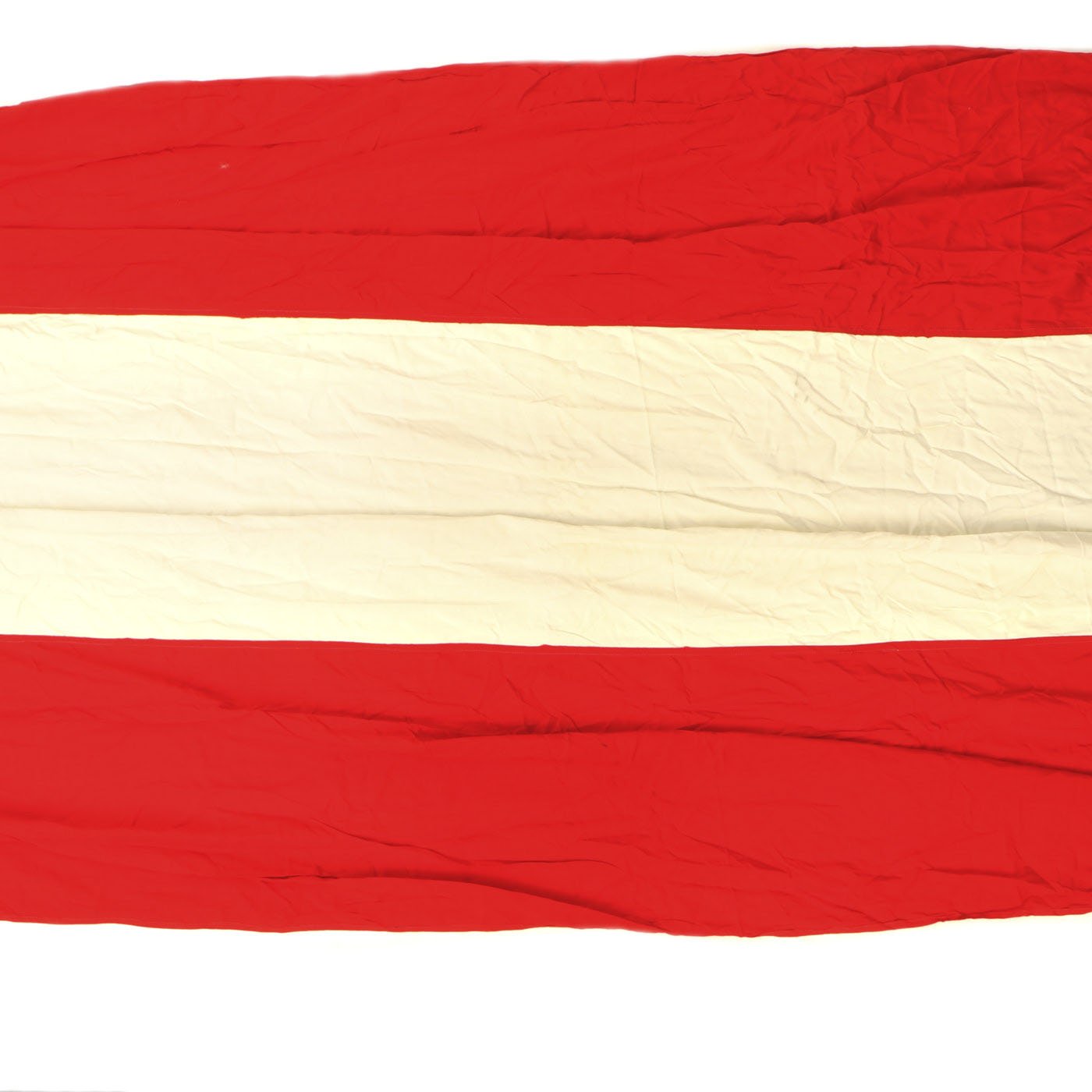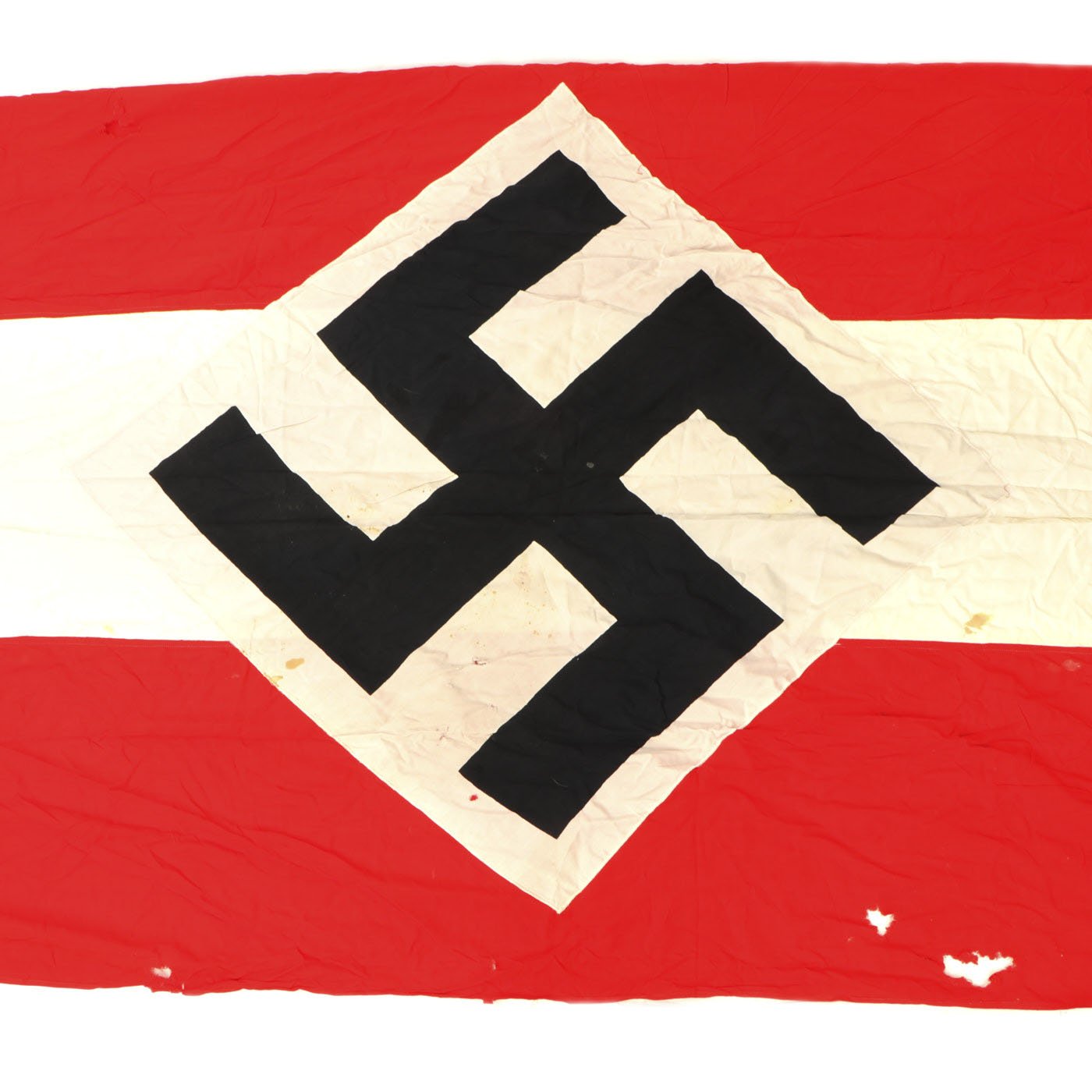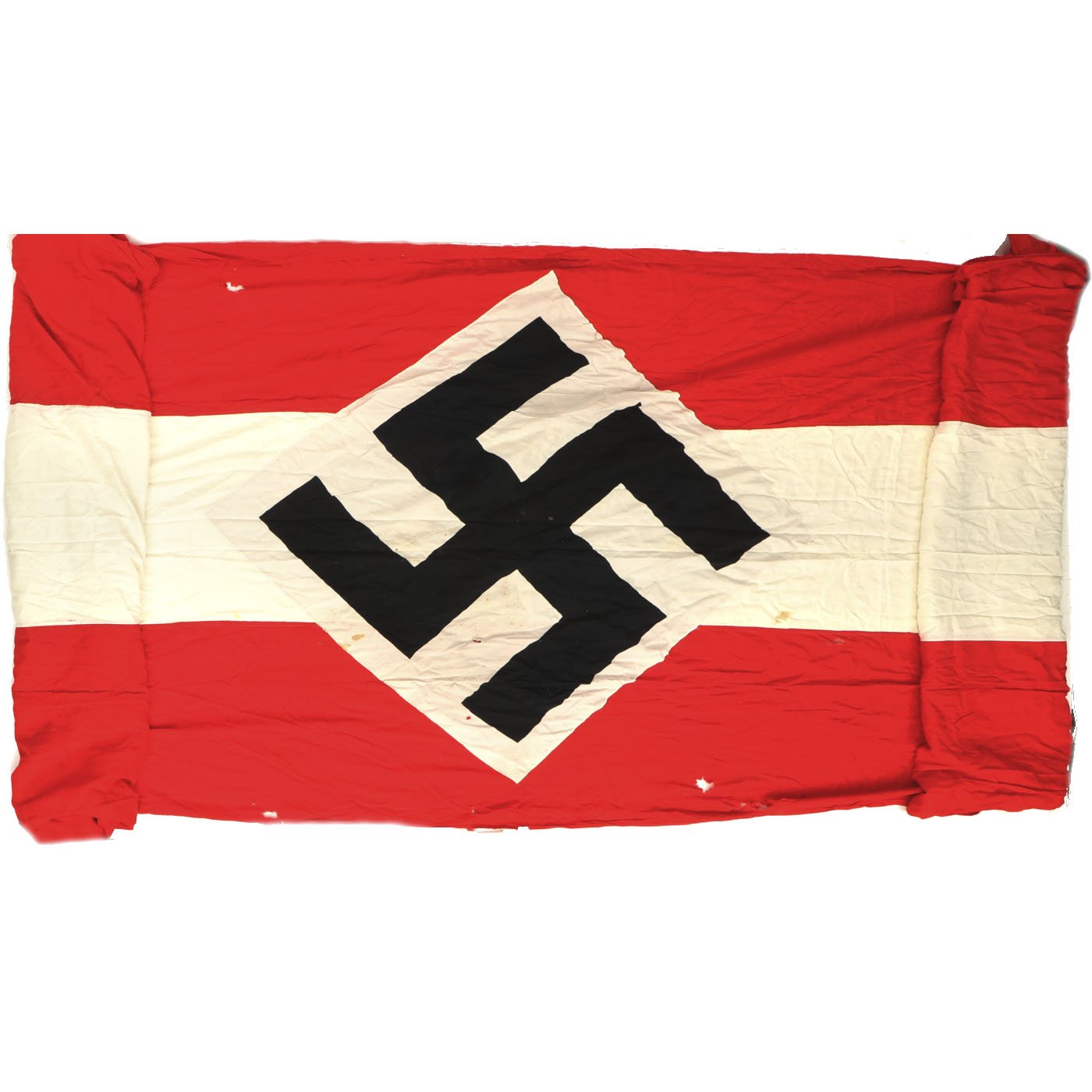- Original German WWII HJ Double Sided Building Banner. The body of this banner is the standard red with a white stripe in the middle of the HJ, each made of a different piece of fabric. Sewn into the middle of each side is a diamond bearing the Swas (hook cross) insignia of the HJ. This very large banner measures 254" x 54", or approximately 21 1/6' long by 4 1/2' wide. There is wear and some small tears in this banner, so it was most likely hanging on a building for a while before it was captured.
