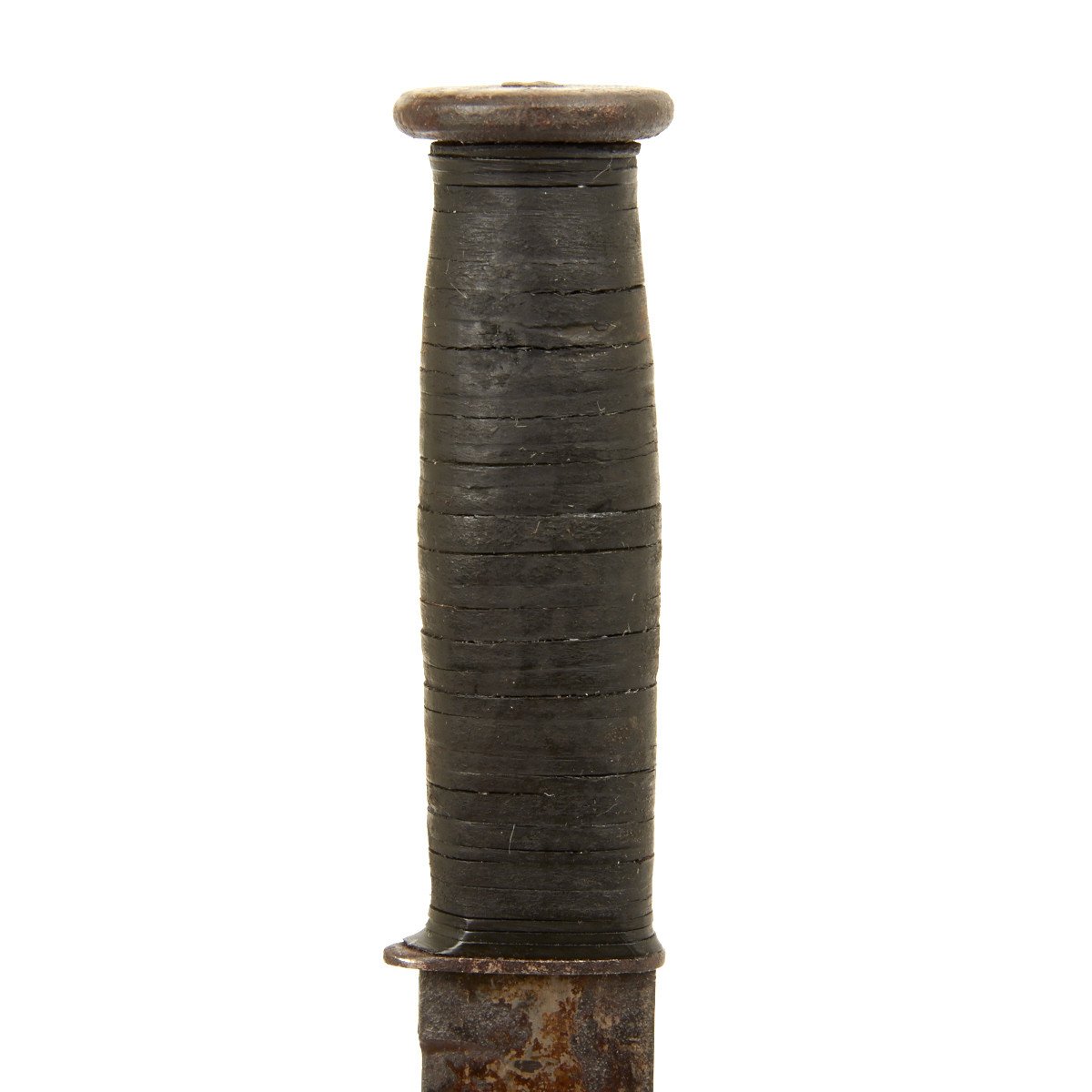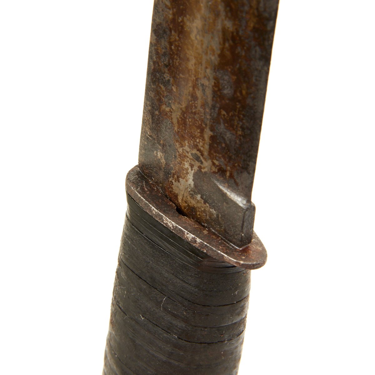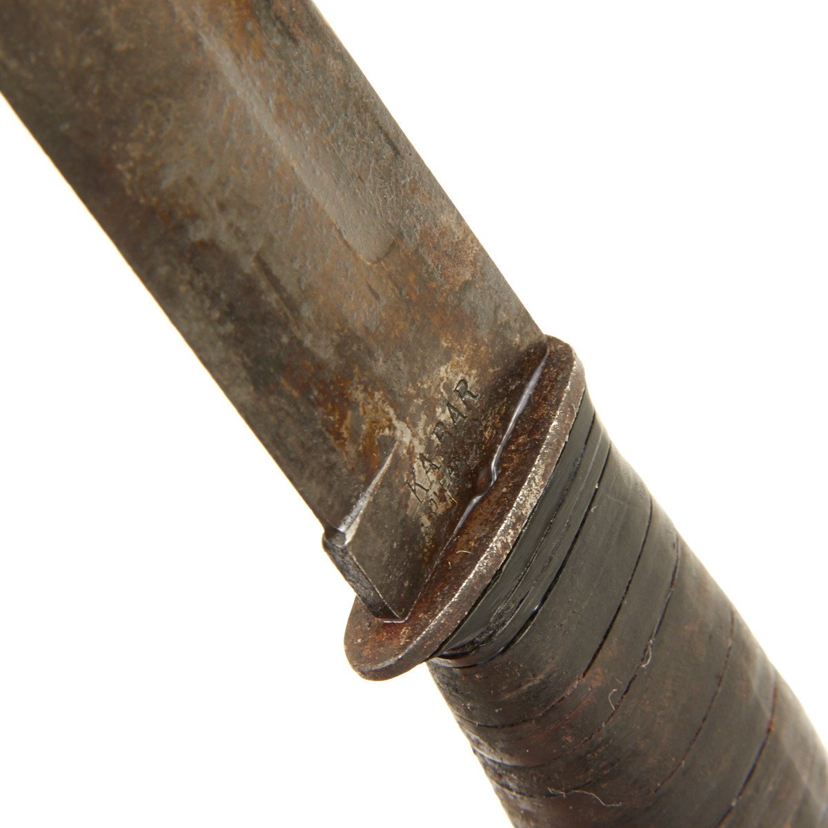 Original Item: One-of-a-kind. Offered in solid condition with use wear to leather handle washers and surface of leather sheath. Blade displays period sharpening and is nicely stamped KA-BAR OLEAN, N.Y.