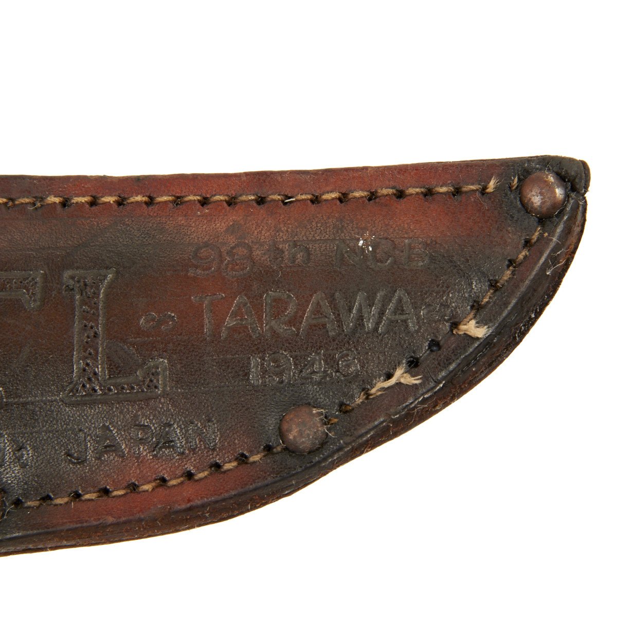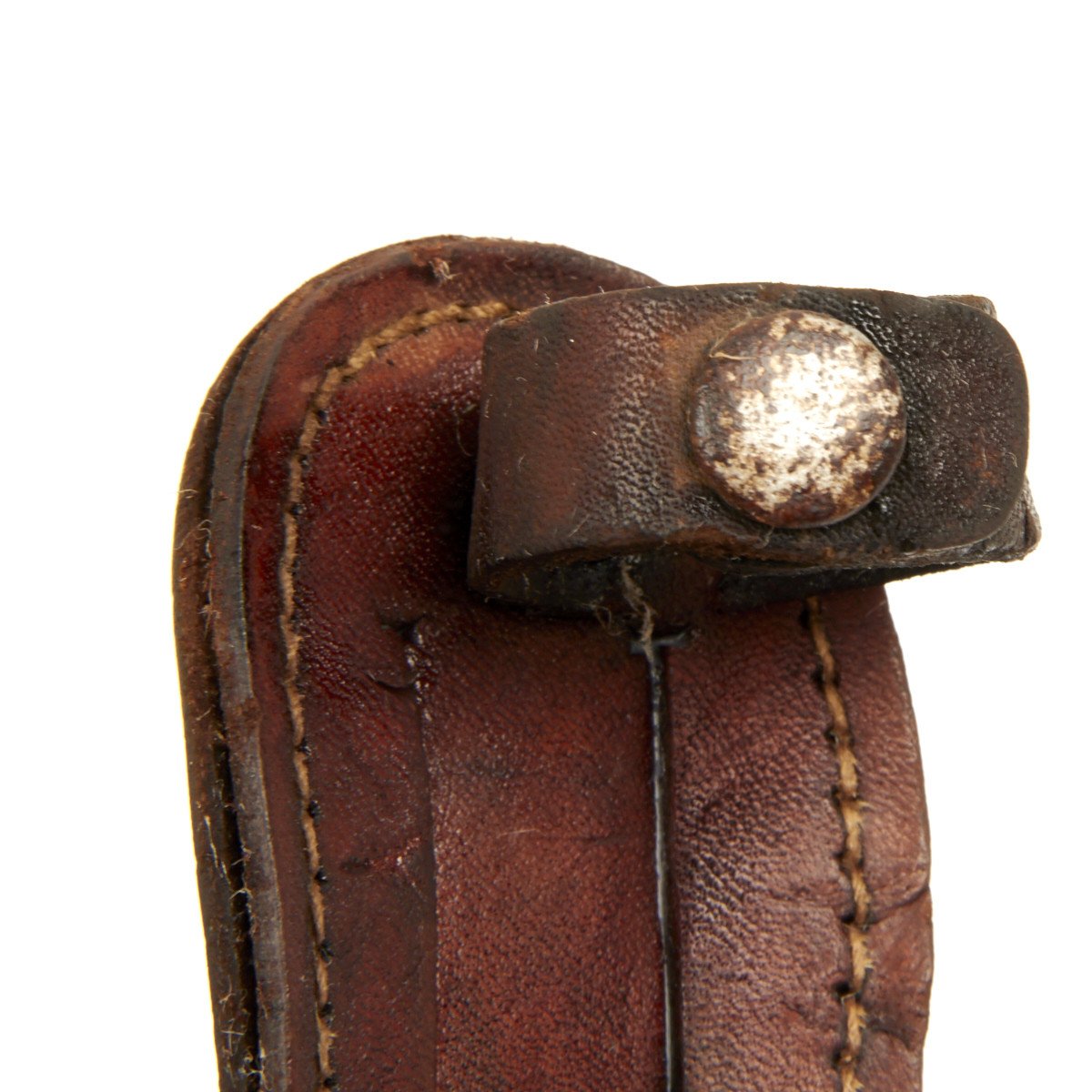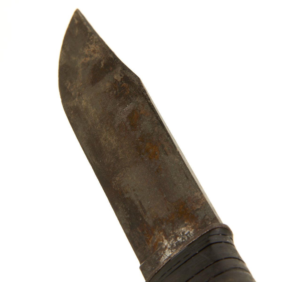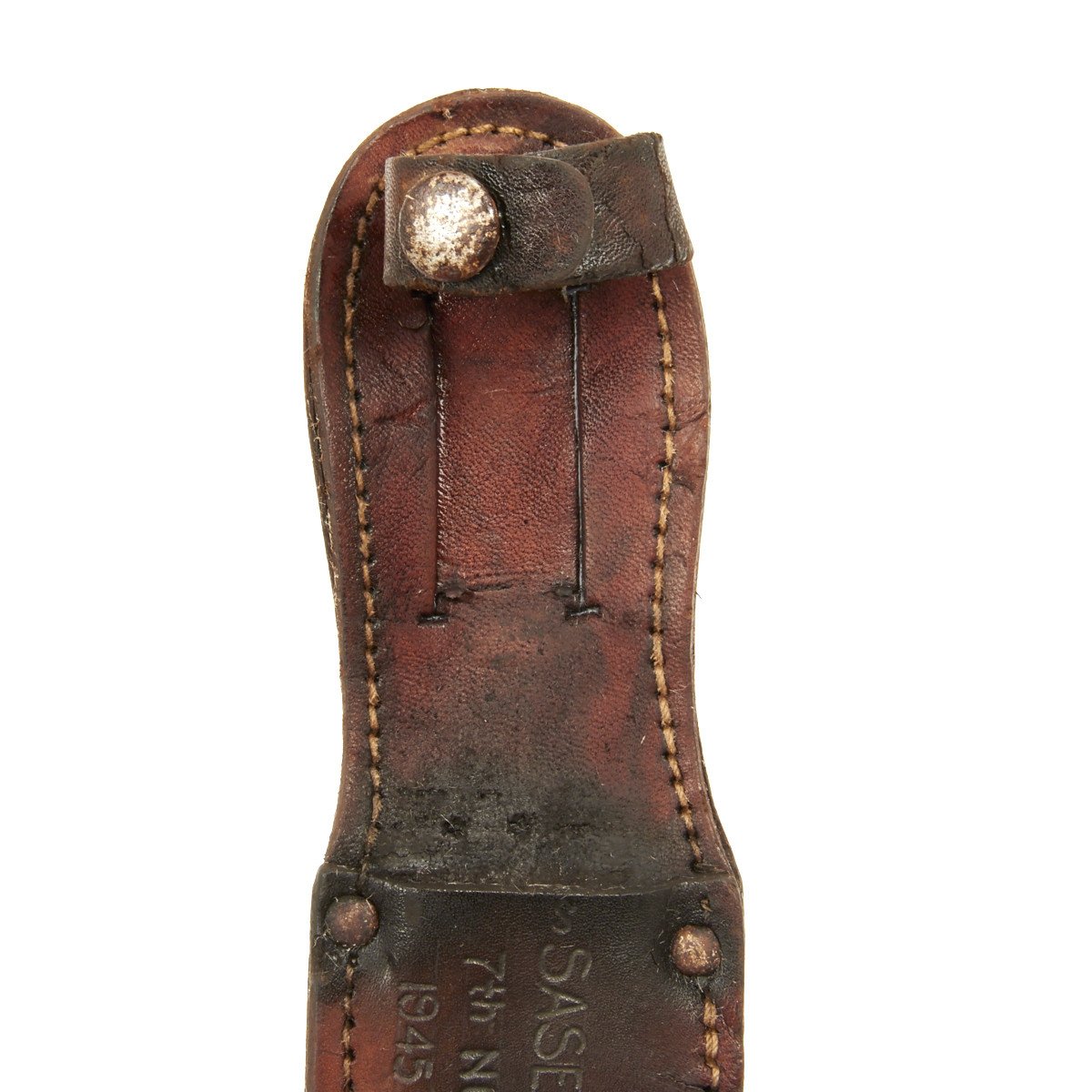 Original Item: One-of-a-kind. Offered in solid condition with use wear to leather handle washers and surface of leather sheath. Blade displays period sharpening and is nicely stamped KA-BAR OLEAN, N.Y.