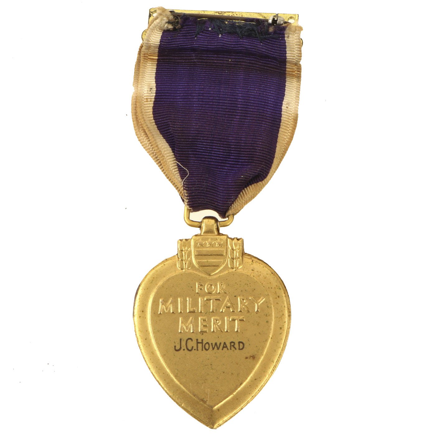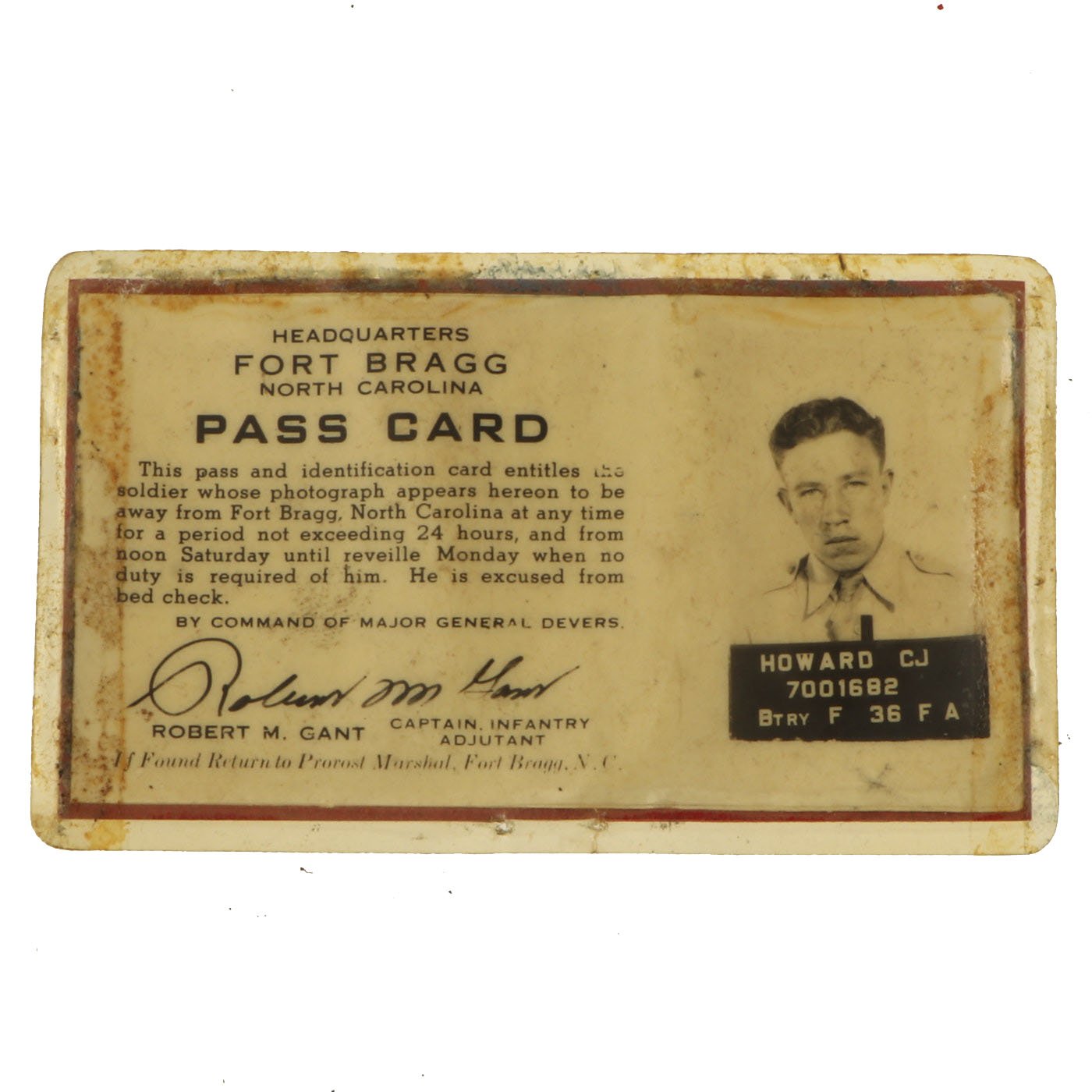 Original Item: This WWII Purple Heart Medal is engraved on the reverse J.C. HOWARD. Private Howard (ASN 7001682) was Killed in Action and we include a copy of a roster of KIA soldiers from Oconee County, South Carolina. Included with the medal is the original case and lower portion of the cardboard storage box. We also have hi Fort Bragg, North Carolina Identification Card with a photo of him where it designates that he was assigned to Battery F, 36th Field Artillery Regiment.