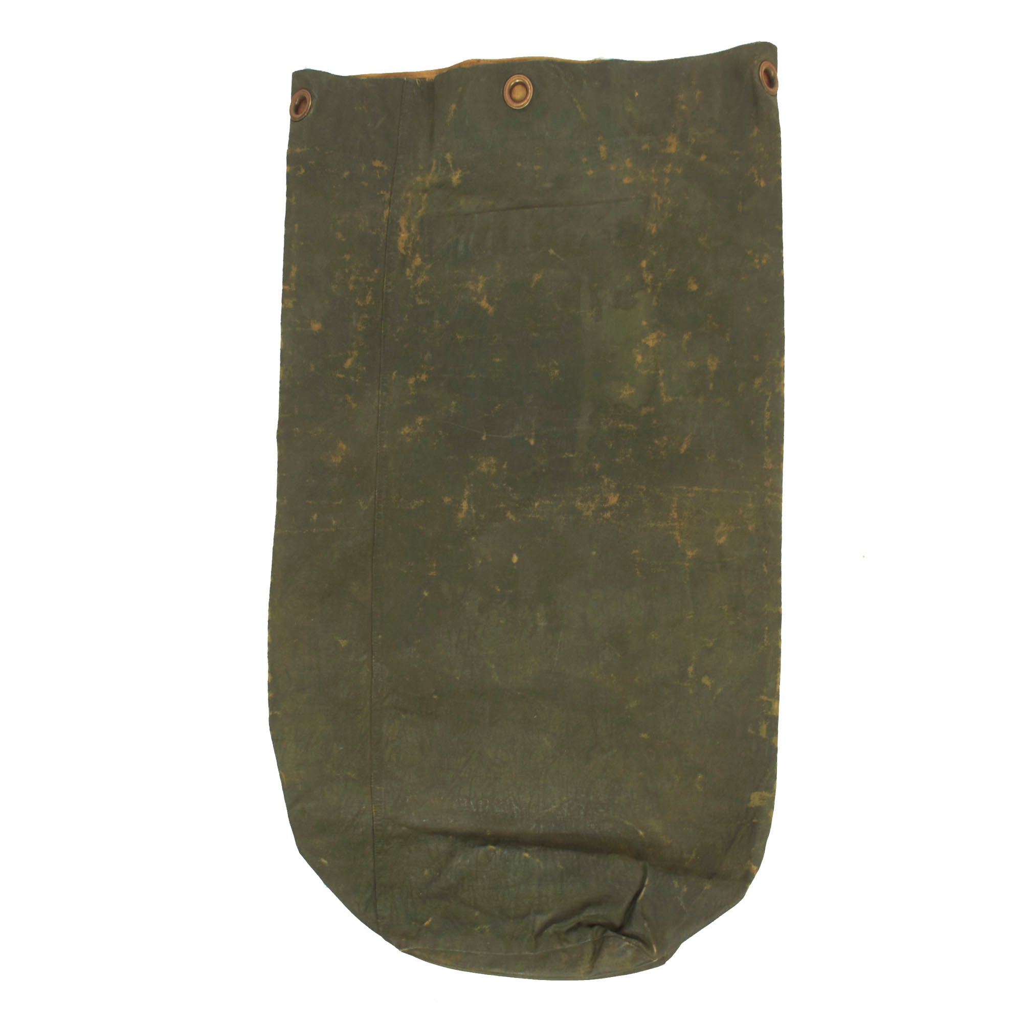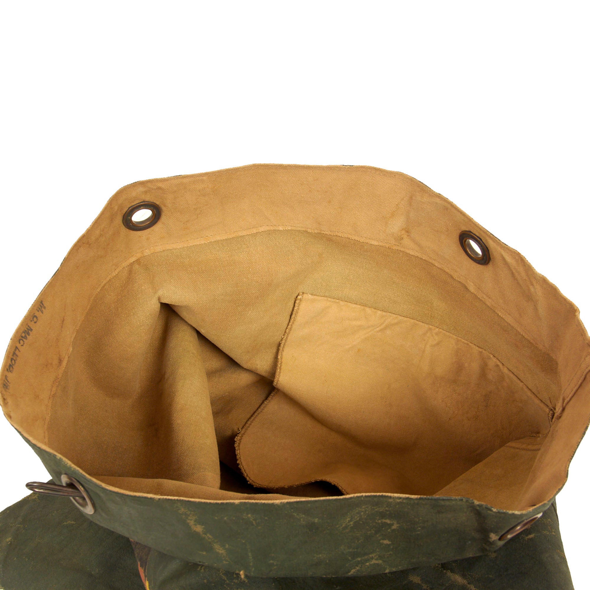 Original Item: One-Of-A-Kind. This is a beautiful memento of WWII. The Marine that owned this “sea bag” was of some artistic talent when it came to painting the image on the bag. The bag itself was originally khaki in color but was painted over with a “rubberized” type of green paint and then painted a lovely Hawaiian woman with the text “Vicky / Over 21”. We have not been able to locate any information on this, we do not know if this was the name of an aircraft or possibly an armored vehicle/tank. The inside lip of the bag itself is stamped in two different places with the name M. C. MACLEOD JR. Again, we have not been able to locate any service information on this Soldier/Marine, making for a wonderful research opportunity.