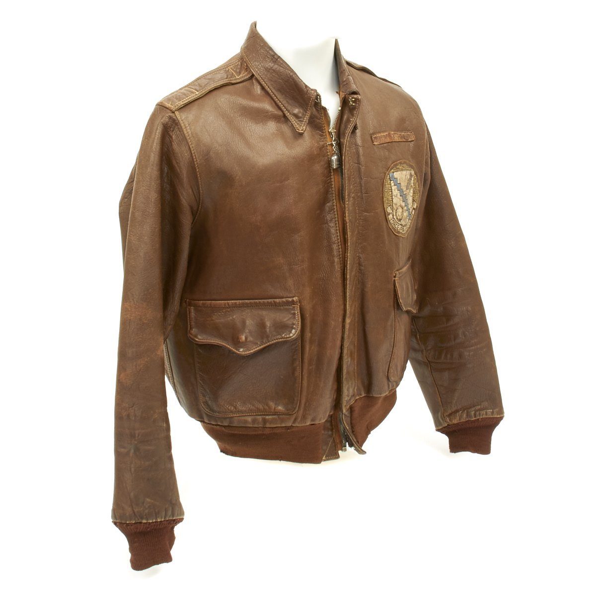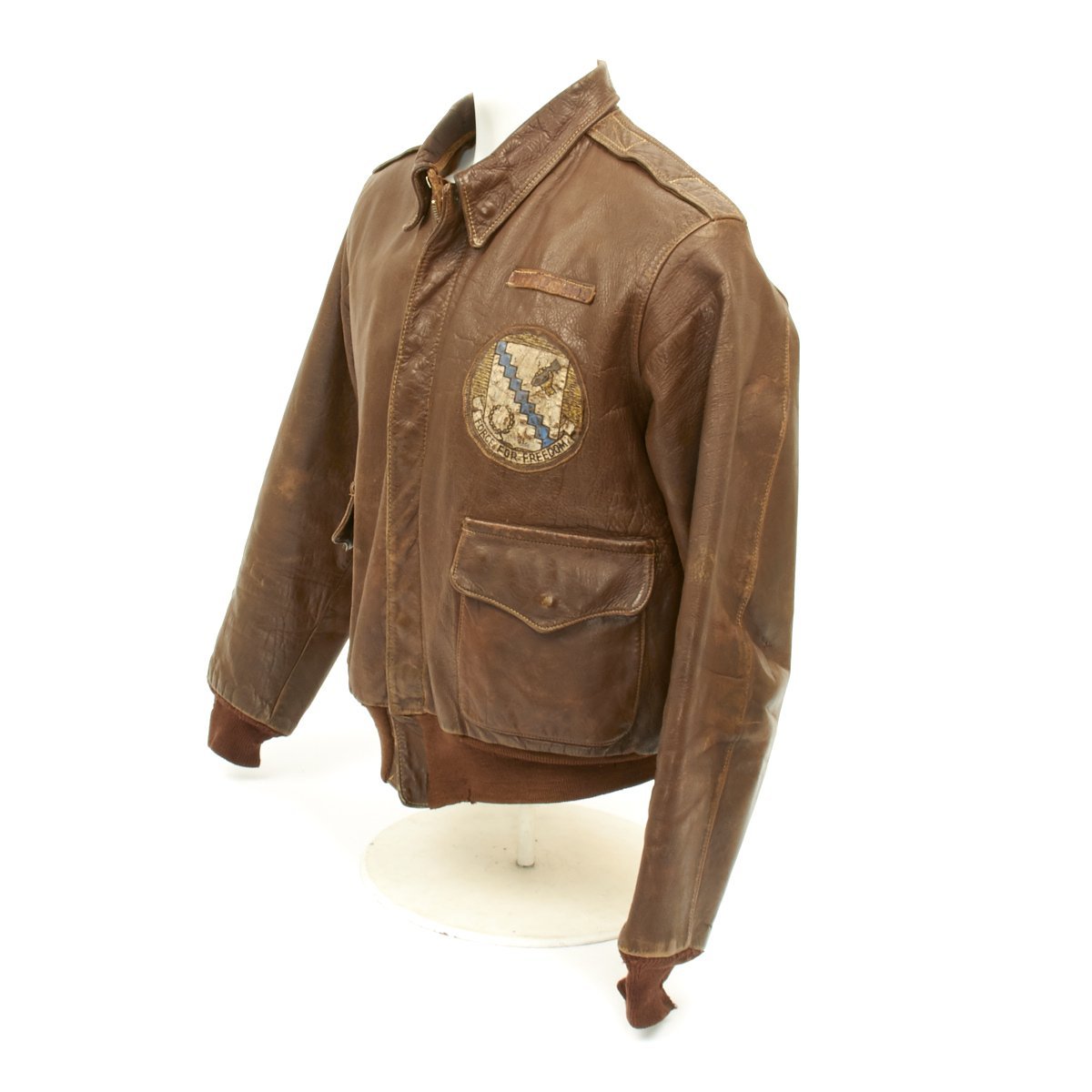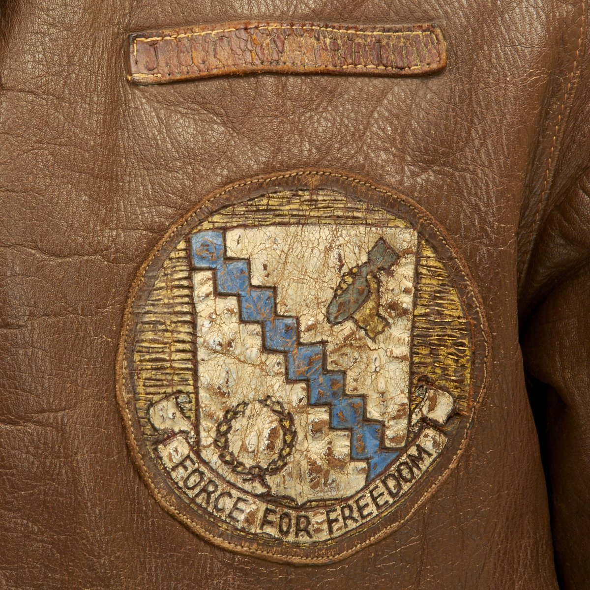 This wonderful A2 leather flight jacket issued to John H. Campbell, a lead navigator in the 98th Bombardment Group. This jacket comes complete with an extremely rare Italian-Incised "Force for Freedom" 98th Bomb group patch sewn underneath the name label reading J. H. CAMPBELL.