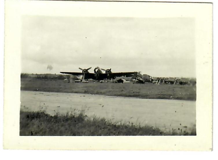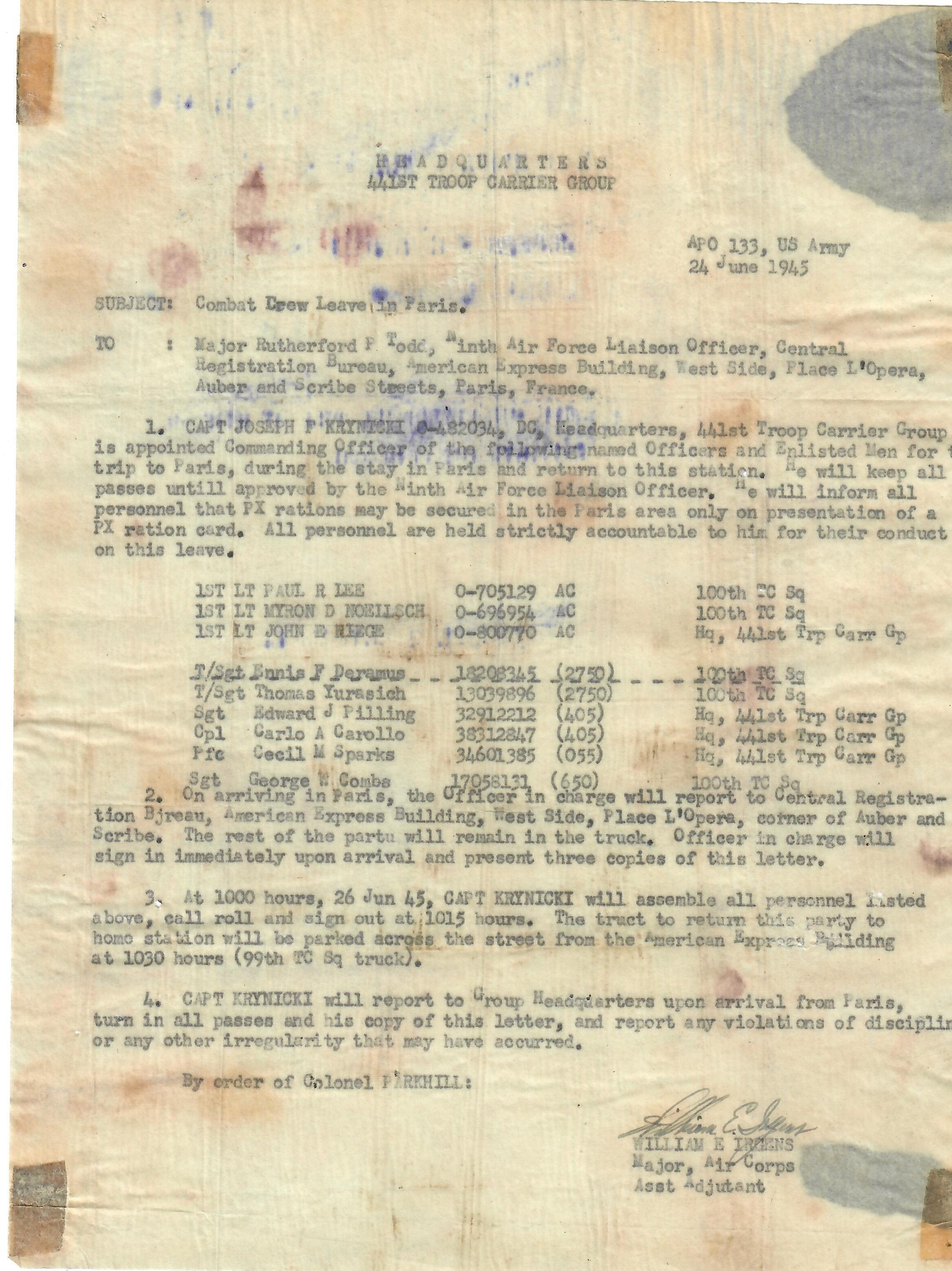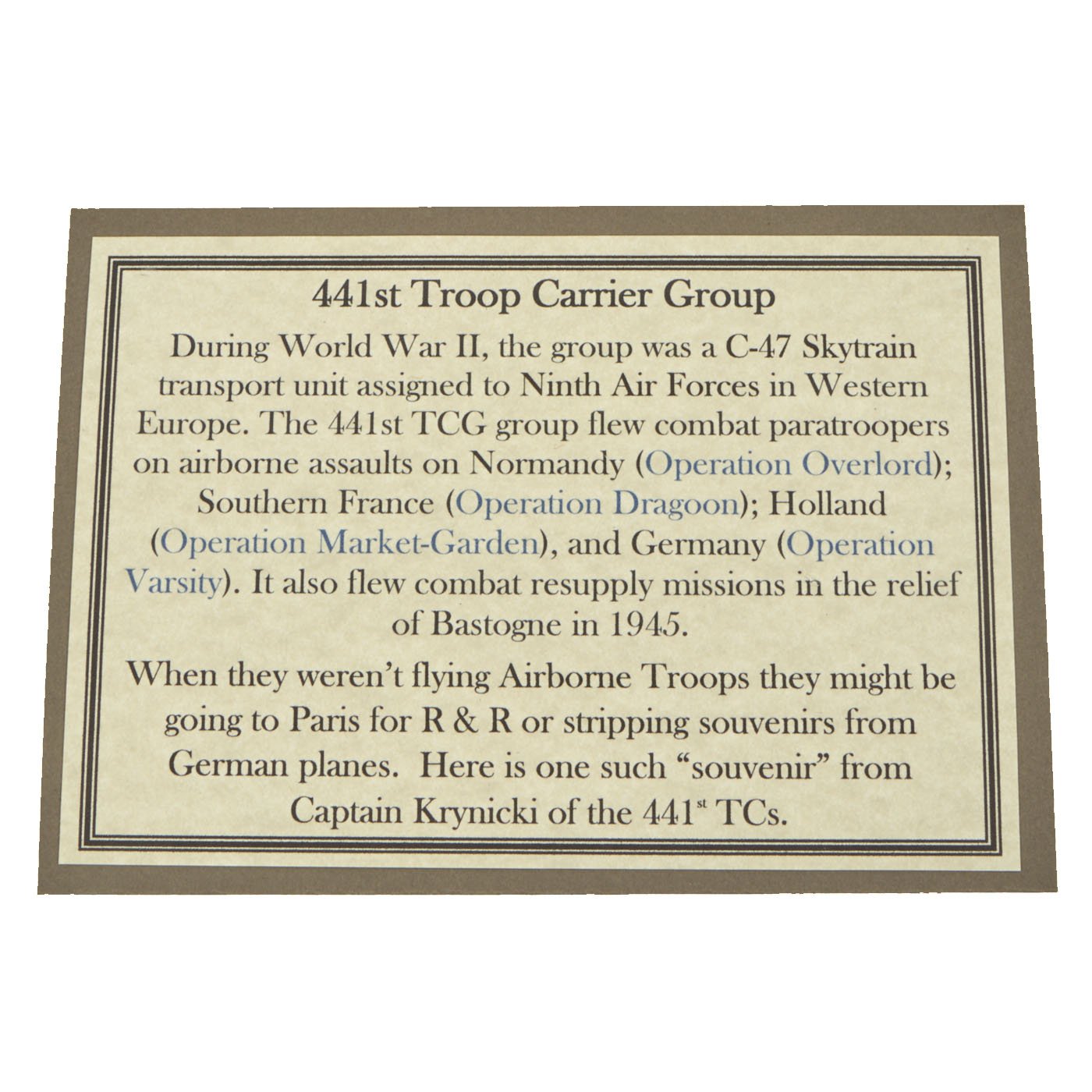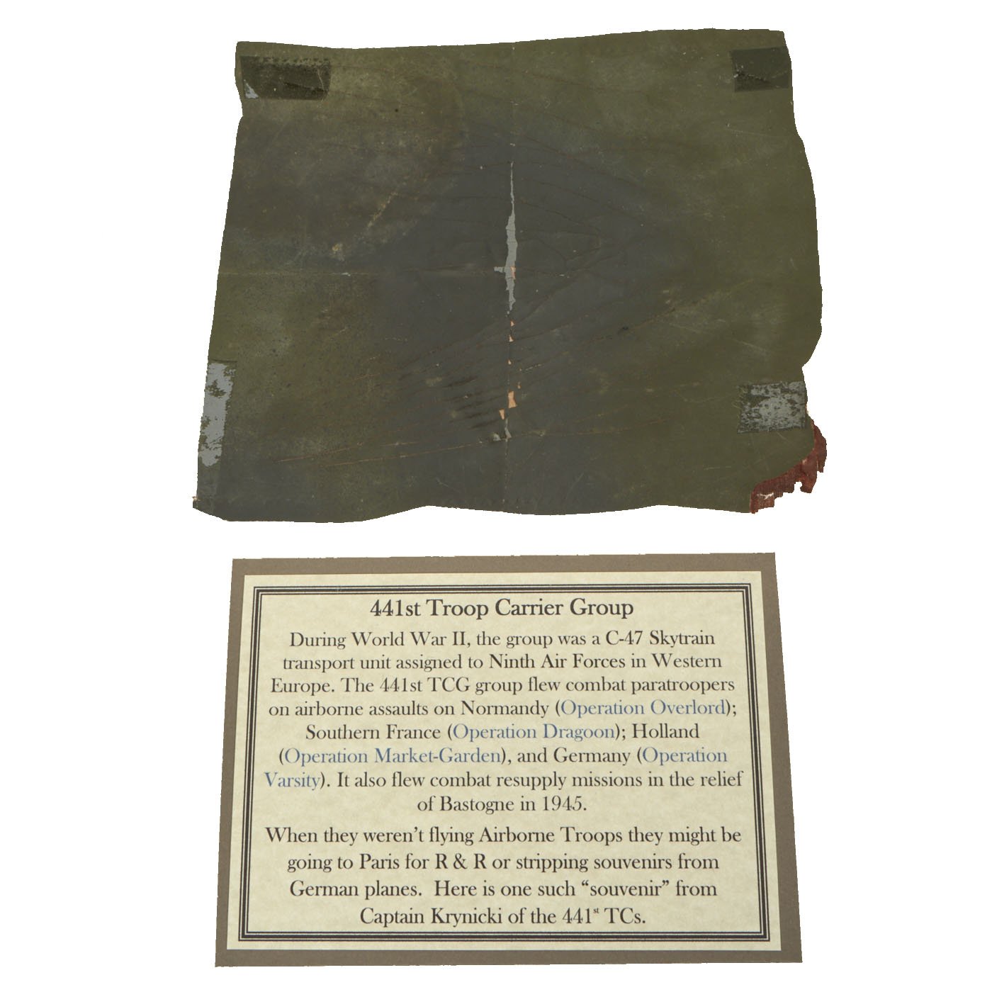 - Original Items: One-of-a-kind set. This collection features a 9 inch by 8 inch piece of painted canvas piece most likely from the skin of a Storch, even though someone erroneously wrote JU88 on the back. Also included are two small photos of wrecked Junkers Ju 88 with handwriting on the reverse. Additionally there is a document from the Headquarter of the 441st Troop Carrier Group data June 24, 1945 concerning a Captain Joseph F. Krynicki and his trip to Paris. All this material was originally attained from Captain Joseph F. Krynicki's estate.