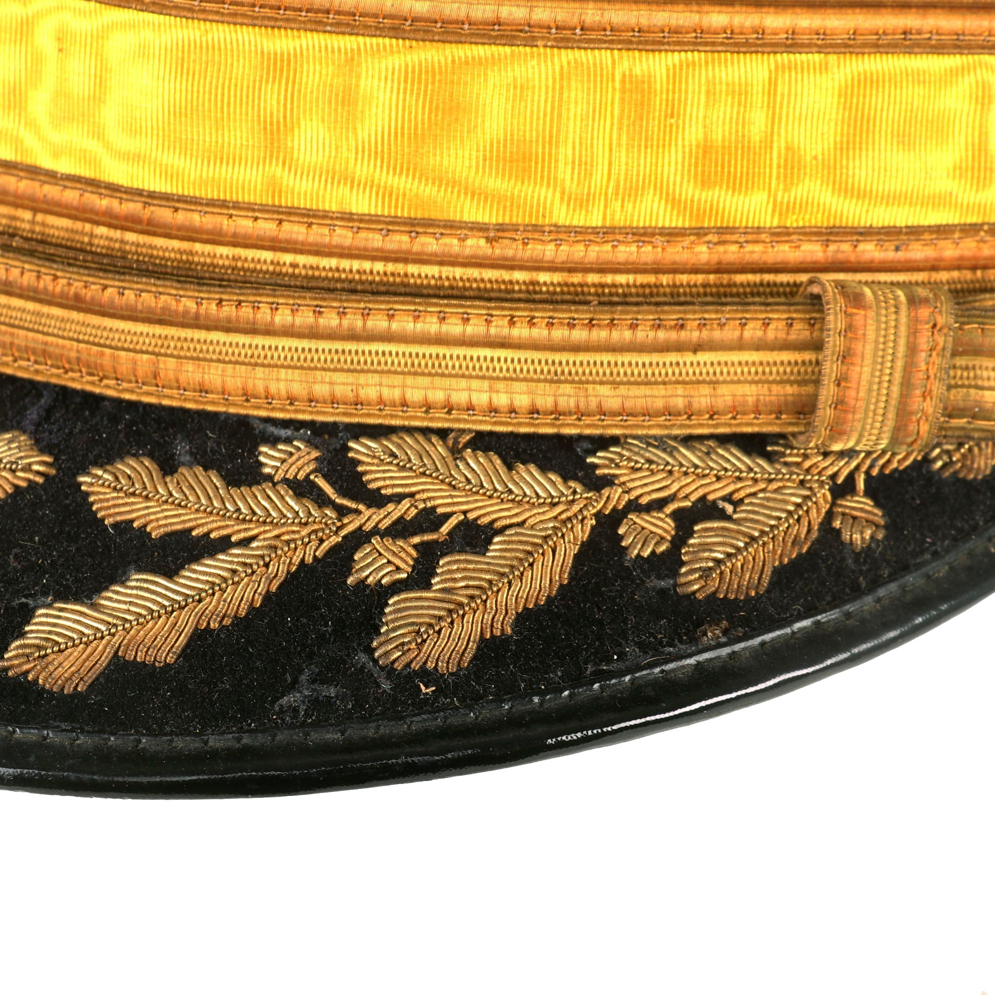 The cap is gorgeously constructed, featuring a patent leather covered visor with hand embroidered acorns & leaves. There is a yellow band around the cap indicating the wearer as an officer of Cavalry. The interior of the cap features its original plastic sweat protector with an original maker’s tag reading: