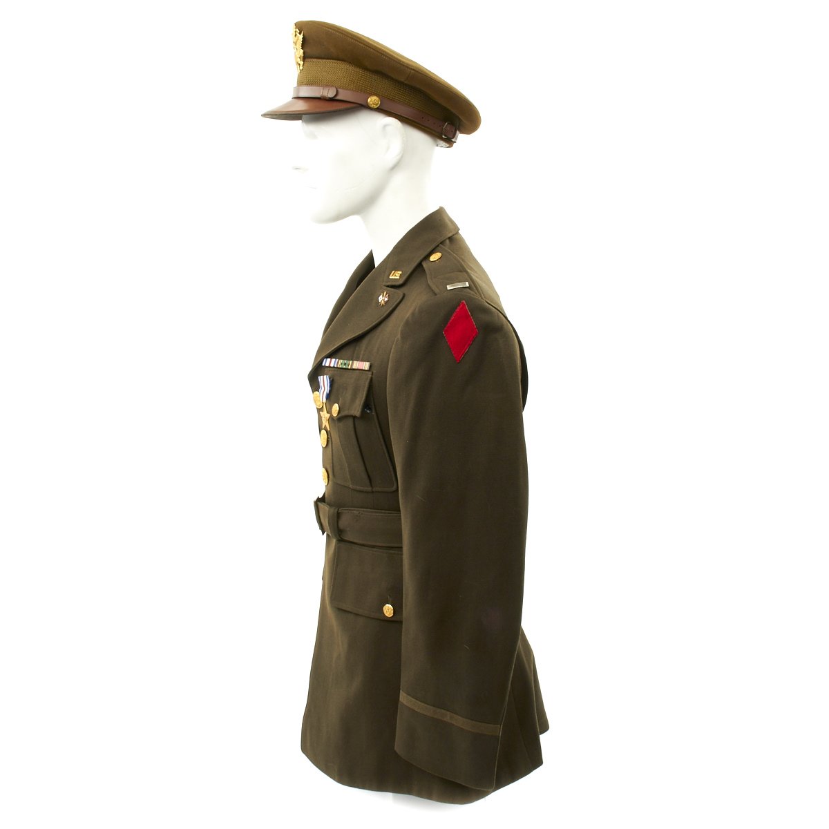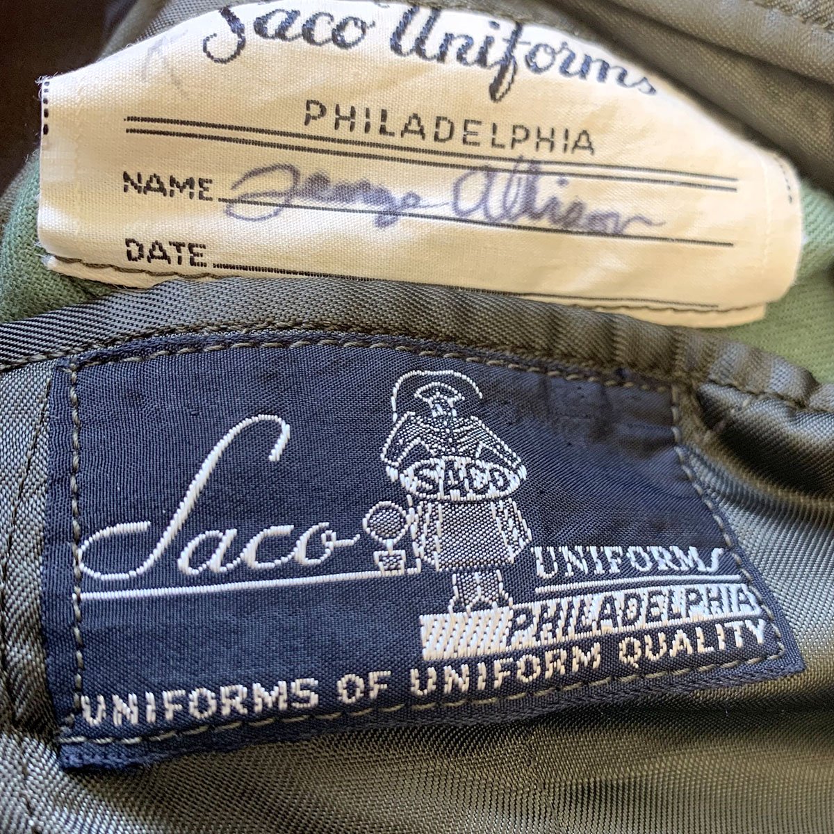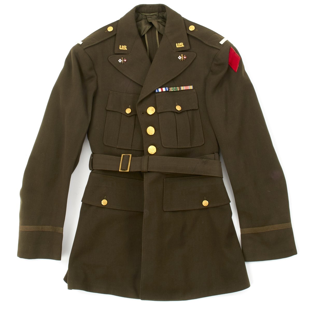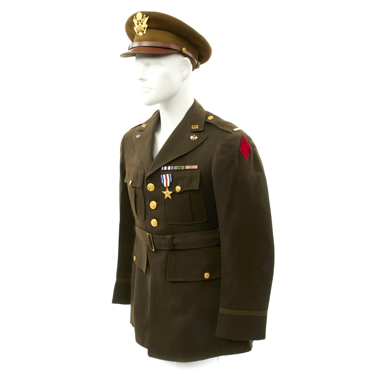 - Original Class A Uniform Jacket in excellent condition which is named on the interior tailor label to George Allison. Features medal ribbons that include: Silver Star, European-African Middle East Campaign with 3 battle stars, WWII Victory Medal. The epaulets have Sterling Silver Lieutenant bars and Enamel Signal Corps Distinctive Unit Insignias. Left sleeve has 5th Infantry Division red diamond insignia to shoulder. The original tailor label is by SACO of Philadelphia.