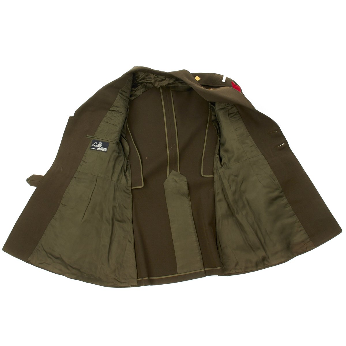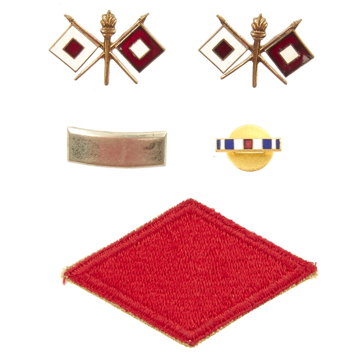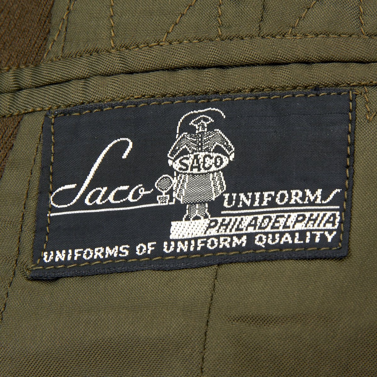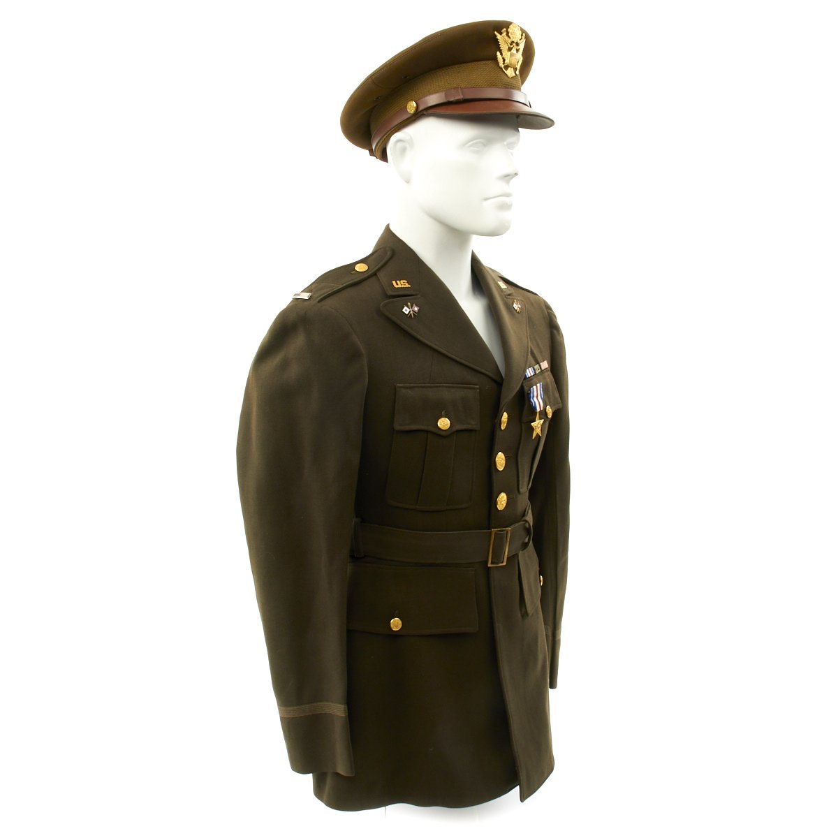 - Original Class A Uniform Jacket in excellent condition which is named on the interior tailor label to George Allison. Features medal ribbons that include: Silver Star, European-African Middle East Campaign with 3 battle stars, WWII Victory Medal. The epaulets have Sterling Silver Lieutenant bars and Enamel Signal Corps Distinctive Unit Insignias. Left sleeve has 5th Infantry Division red diamond insignia to shoulder. The original tailor label is by SACO of Philadelphia.