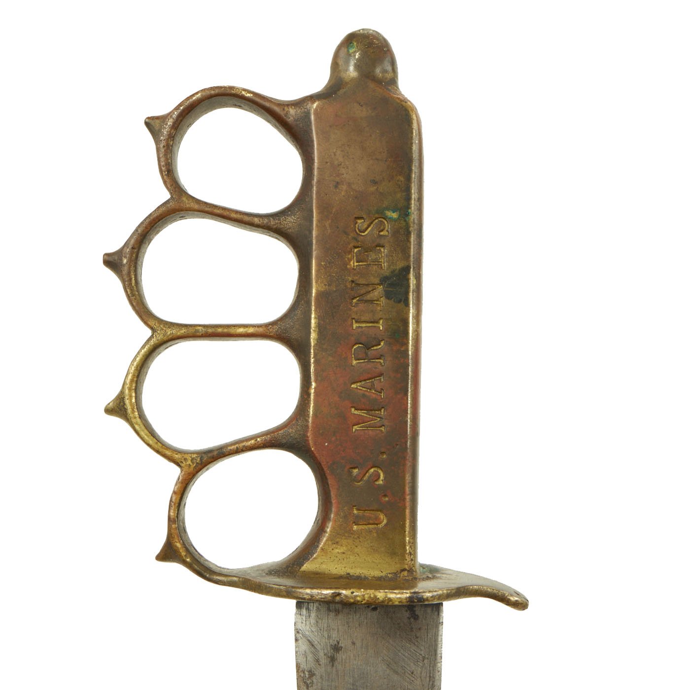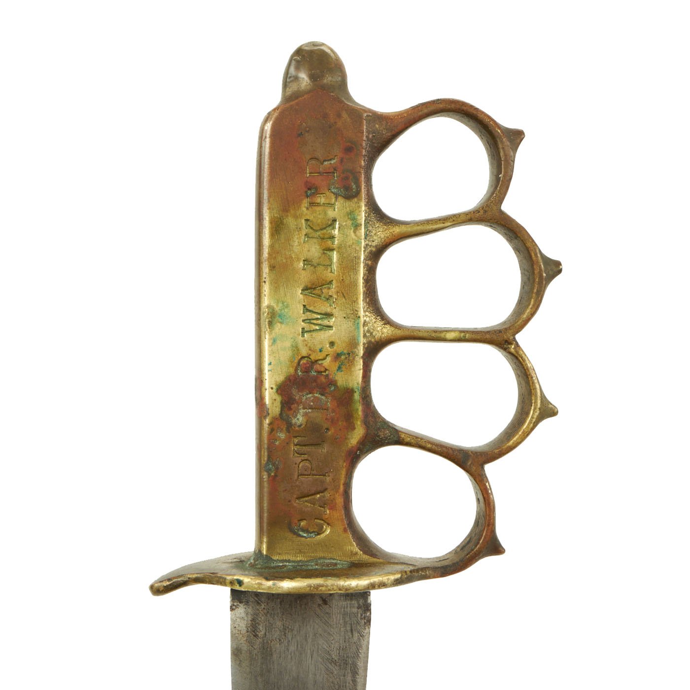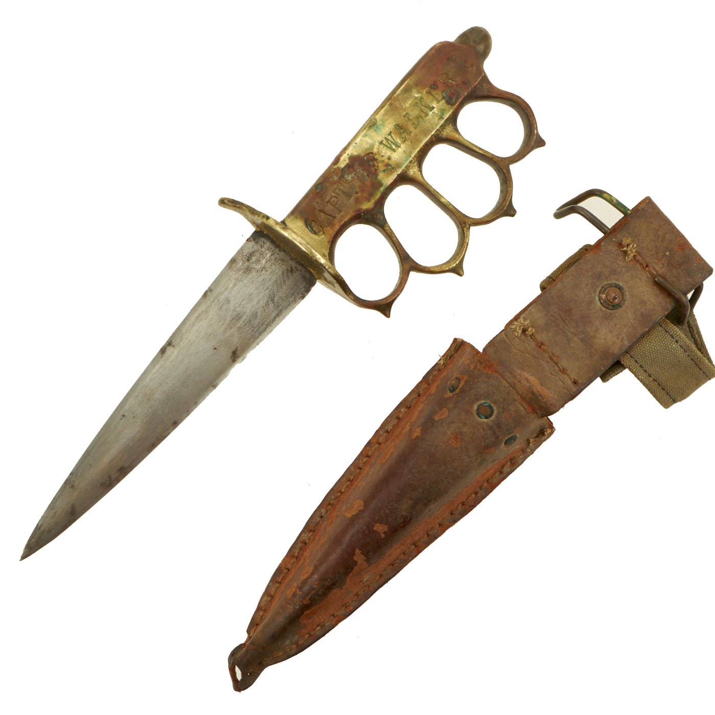 The Knife was made utilizing the grip and skull crusher pommel cap from a WWI L.F.&C M-1918 Knuckle Knife, with a custom made thick spear point blade. This was often done since the original blade of the M-1918 was somewhat useless as a tool. It was a phenomenal fighting weapon, but otherwise a poor choice for any utilitarian means. During fabrication, the sides of the grip were ground down, and marked with U.S. MARINES on one side, and CAPT. D. R. WALKER on the other side, making this a fantastic item for further research!