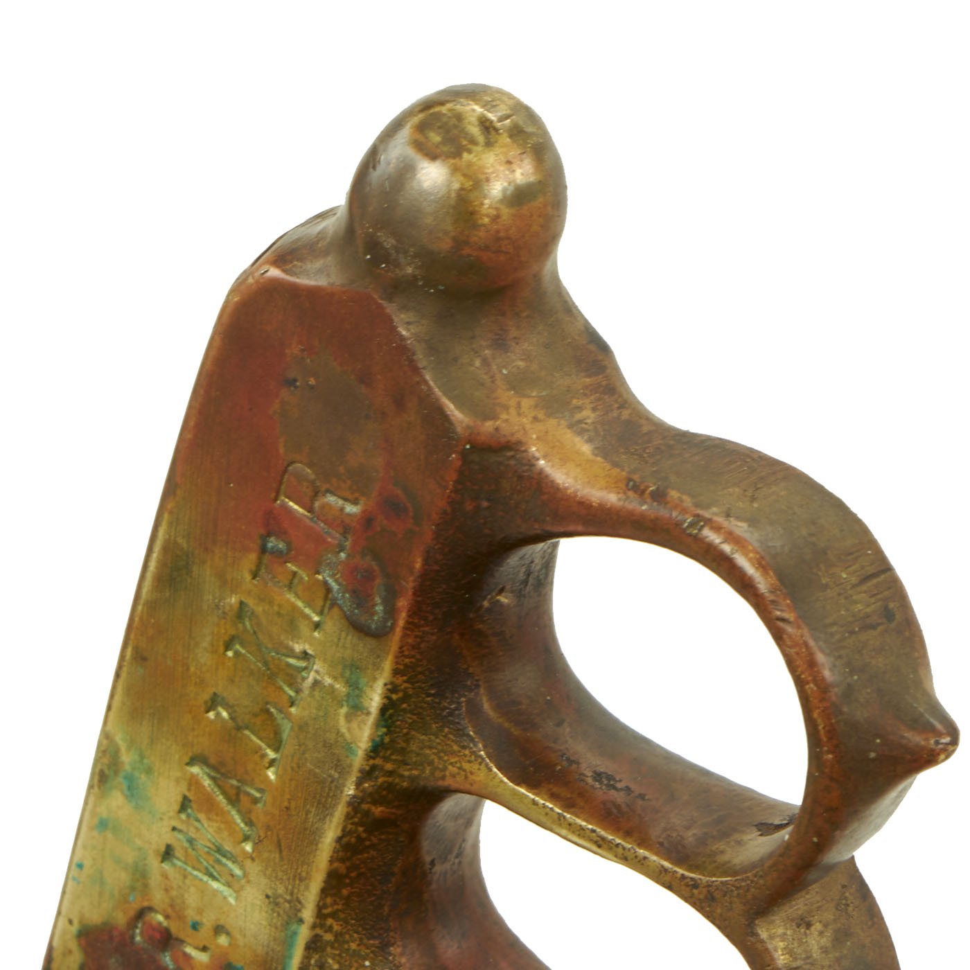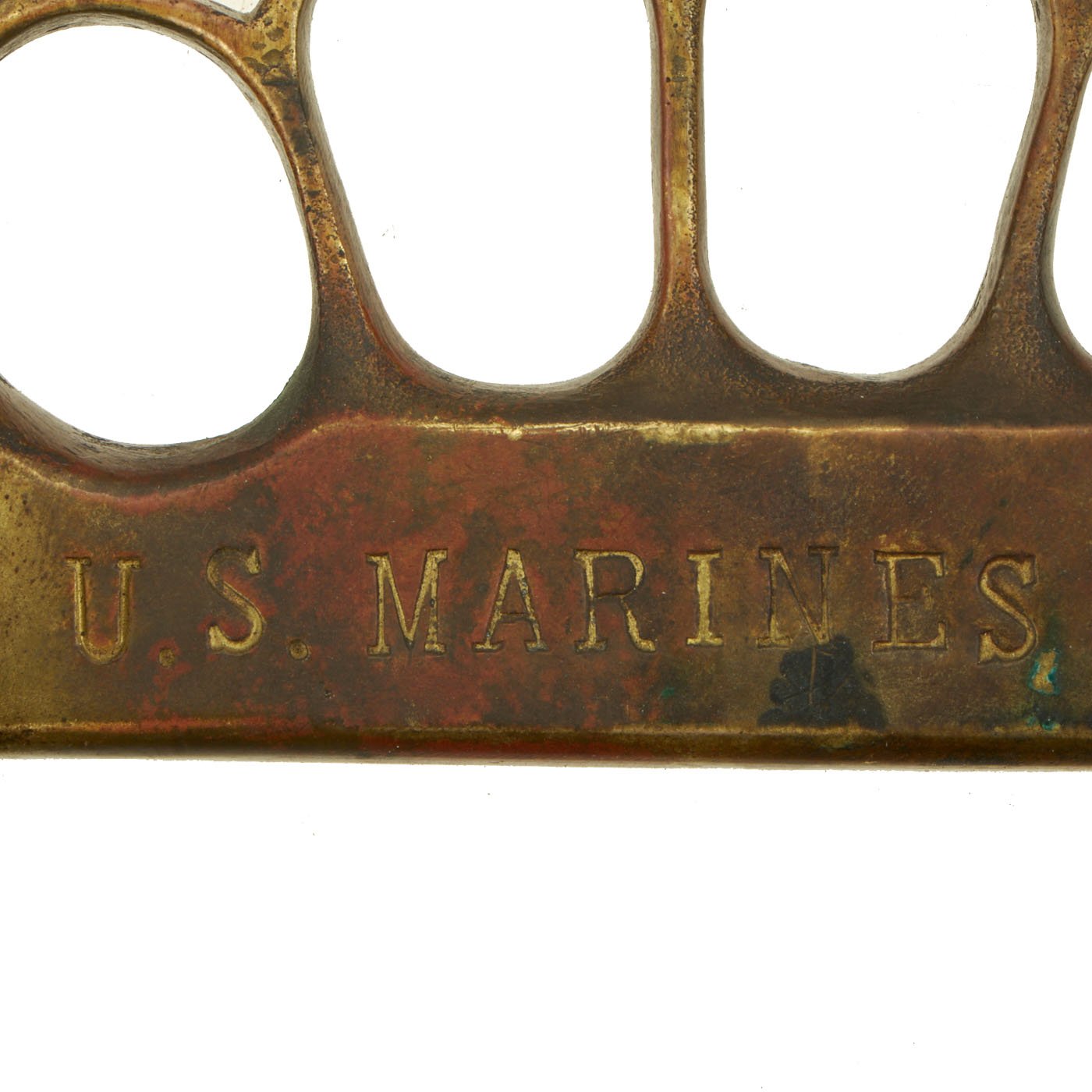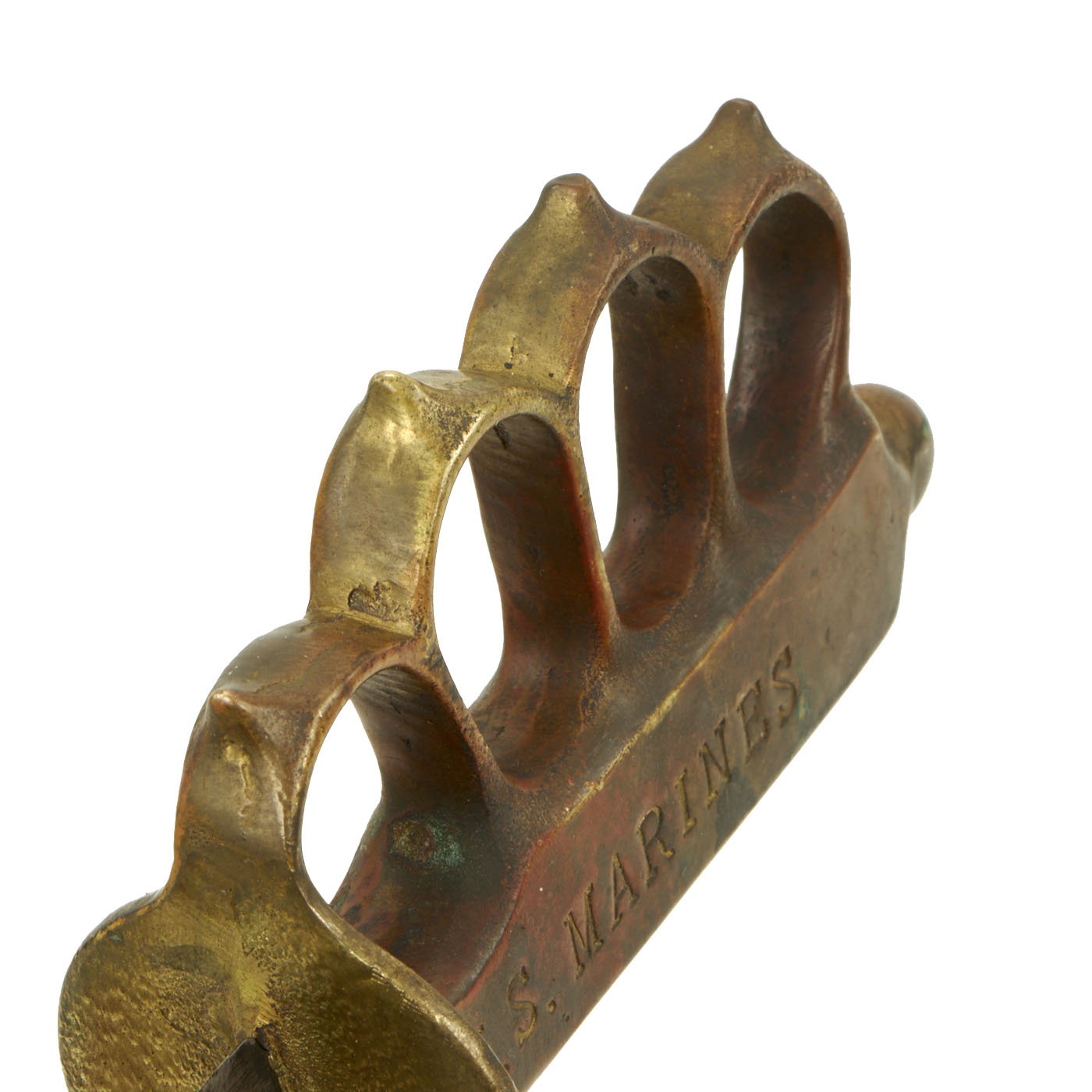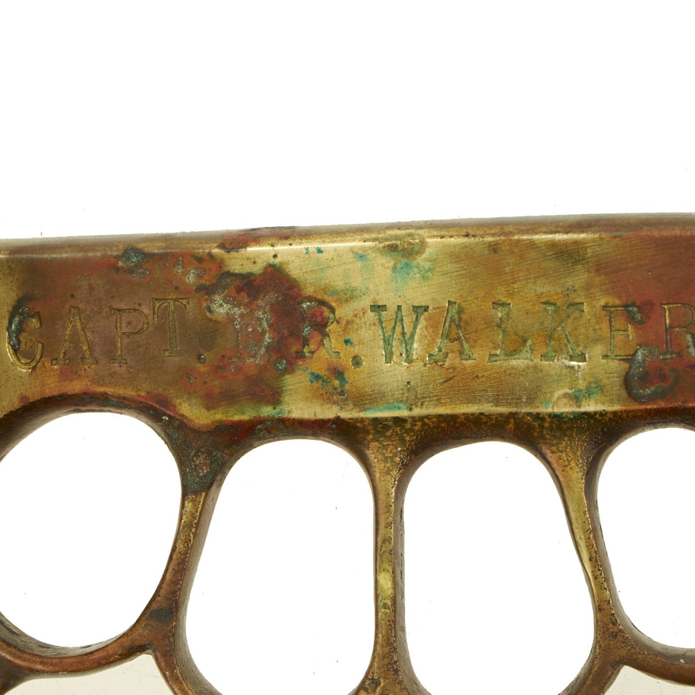 The Knife was made utilizing the grip and skull crusher pommel cap from a WWI L.F.&C M-1918 Knuckle Knife, with a custom made thick spear point blade. This was often done since the original blade of the M-1918 was somewhat useless as a tool. It was a phenomenal fighting weapon, but otherwise a poor choice for any utilitarian means. During fabrication, the sides of the grip were ground down, and marked with U.S. MARINES on one side, and CAPT. D. R. WALKER on the other side, making this a fantastic item for further research!