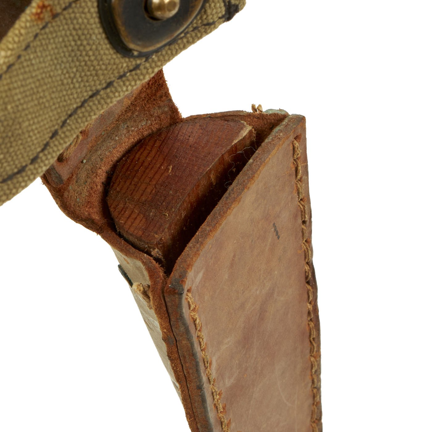 The custom leather scabbard is a very interesting design, using a wooden spacer inside to space the leather belt hook strap around the wide crossguard. It has a canvas retaining strap featuring a lift-the-dot snap, and also has a very nice brass belt clip at the top. Condition is very good, with the leather a bit dry due to age.