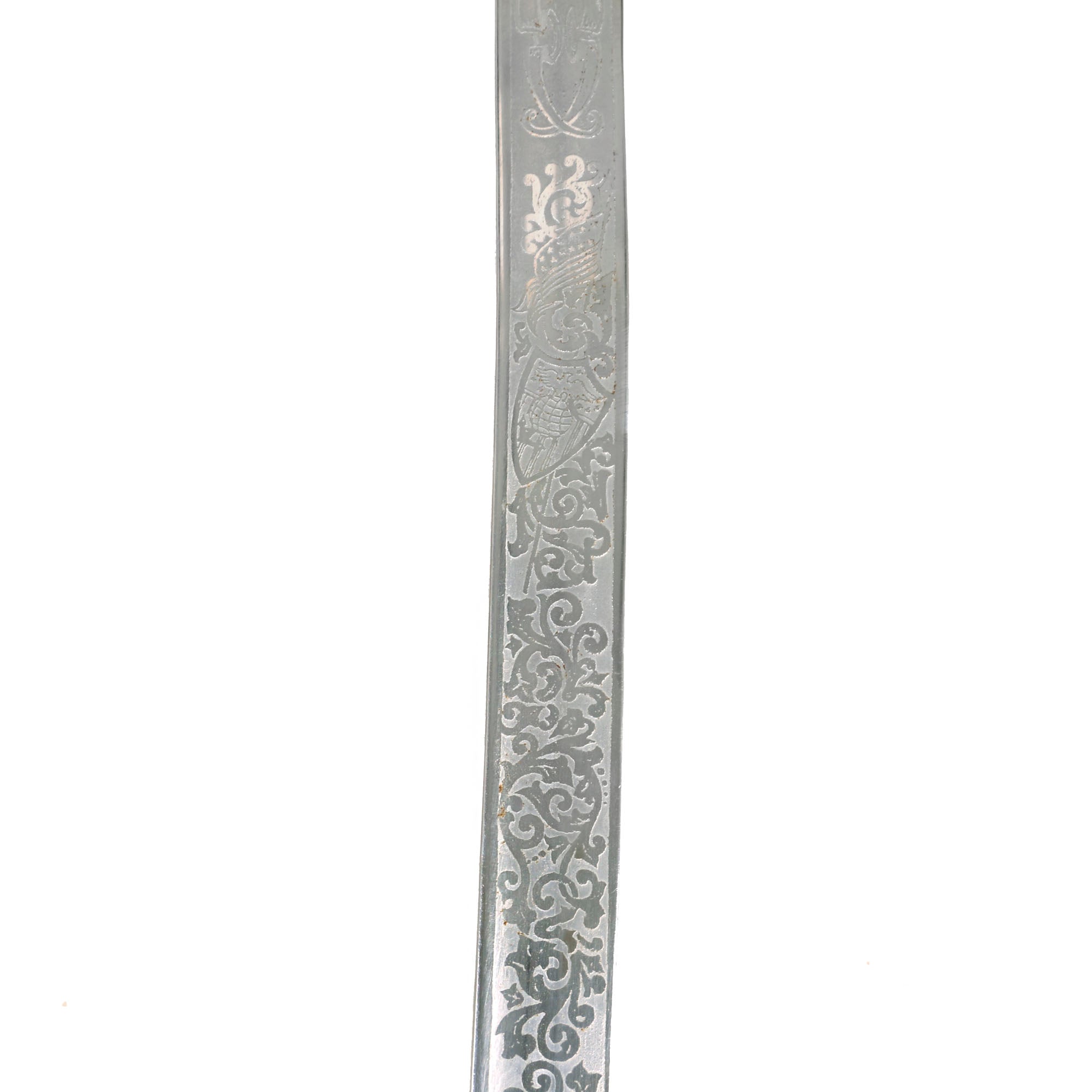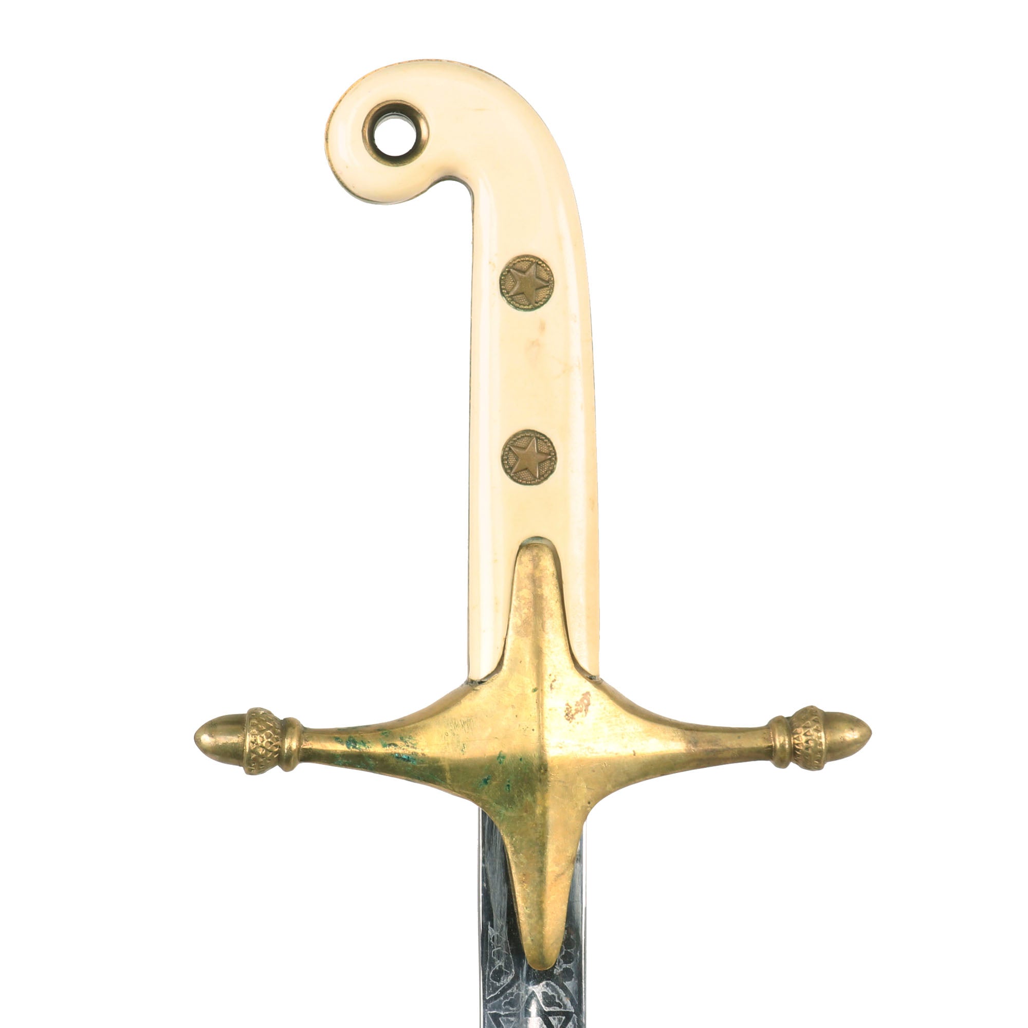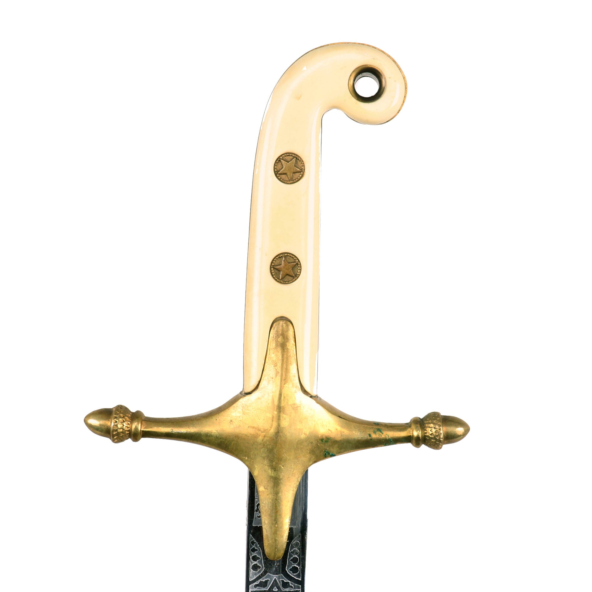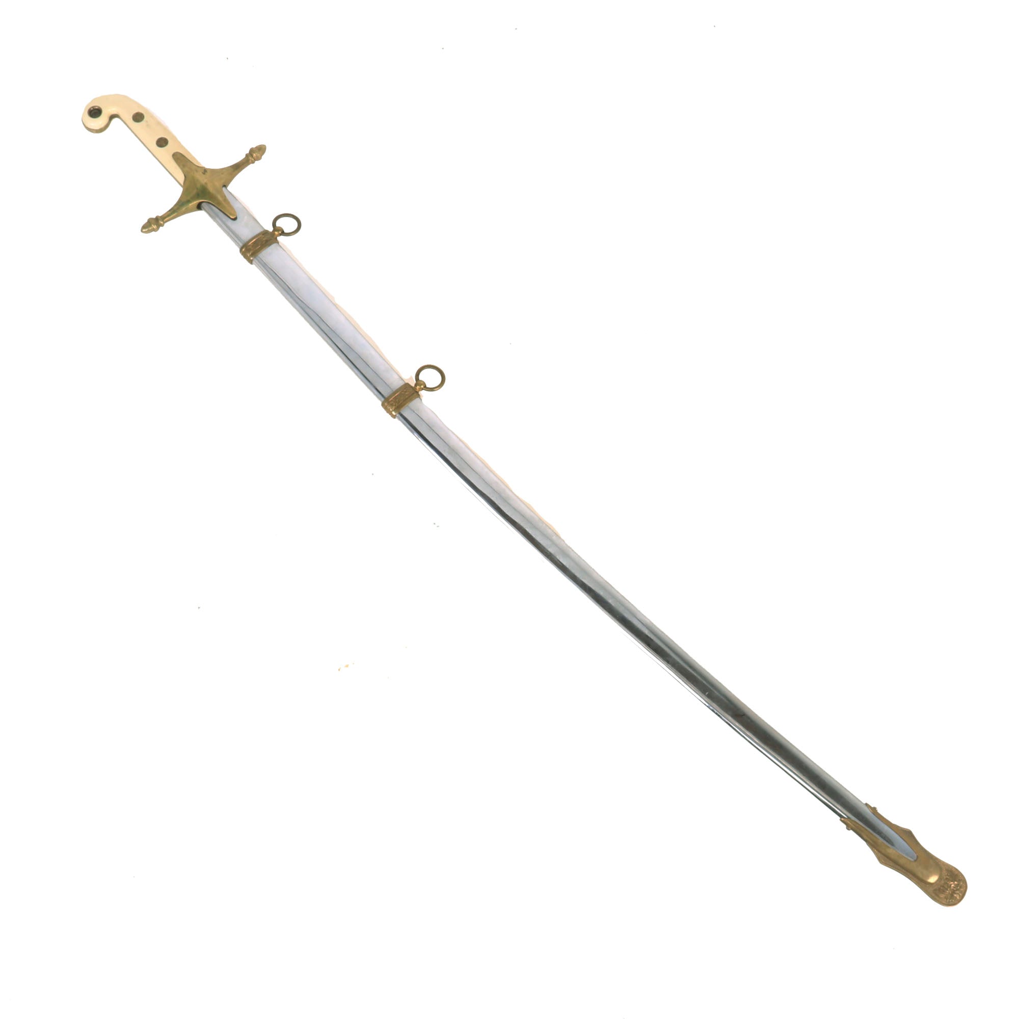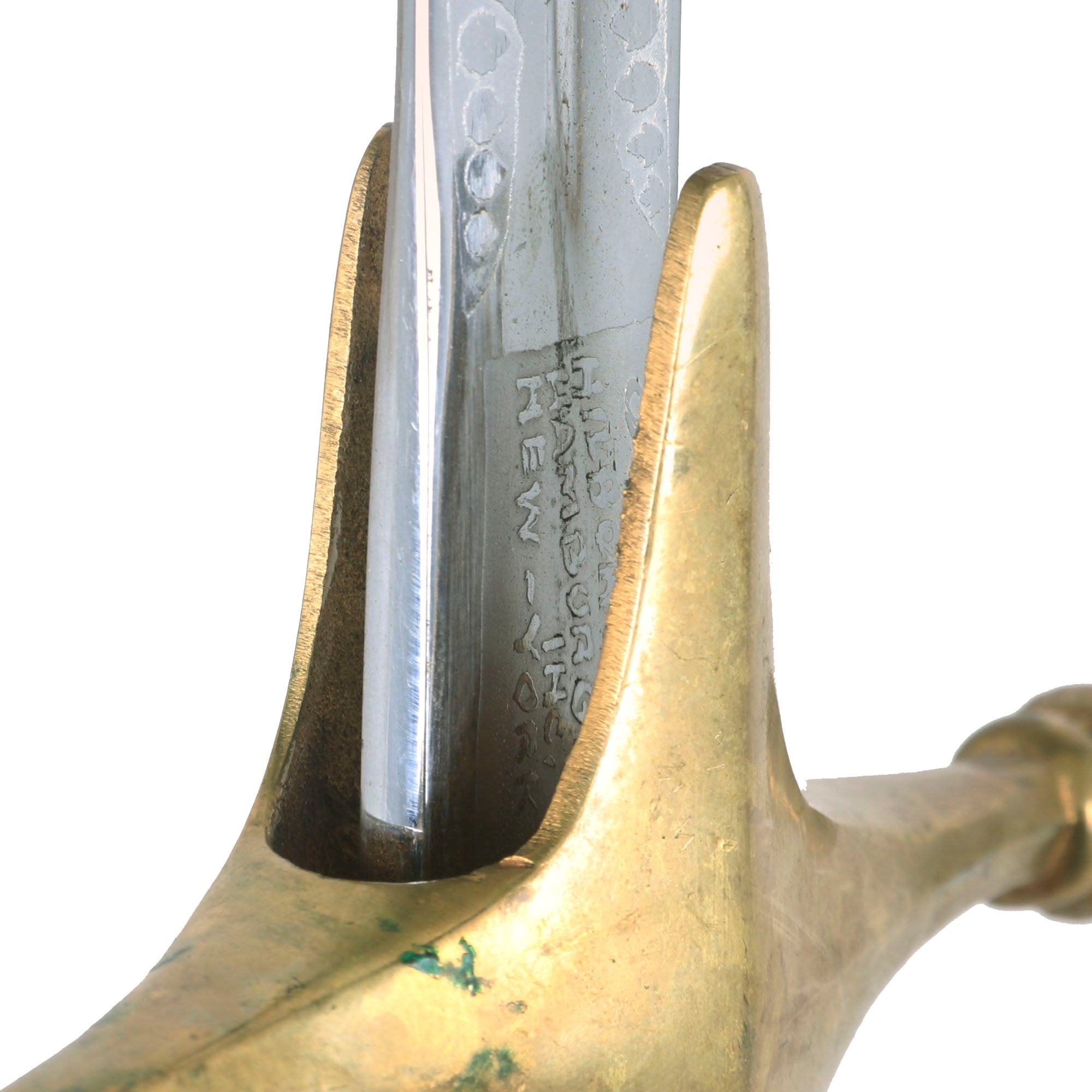 The brass guard with double langets and acorn finials has strong traces of gilt, as do the two star-embossed rivet caps on either side of the bone grip. The hole for the sword knot in the pommel retains both of its brass washers. The scabbard is the regulation pattern: nickel plated with narrow brass throat, rings and ring bands, the latter cast with a leaf design. The brass shoe-style drag has a raised rose blossom and leaves on either side of the blade. There is some gilt on the throat and drag, but the brass has mostly a medium, aged patina.