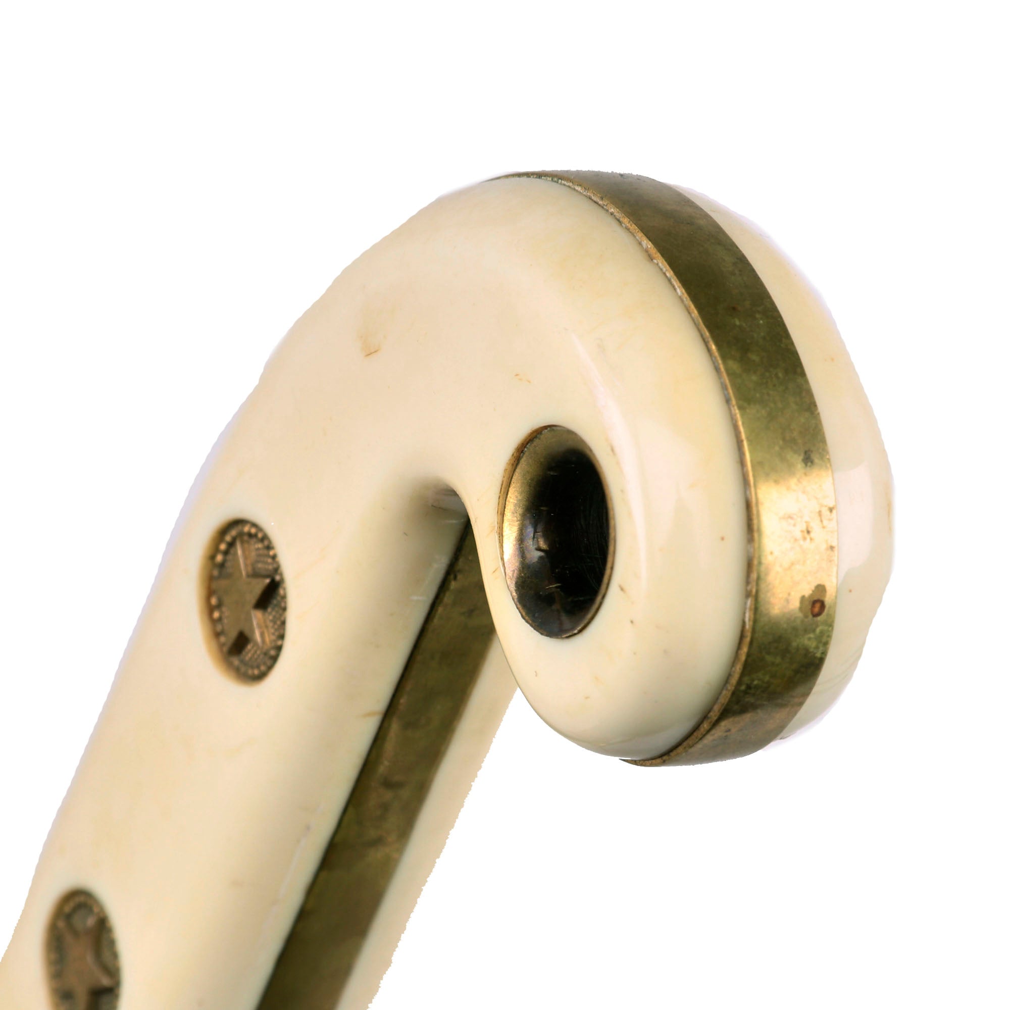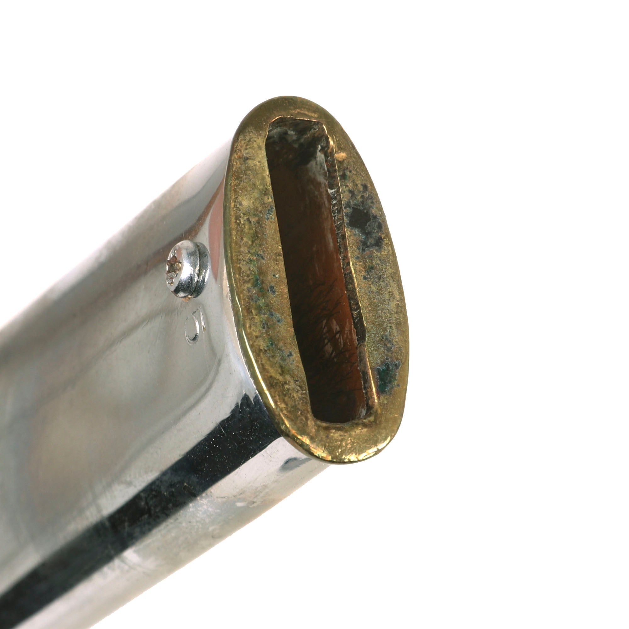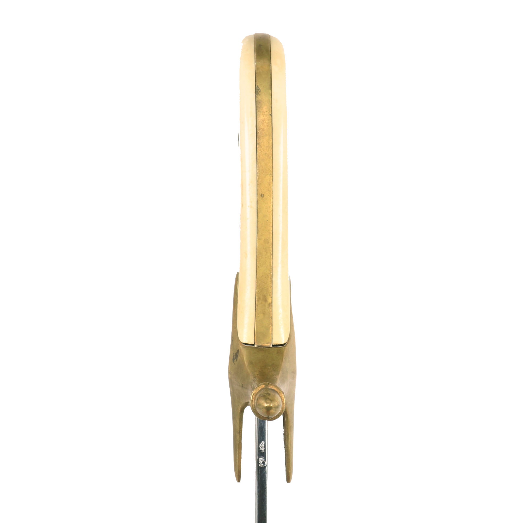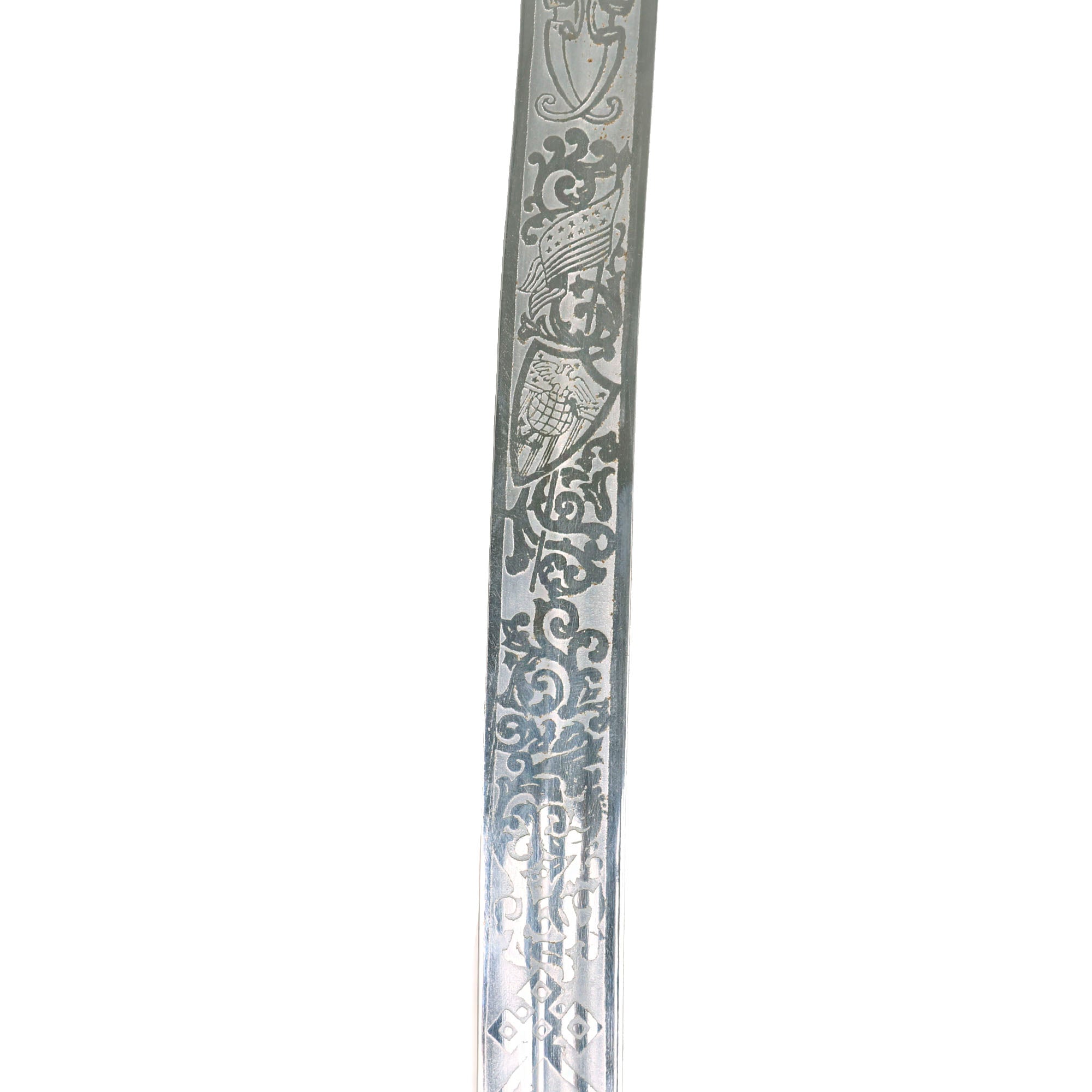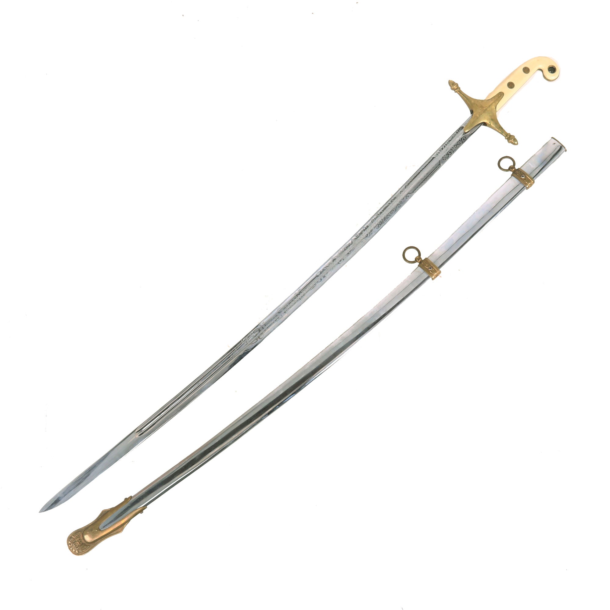 The brass guard with double langets and acorn finials has strong traces of gilt, as do the two star-embossed rivet caps on either side of the bone grip. The hole for the sword knot in the pommel retains both of its brass washers. The scabbard is the regulation pattern: nickel plated with narrow brass throat, rings and ring bands, the latter cast with a leaf design. The brass shoe-style drag has a raised rose blossom and leaves on either side of the blade. There is some gilt on the throat and drag, but the brass has mostly a medium, aged patina.