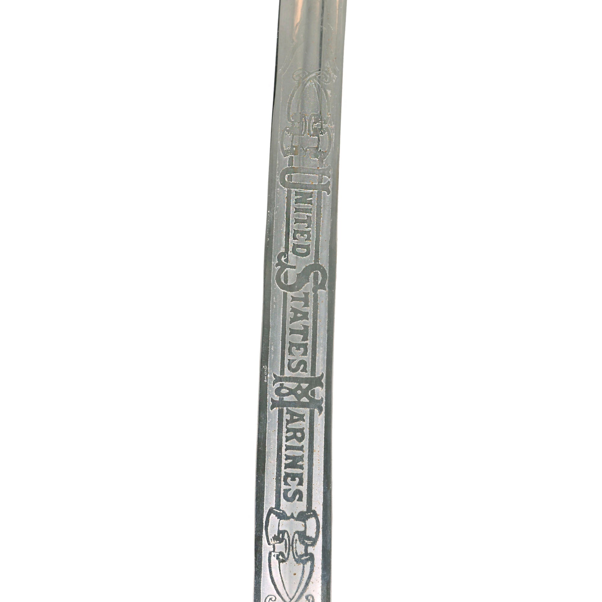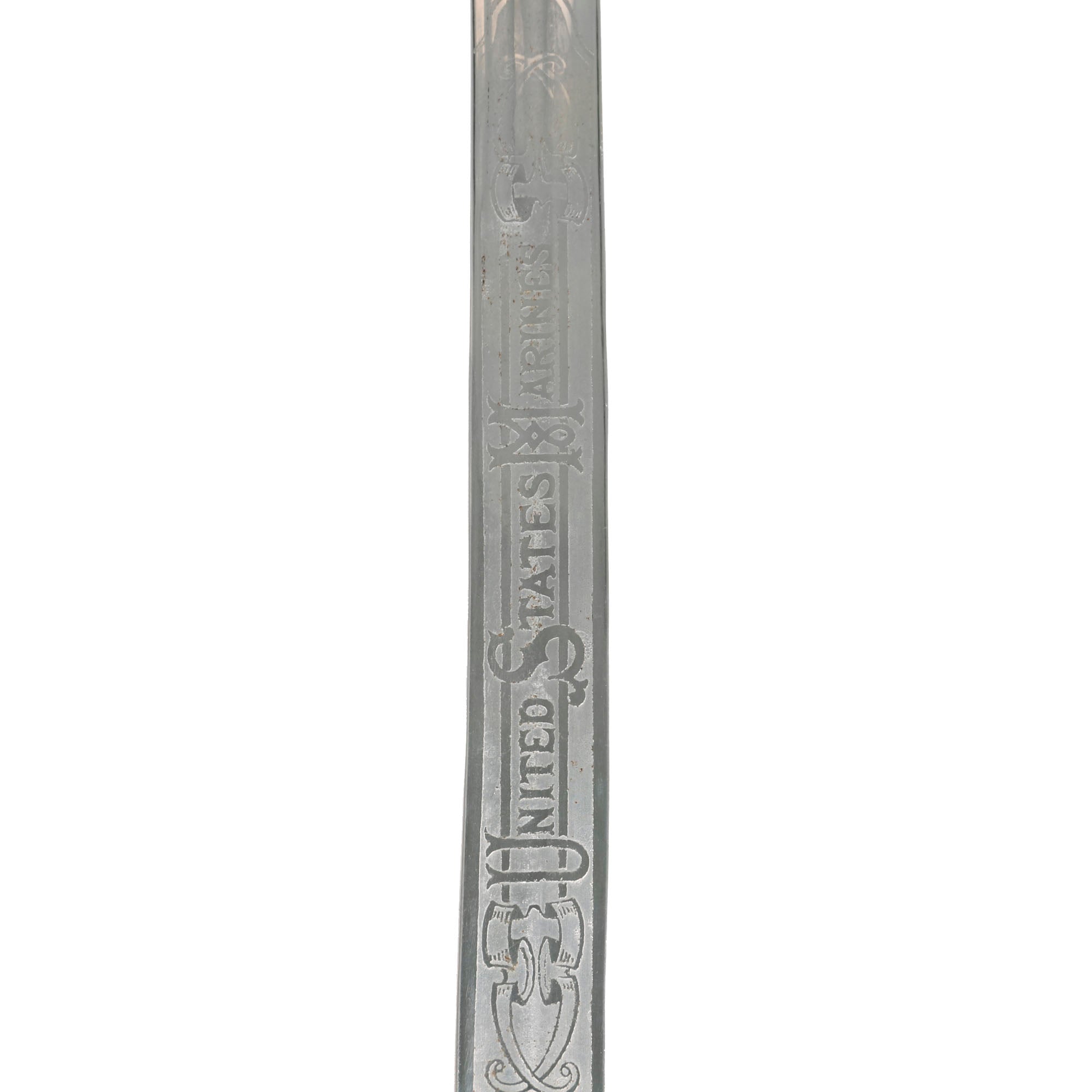 This is a gorgeous WWII example of a USMC Officer's Mameluke sword, complete with its original scabbard, in very good condition. The sword has developed a gorgeous patina over the years. The Mameluke sword is a very iconic edged weapon with roots in the Marine Corps going back 219 years to the First Barbary War. This example is etched on the blade with S. Lesko, for Lieutenant Colonel Stephen Lesko. This example was made by HILBURN HAMBURGER INC. in New York, as is marked on the ricasso under the rain chape, which makes it difficult to photograph.