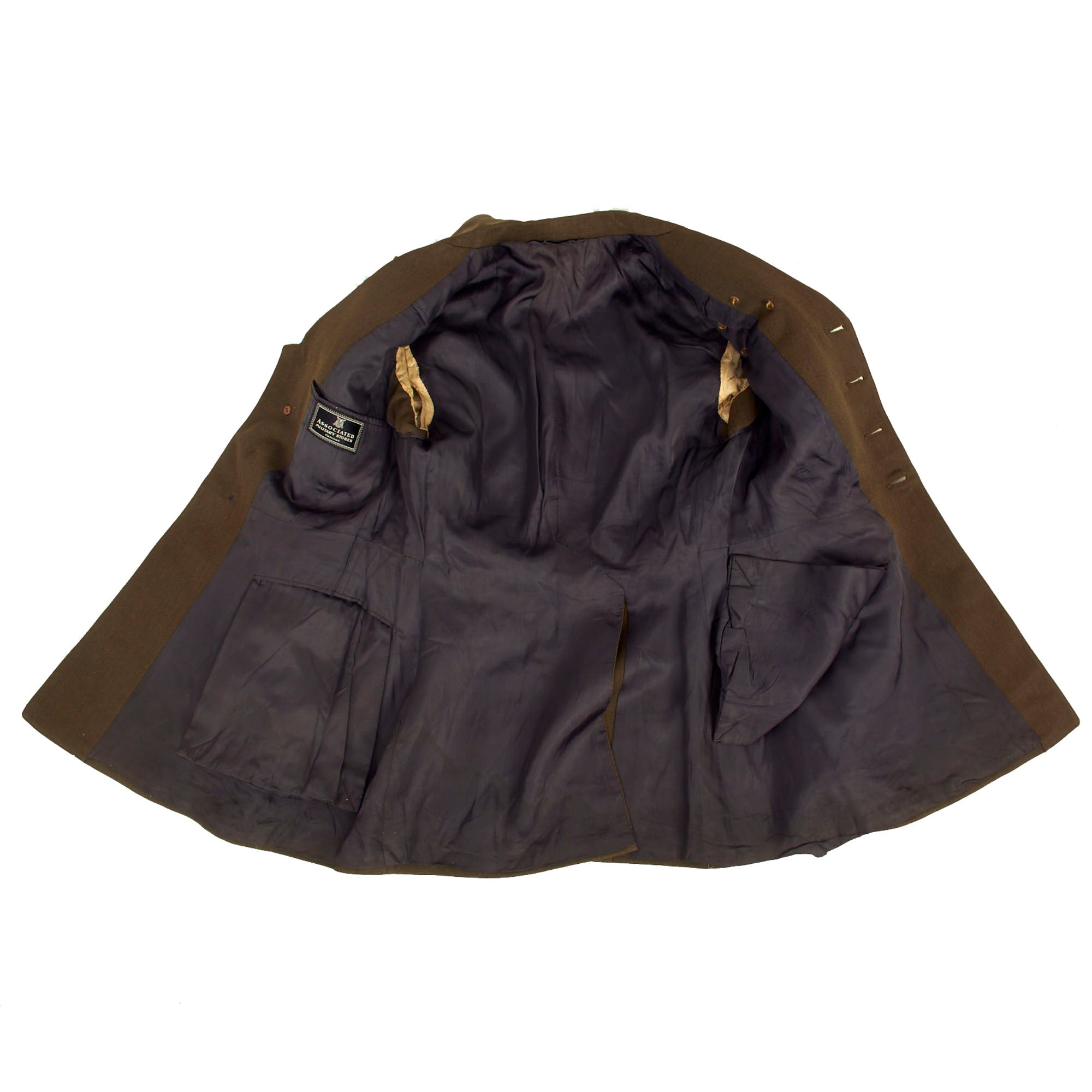 The uniform set includes a wonderful US Army Officer’s Class A uniform coat which features gorgeous British made bullion insignia. The left shoulder has a lovely blue felt and bullion embroidered 15th Army Air Force insignia with gold bullion embroidered Major’s oak leaves on the shoulder straps. Other insignia featured are the standard US and Caduceus insignia on the collars, Flight Surgeon’s wings on the left breast with a multiple ribbons beneath. The lower left sleeve has 3 overseas bars denoting 18 months of service overseas. The inside left pocket has his name written on the tag with a date as Lt. G.W. Hubert 1941.