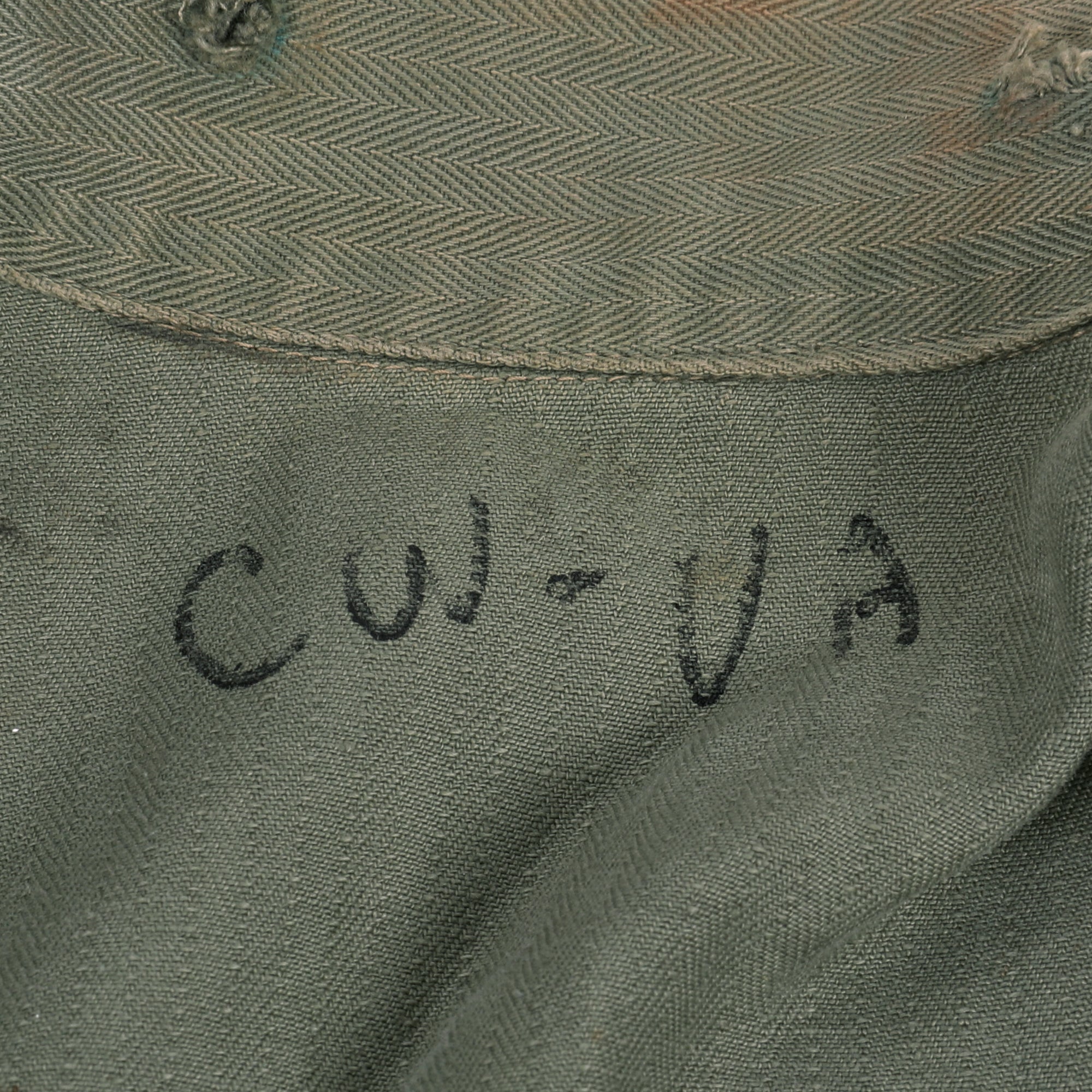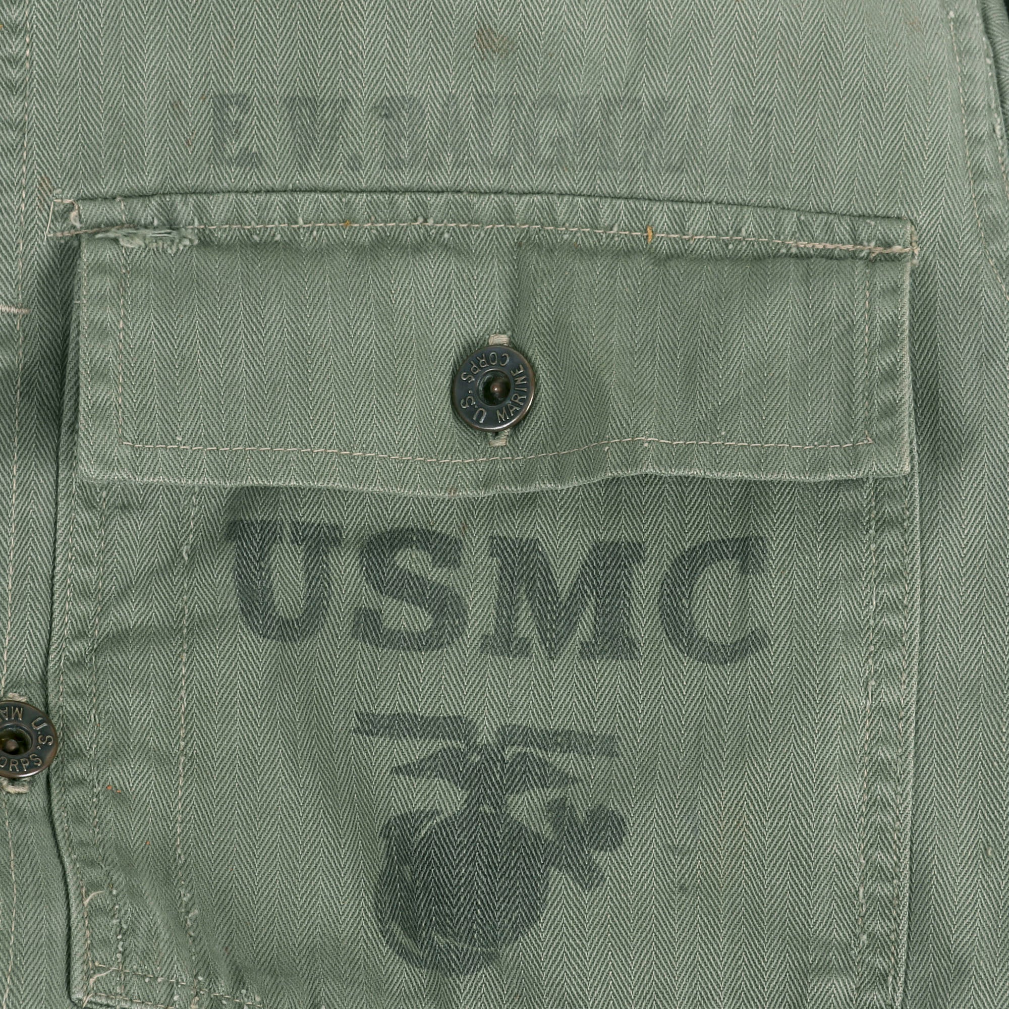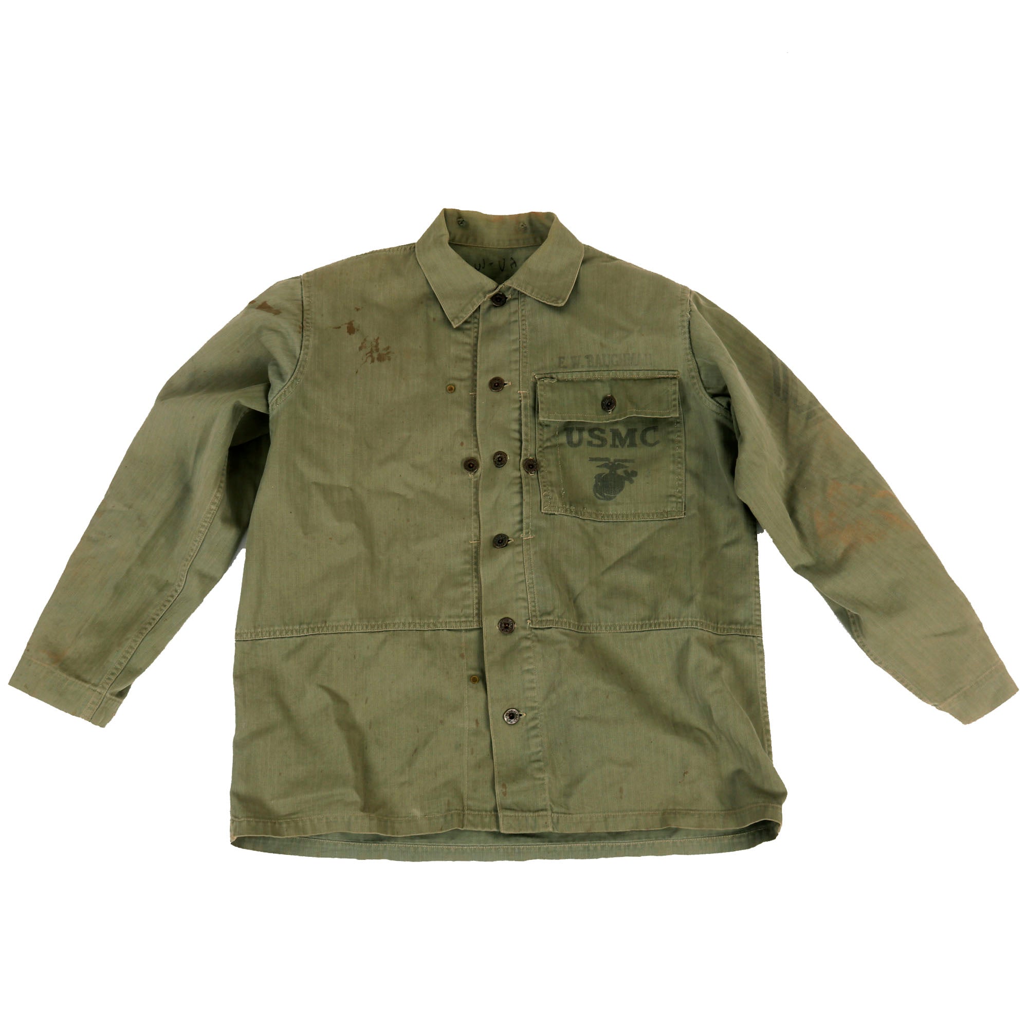 • One size 44" WW2 USMC US Marine Corps P41 USMC Combat Uniform Field Utility Jacket in Olive Drab. These loose fitting sage green herringbone twill (HBT) cotton jackets feature, original “doughnut hole” USMC buttons (all buttons present), gas flap, chest pocket with flap, internal breast pocket, and a CRISP stenciled black USMC EGA insignia. The jacket is named E.W. BAUGHMAN, for Earl W. Baughman, who served in the Navy during World War II and in the Marine Corps during the Korean War. We cannot find much about his service, making for a great research project.